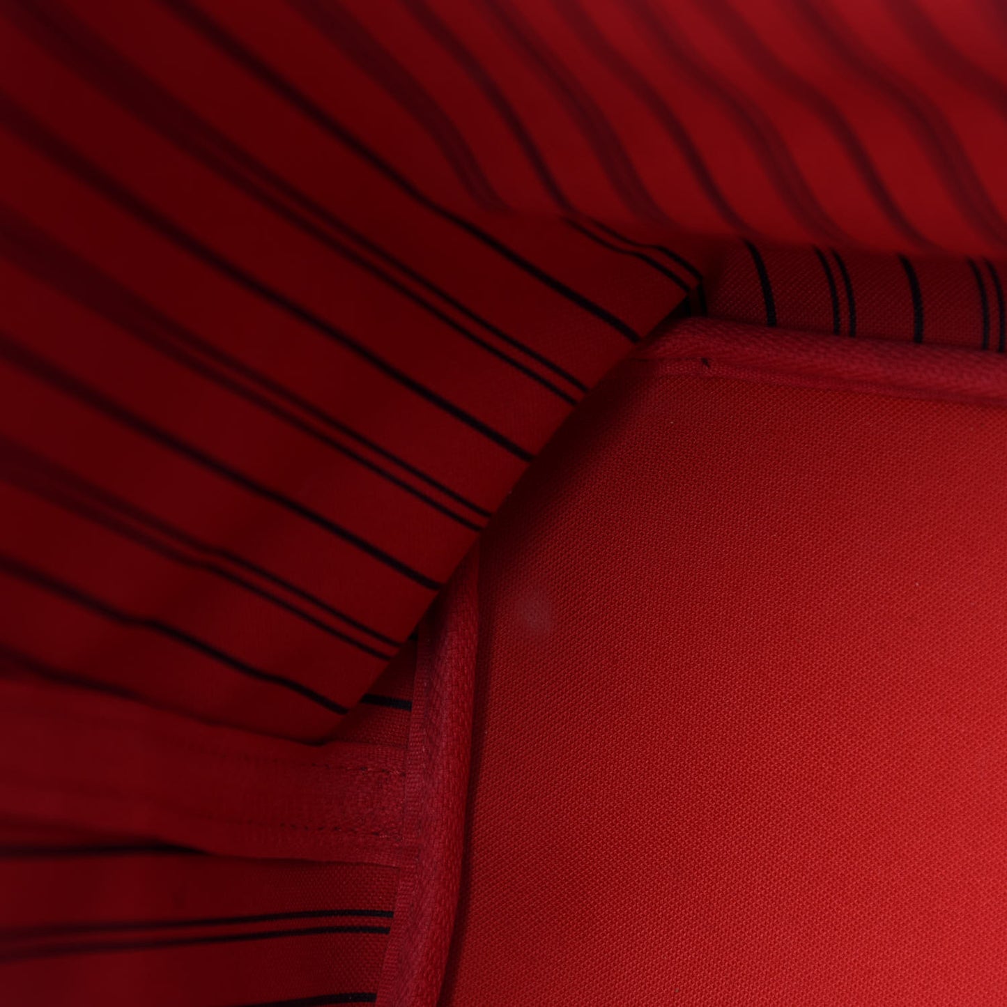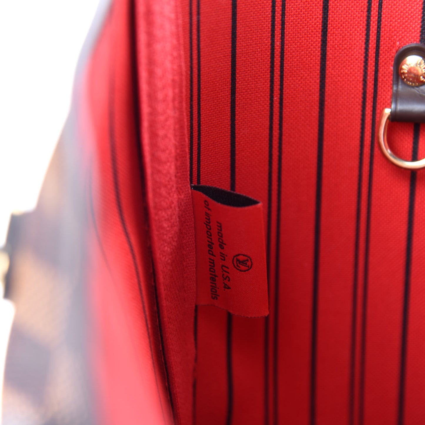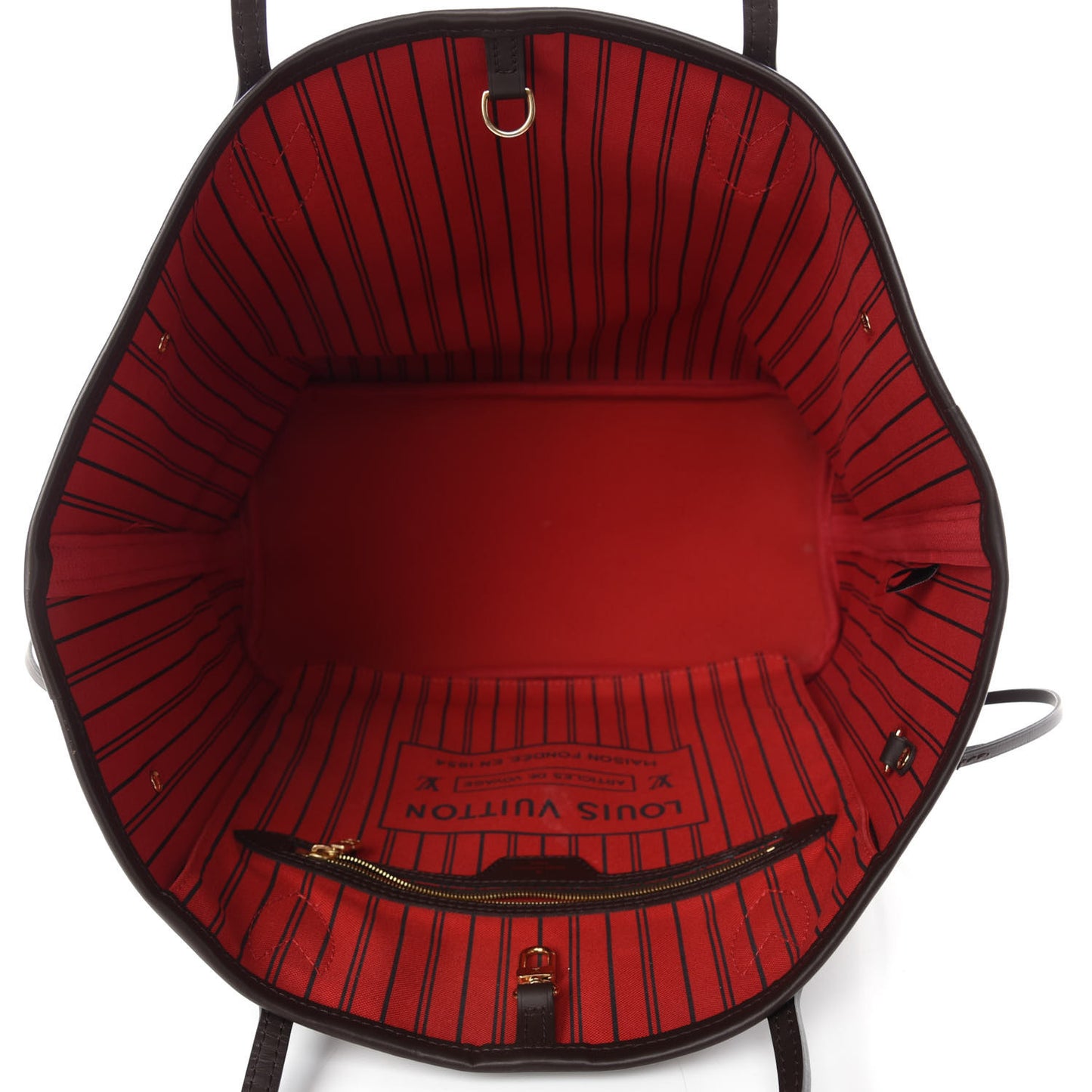 This is an authentic LOUIS VUITTON Damier Ebene Neo Neverfull MM. This chic handbag is crafted of classic Louis Vuitton damier checkered canvas with dark brown cowhide leather shoulder straps and trim. This shoulder bag features polished brass hardware and opens to an interior of rouge red striped fabric with a hanging zipper pocket.