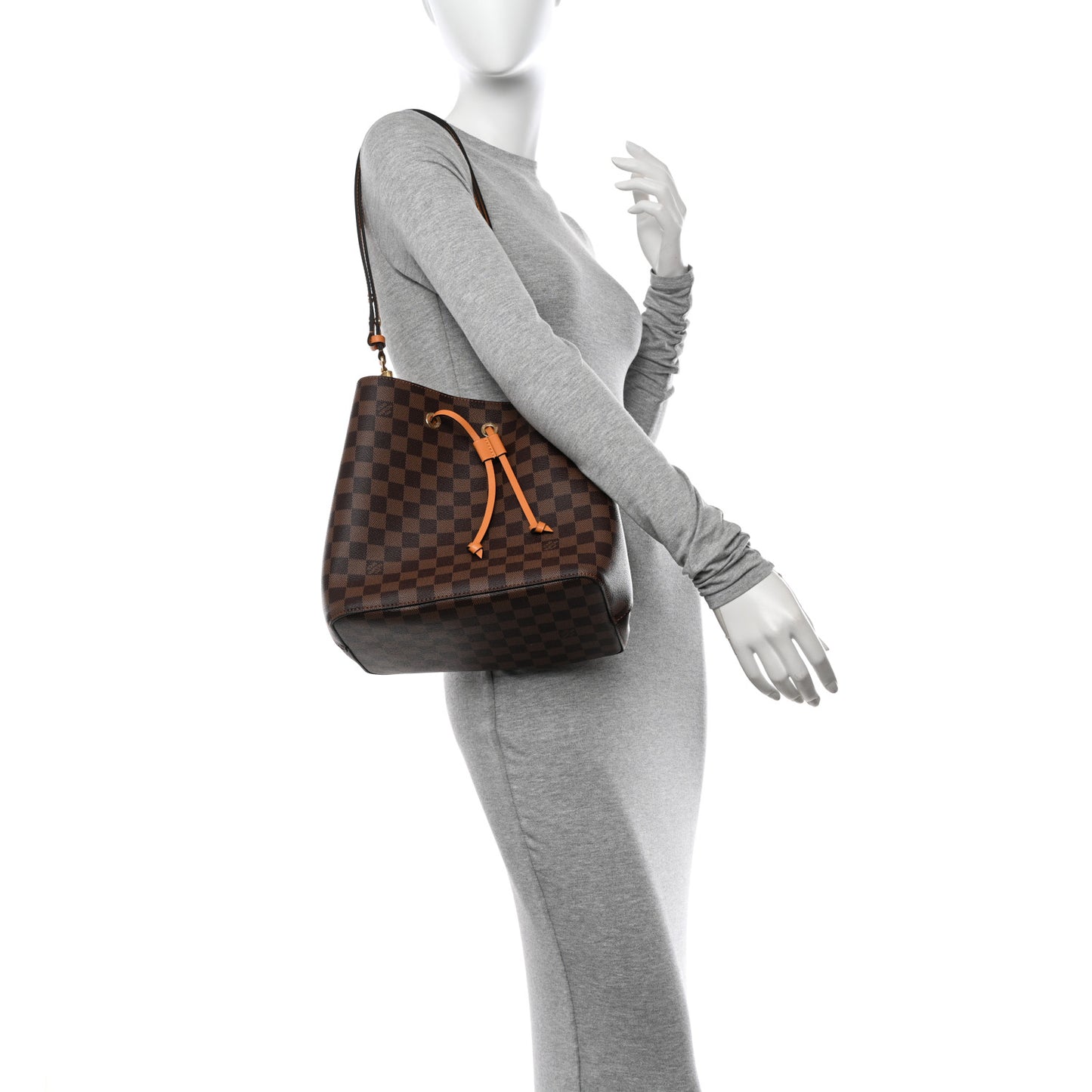 This is an authentic LOUIS VUITTON Damier Ebene Neonoe MM in Safran. This classic bucket bag is crafted of Louis Vuitton checkerboard coated canvas in brown. The bag features a saffron orange adjustable shoulder strap and top cinch cord with gold-toned hardware. This opens to a matching saffron microfiber interior with a center zipper pocket.Follow this item for alerts. Louis Vuitton is a registered trademark of Louis Vuitton. FASHIONPHILE is not affiliated with Louis Vuitton.