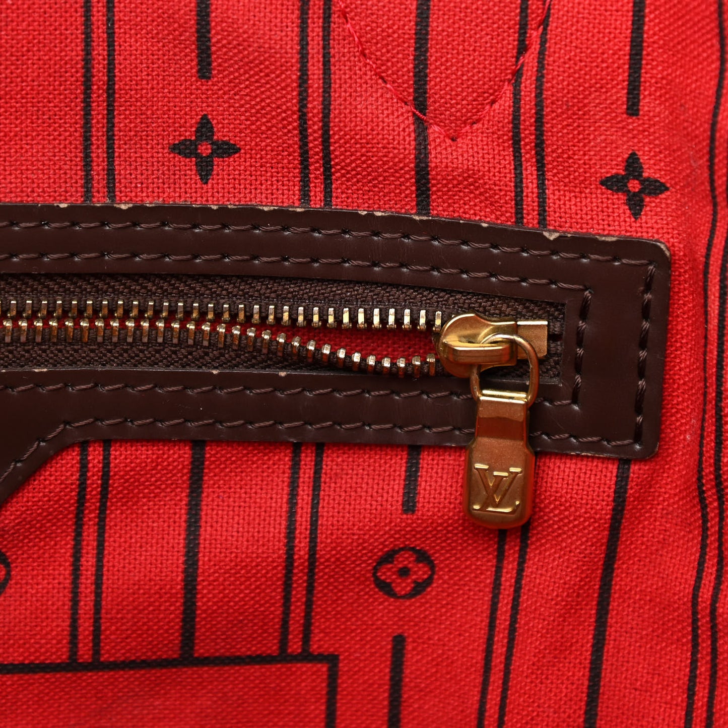 This is an authentic LOUIS VUITTON Damier Ebene Neverfull MM. This handbag is crafted of classic Louis Vuitton Damier checkered canvas with dark brown cowhide leather shoulder straps and trim. The top is open to an interior of rouge red striped fabric with a hanging pocket.Follow this item for alerts. Louis Vuitton is a registered trademark of Louis Vuitton. FASHIONPHILE is not affiliated with Louis Vuitton.