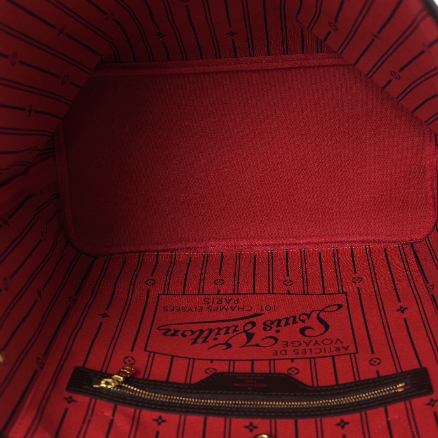 This is an authentic LOUIS VUITTON Damier Ebene Neverfull MM. This chic tote bag is crafted of classic Louis Vuitton checkerboard coated canvas in brown with dark brown cowhide leather shoulder straps, trim and side cinch cords and gold-toned hardware. The top is open to a rouge red striped fabric with a hanging zipper pocket.Follow this item for alerts. Louis Vuitton is a registered trademark of Louis Vuitton. FASHIONPHILE is not affiliated with Louis Vuitton.