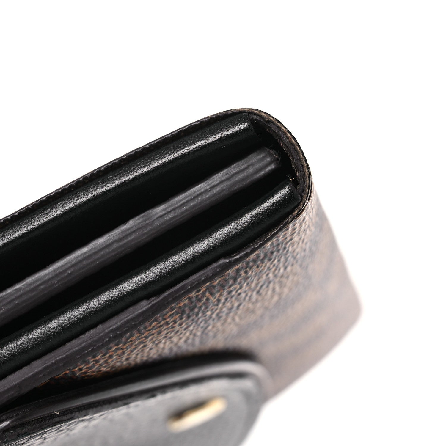This is an authentic LOUIS VUITTON Damier Ebene Normandy Wallet in Black. This wallet is crafted of traditional Louis Vuitton checkerboard coated toile canvas in brown with a black leather front flap. The flap opens with a brass snap to a brown crossgrain leather interior with card slots, patch pocket, and a zipper compartment.Follow this item for alerts. Louis Vuitton is a registered trademark of Louis Vuitton. FASHIONPHILE is not affiliated with Louis Vuitton.