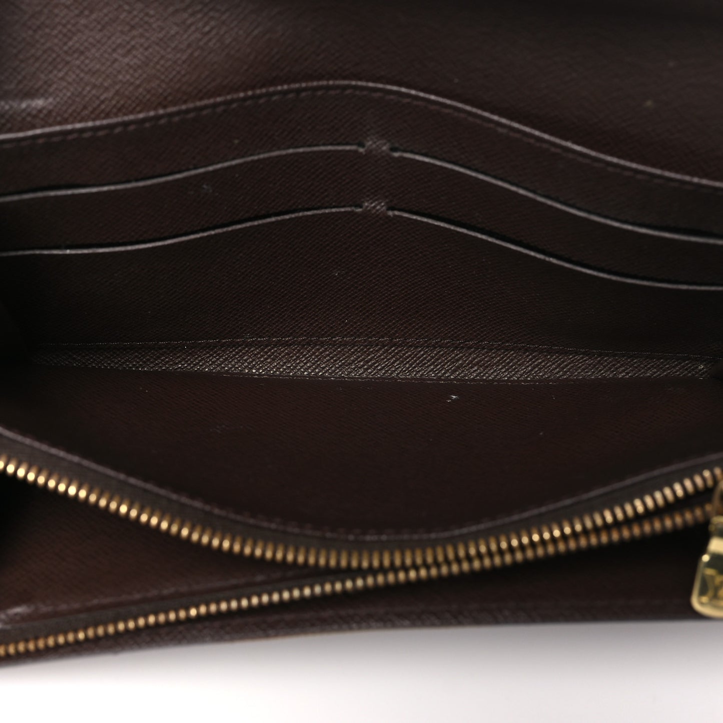 This is an authentic LOUIS VUITTON Damier Ebene Sarah Wallet. This stylish wallet is crafted of checkered coated canvas in brown. The flap opens with a polished gold snap to a brown crossgrain leather interior with card slots, a central zipper compartment, and a patch pocket.Follow this item for alerts. Louis Vuitton is a registered trademark of Louis Vuitton. FASHIONPHILE is not affiliated with Louis Vuitton.