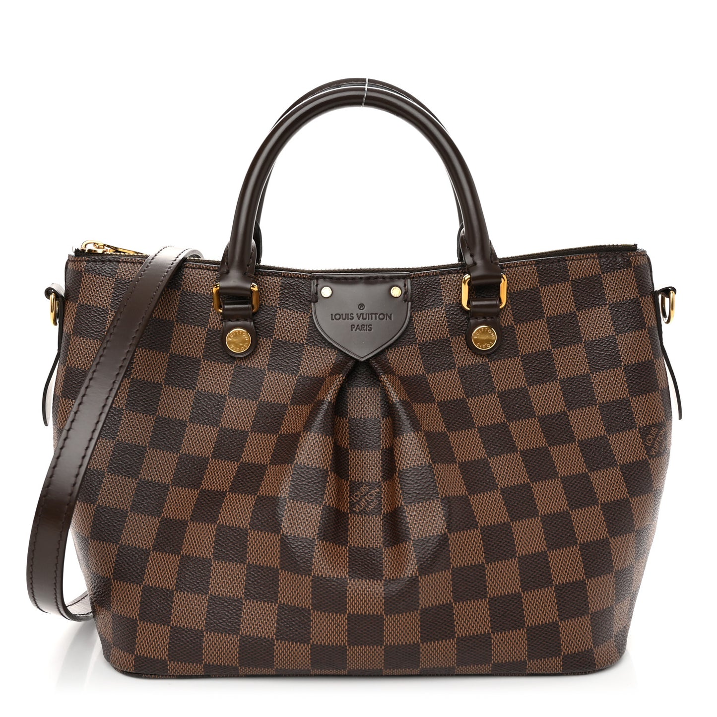 This is an authentic LOUIS VUITTON Damier Ebene Siena PM. This stylish tote is crafted of Louis Vuitton checkerboard on pleated, coated canvas in brown. The bag features chocolate brown leather trim, rolled top handles and polished gold hardware. The top zipper opens to a red fabric interior with patch pockets.Follow this item for alerts. Louis Vuitton is a registered trademark of Louis Vuitton. FASHIONPHILE is not affiliated with Louis Vuitton.