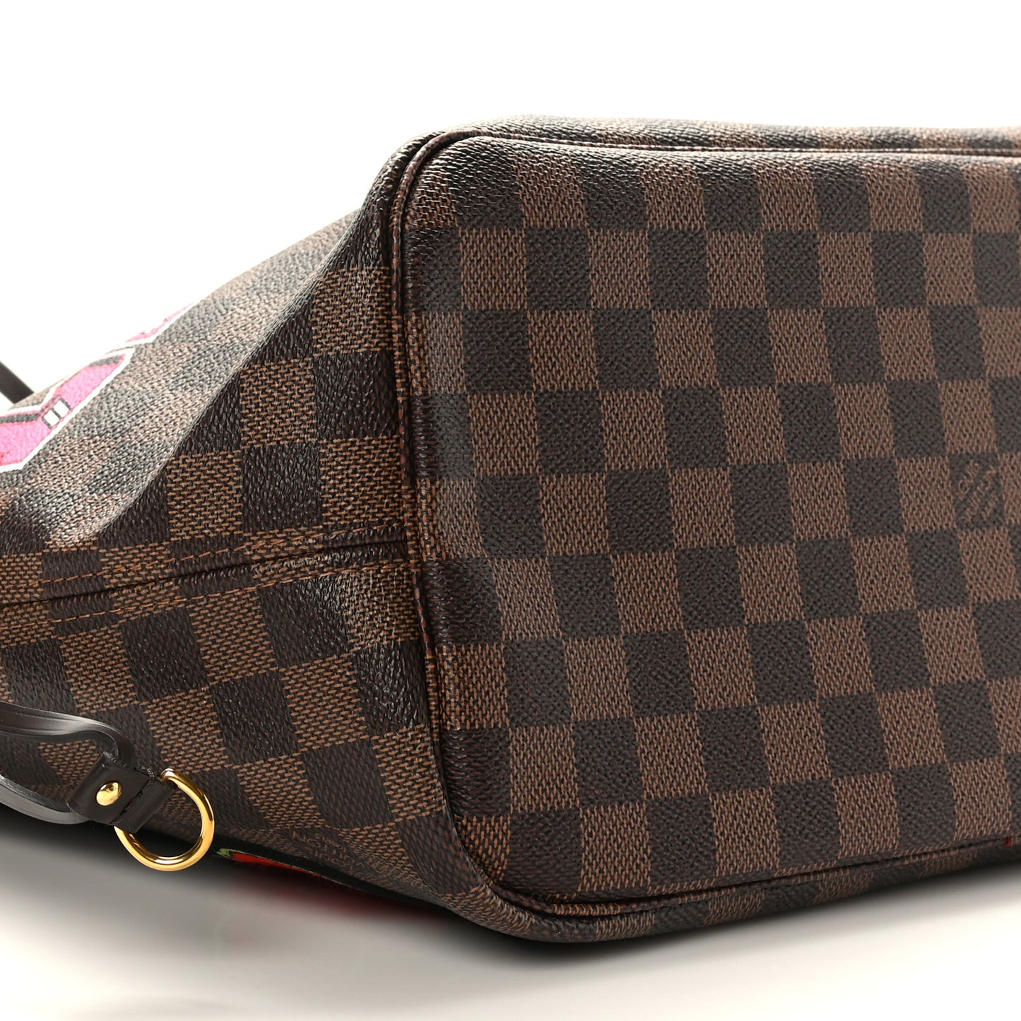 This is an authentic LOUIS VUITTON Damier Ebene Travel Stickers Neo Neverfull MM. This chic handbag is crafted of classic Louis Vuitton Damier checkered coated canvas with printed stickers and embroidered, microfiber, and sequined patches inspired by Louis Vuitton's travel heritage. The tote features dark brown leather handles and trim, and polished brass hardware. The top is open to an interior of rouge red striped fabric with a hanging zipper pocket.