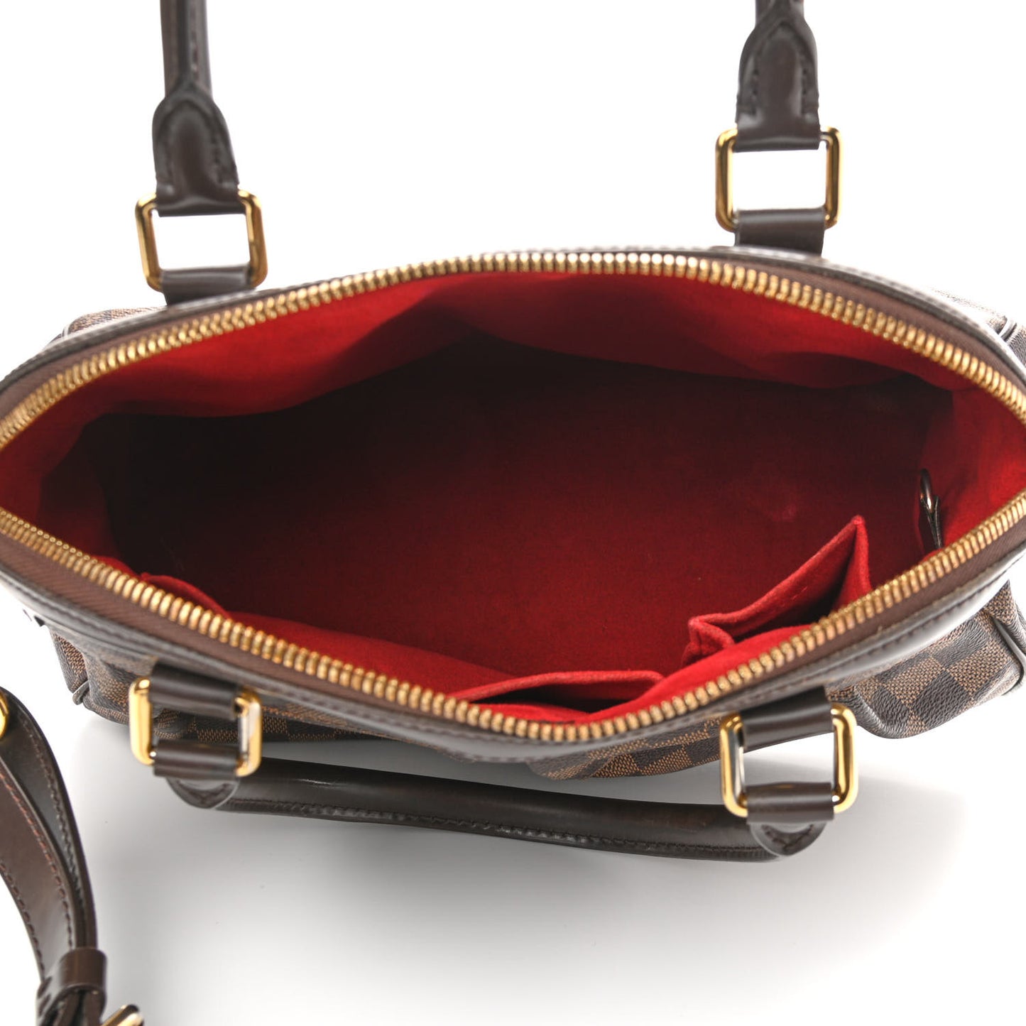 This is an authentic LOUIS VUITTON Damier Ebene Trevi PM. This stylish tote is crafted of checkered damier coated canvas in brown with a decorative pleat. The shoulder bag features dark brown leather trim including rolled leather top handles, piping, and an optional adjustable shoulder strap with polished brass hardware. The top zipper opens to a red microfiber interior with patch pockets.Follow this item for alerts. Louis Vuitton is a registered trademark of Louis Vuitton. FASHIONPHILE is not affiliated with Louis Vuitton.
