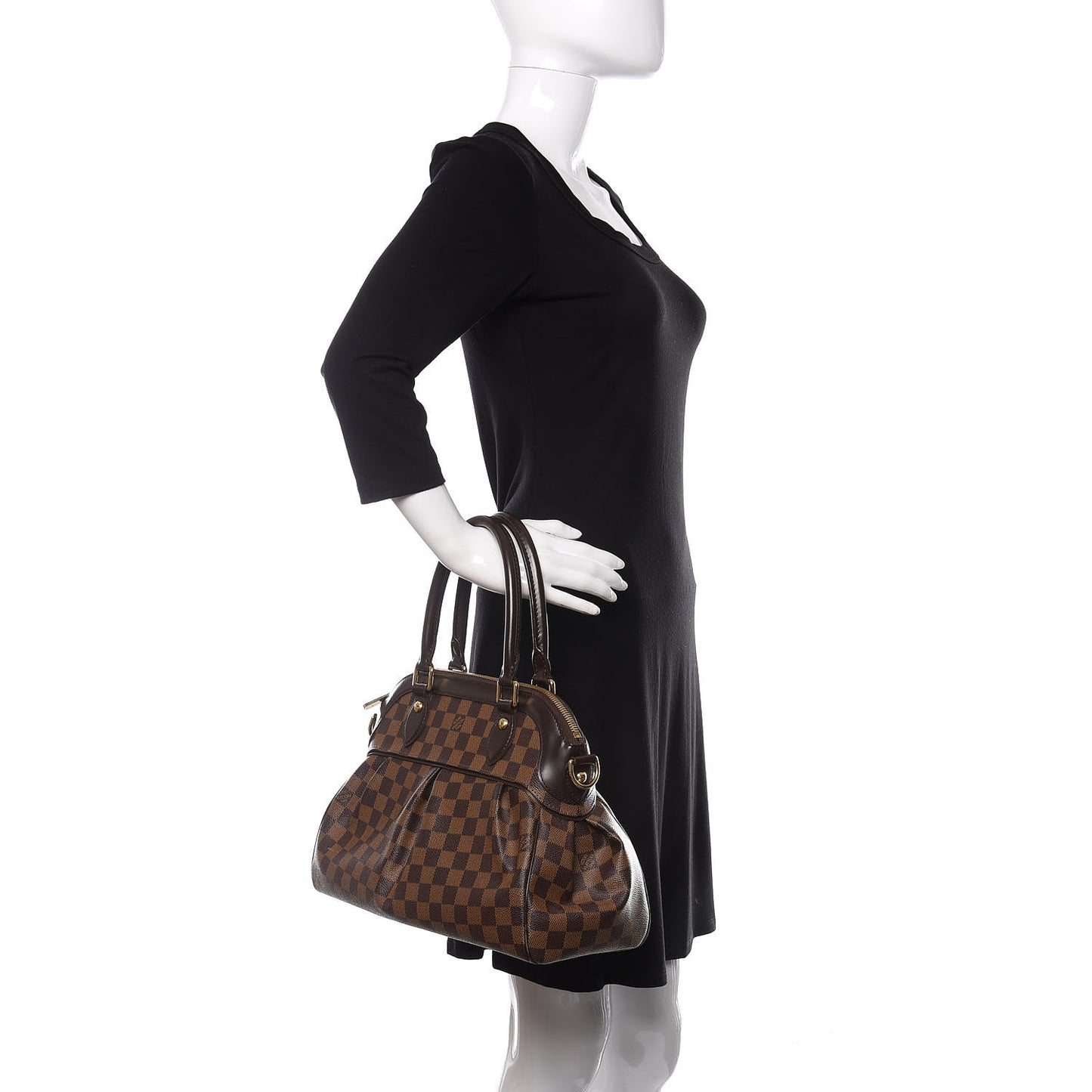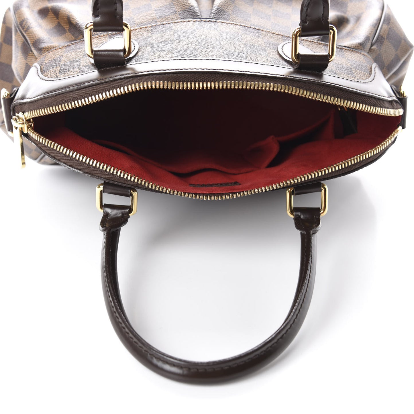 This is an authentic LOUIS VUITTON Damier Ebene Trevi PM. This is a very stylish handbag that is beautifully crafted of signature Louis Vuitton Damier coated canvas in brown. The bag features polished brass hardware, chocolate brown cowhide leather trim and rolled top handles. The top zipper opens the bag to a cherry red microfiber interior with patch pockets. This is an ideal shoulder bag for everyday use, with the sophistication and style from Louis Vuitton!Follow this item for alerts. Louis Vuitton is a registered trademark of Louis Vuitton. FASHIONPHILE is not affiliated with Louis Vuitton.