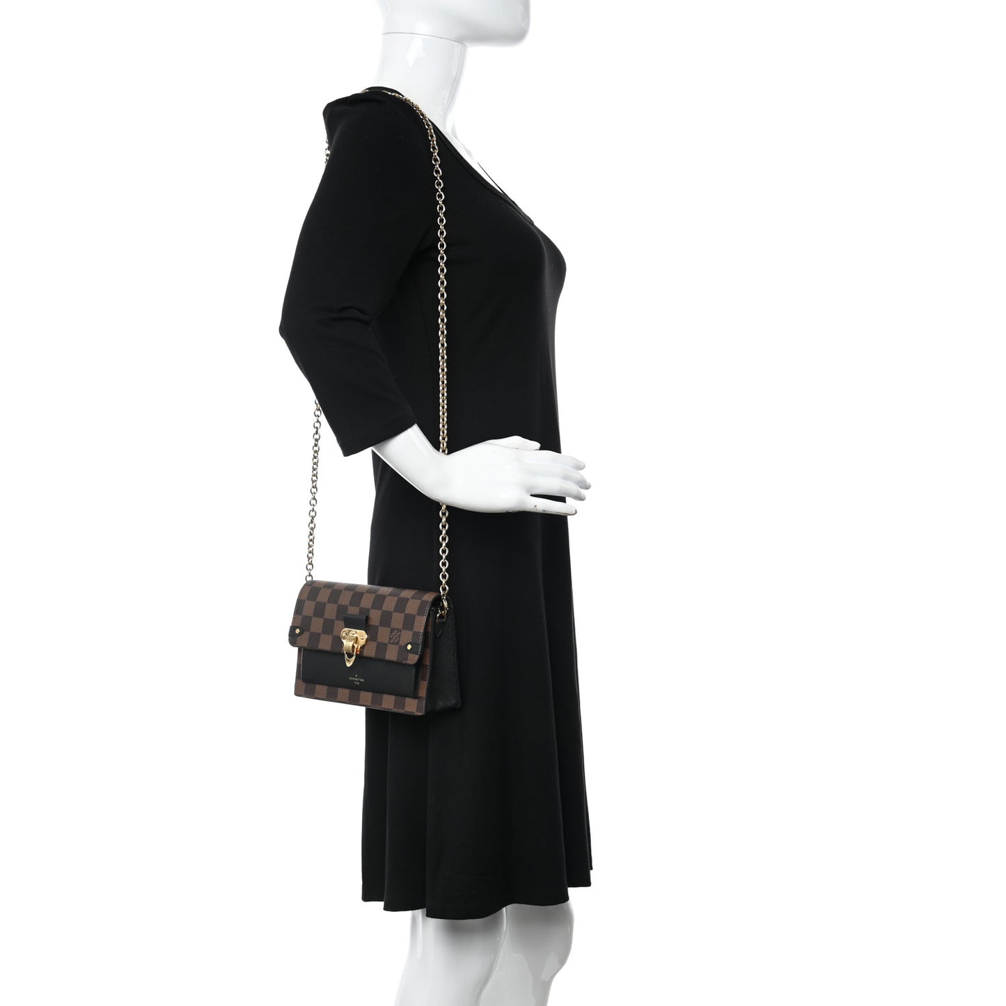 This is an authentic LOUIS VUITTON Damier Ebene Vavin Chain Wallet in Black. This beautiful shoulder bag is crafted of signature Louis Vuitton damier in brown on coated canvas. The bag features black leather trim and front pocket, an optional polished gold chain link shoulder strap, and a matching gold faux flip lock on the crossover flap. The bag opens with a magnetic snap to a black microfiber interior with a zipper compartment, card slots, and patch pockets.