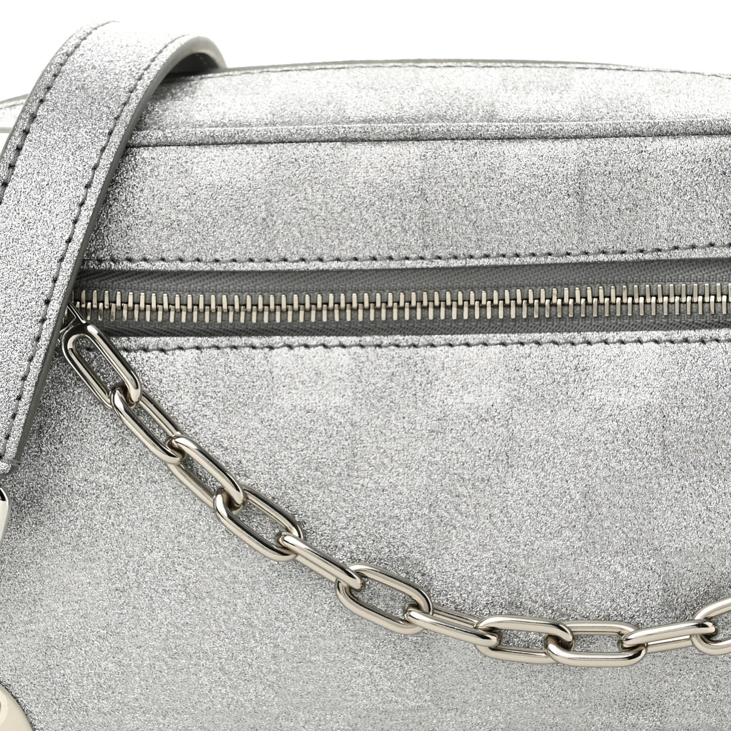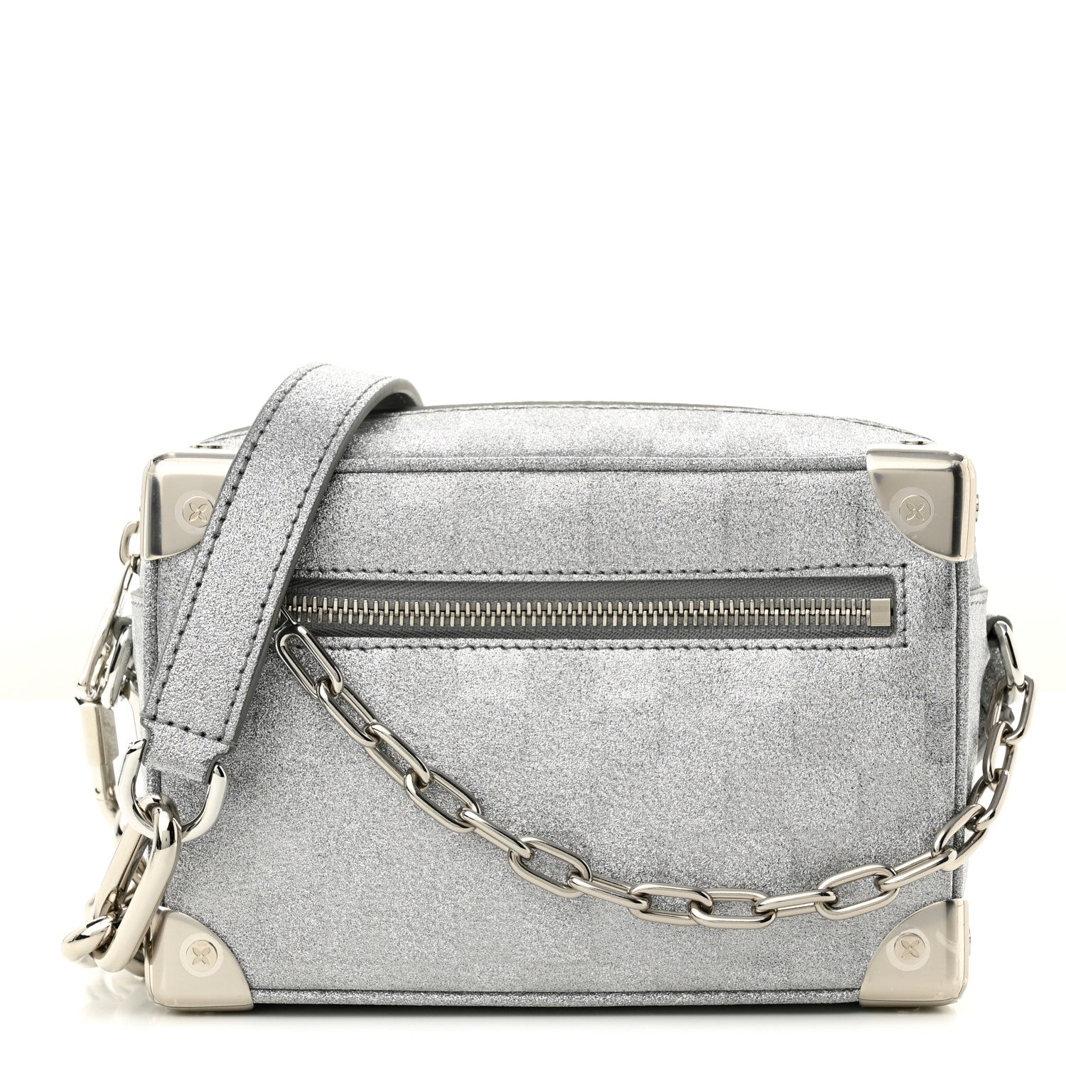 This is an authentic LOUIS VUITTON Damier Glitter Mini Soft Trunk in Silver. This stylish shoulder bag from Virgil Abloh's collection is crafted with shiny leather embossed with the Damier pattern in shimmering glitter. It features a matching shoulder strap with chain links and bright silver hardware. The top zipper opens to a grey fabric interior with a patch pocket.Follow this item for alerts. Louis Vuitton is a registered trademark of Louis Vuitton. FASHIONPHILE is not affiliated with Louis Vuitton.