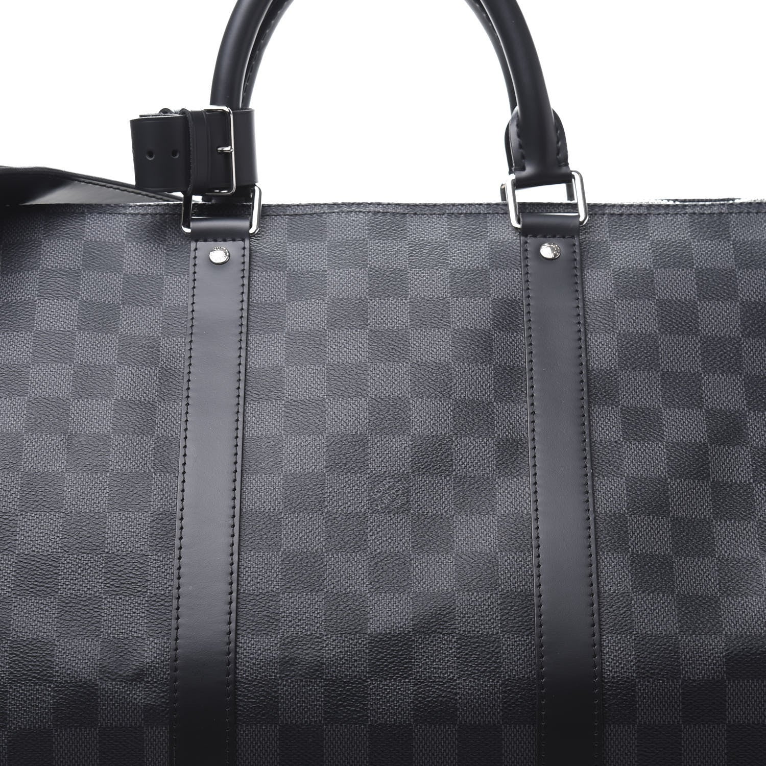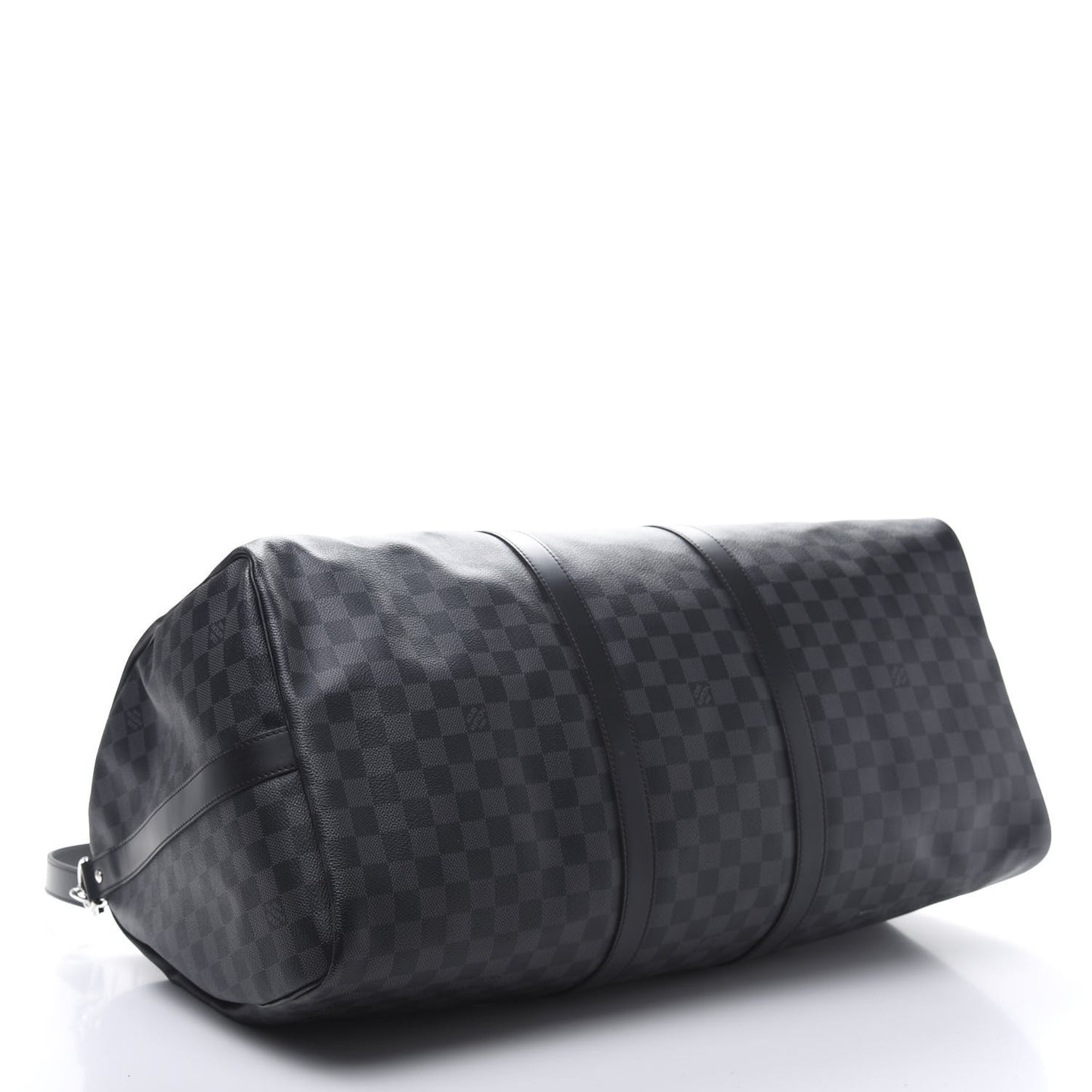 This is an authentic LOUIS VUITTON Damier Graphite Keepall Bandouliere 55. This travel bag is crafted of Louis Vuitton's signature Damier check canvas in black and grey. It features sturdy black rolled leather top handles, a removable shoulder strap, silver hardware, and a detachable luggage tag. The top zippers open to a spacious black fabric interior with a hanging zipper pocket.Follow this item for alerts. Louis Vuitton is a registered trademark of Louis Vuitton. FASHIONPHILE is not affiliated with Louis Vuitton.