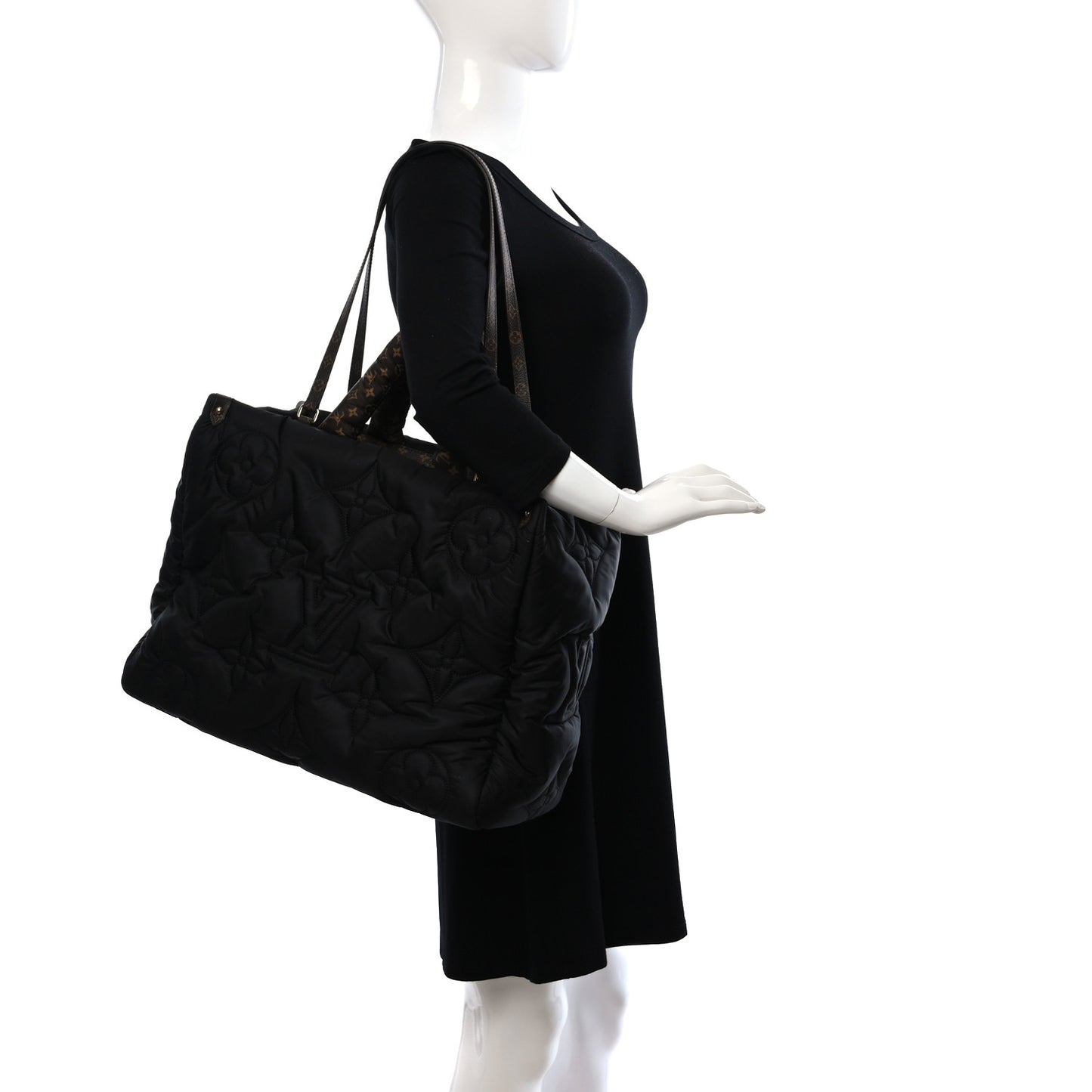 This is an authentic LOUIS VUITTON Econyl Monogram Pillow Giant Onthego MM in Black. This limited edition tote features an oversized stitched monogram pattern on a black nylon textile. The bag features brown nylon monogram top handles and coated canvas long shoulder straps that can be tucked away inside the bag, accented with polished brass hardware. The top is open to a spacious monogram fabric interior with zipper and patch pockets.Follow this item for alerts. Louis Vuitton is a registered trademark of Louis Vuitton. FASHIONPHILE is not affiliated with Louis Vuitton.