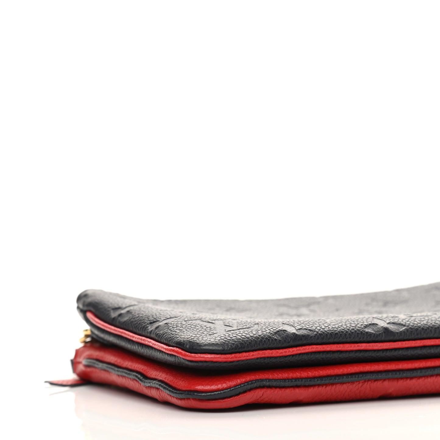 This is an authentic LOUIS VUITTON Empreinte Double Zip Pochette in Marine and Rouge. This stylish wallet is crafted of Louis Vuitton monogram empreinte leather in blue and red. This stylish shoulder bag features a polished gold chain link shoulder strap and top two top zippers. This opens to a red and blue microfiber interior with a patch pocket and card slots.Follow this item for alerts. Louis Vuitton is a registered trademark of Louis Vuitton. FASHIONPHILE is not affiliated with Louis Vuitton.