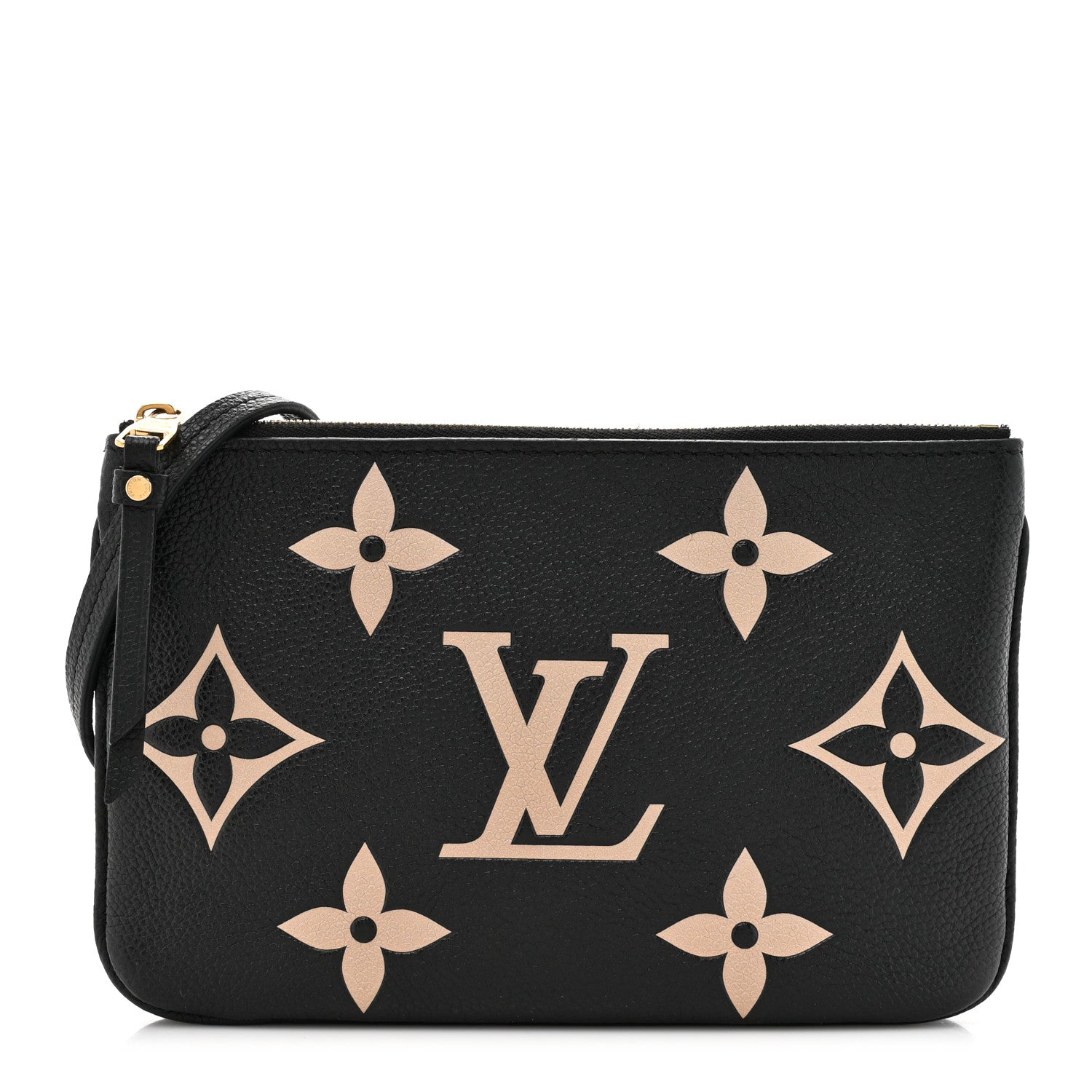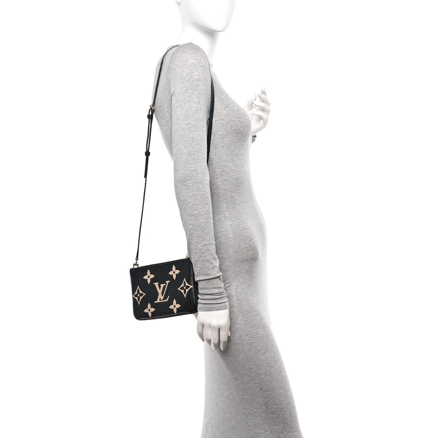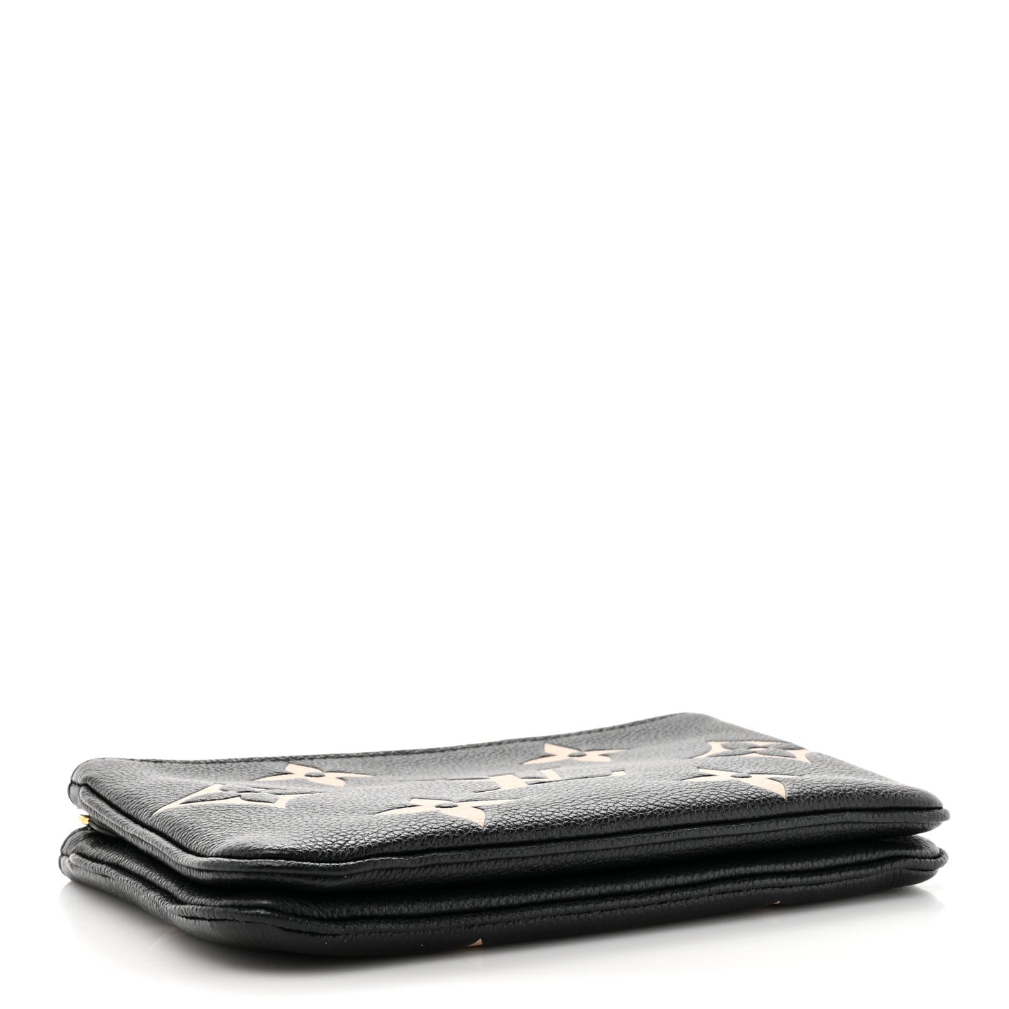 This is an authentic LOUIS VUITTON Empreinte Monogram Giant Double Zip Pochette in Black and Cream. This stylish pochette is crafted of Louis Vuitton monogrammed empreinte leather in black. This stylish shoulder bag features a black leather shoulder strap and two top zippers. These each open to a black microfiber interior with a patch pocket and card slots.Follow this item for alerts. Louis Vuitton is a registered trademark of Louis Vuitton. FASHIONPHILE is not affiliated with Louis Vuitton.