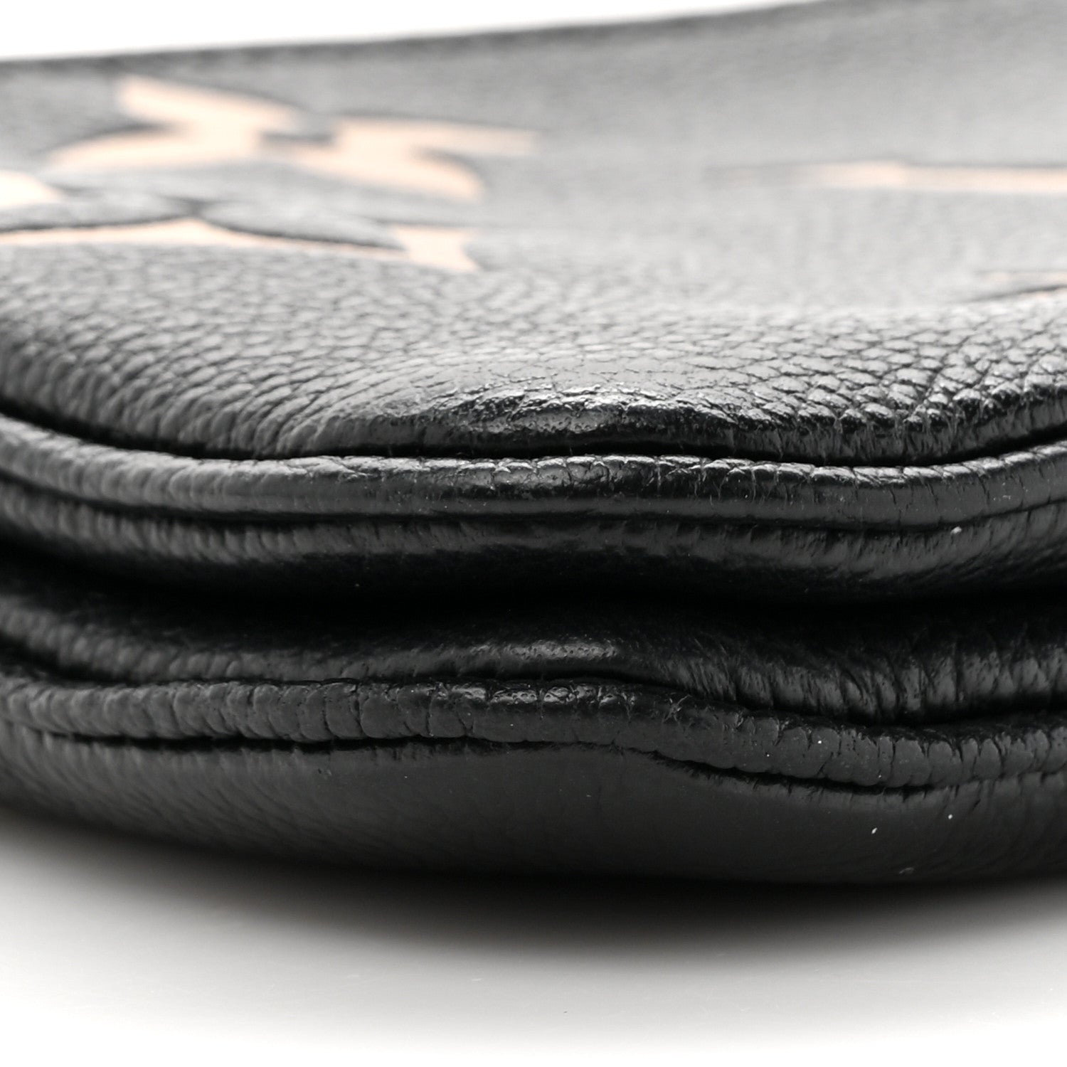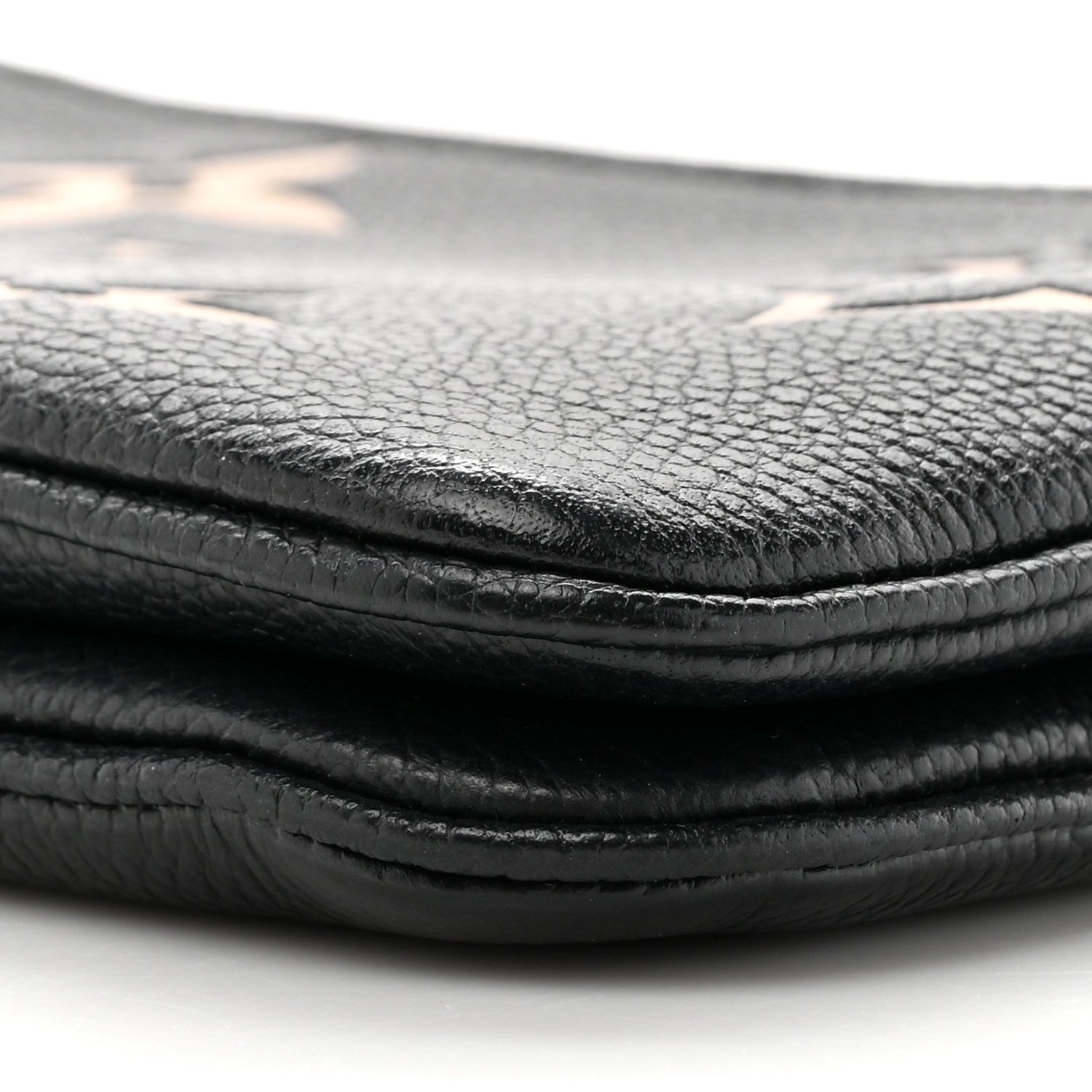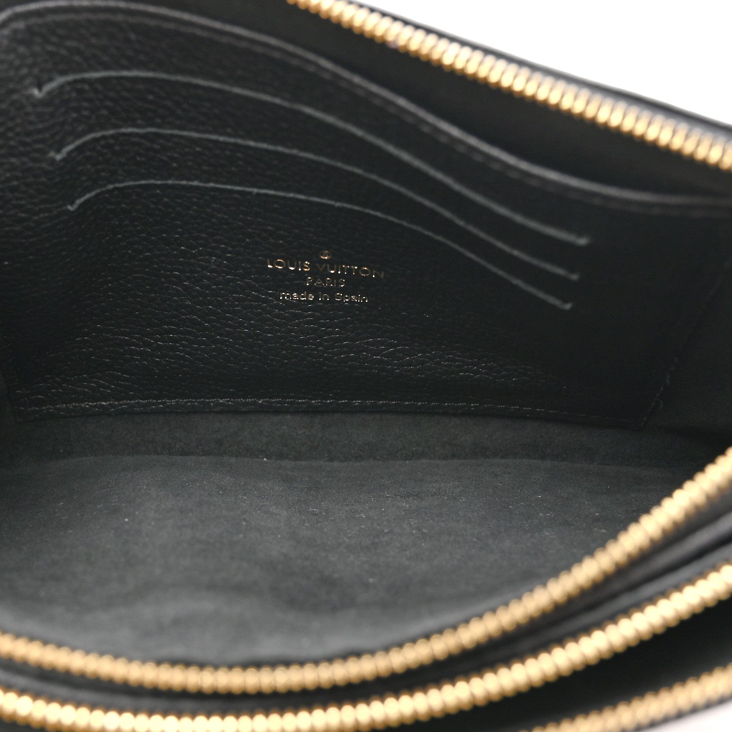 This is an authentic LOUIS VUITTON Empreinte Monogram Giant Double Zip Pochette in Black and Cream. This stylish pochette is crafted of Louis Vuitton monogrammed empreinte leather in black. This stylish shoulder bag features a black leather shoulder strap and two top zippers. These each open to a black microfiber interior with a patch pocket and card slots.Follow this item for alerts. Louis Vuitton is a registered trademark of Louis Vuitton. FASHIONPHILE is not affiliated with Louis Vuitton.