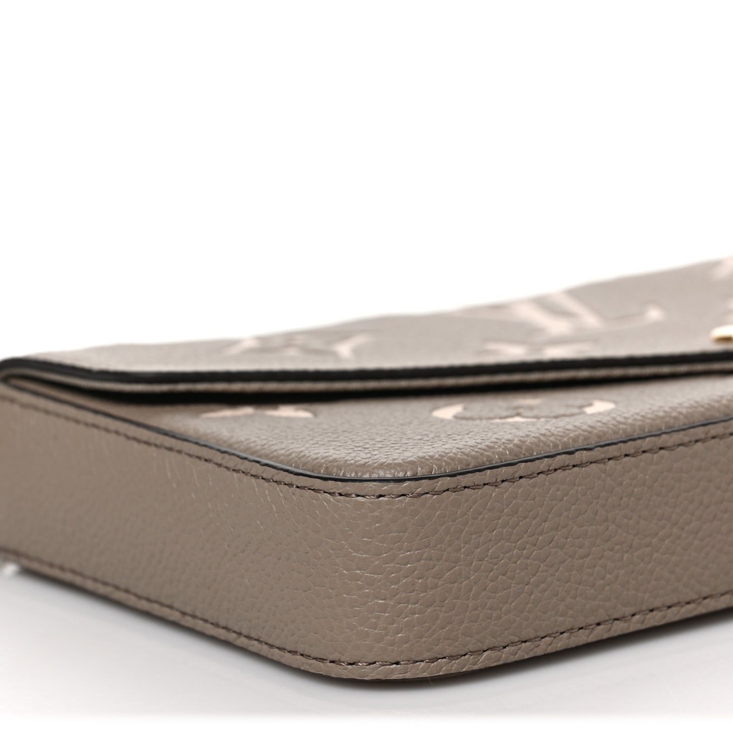 This is an authentic LOUIS VUITTON Empreinte Monogram Giant Felicie Pochette in Tourterelle and Creme. This stylish wallet is crafted of Louis Vuitton monogrammed Empreinte leather in taupe. This stylish shoulder bag features an optional brass chain-link shoulder strap and an envelope-style facing flap. This opens to a matching fabric interior with two removable inserts.
