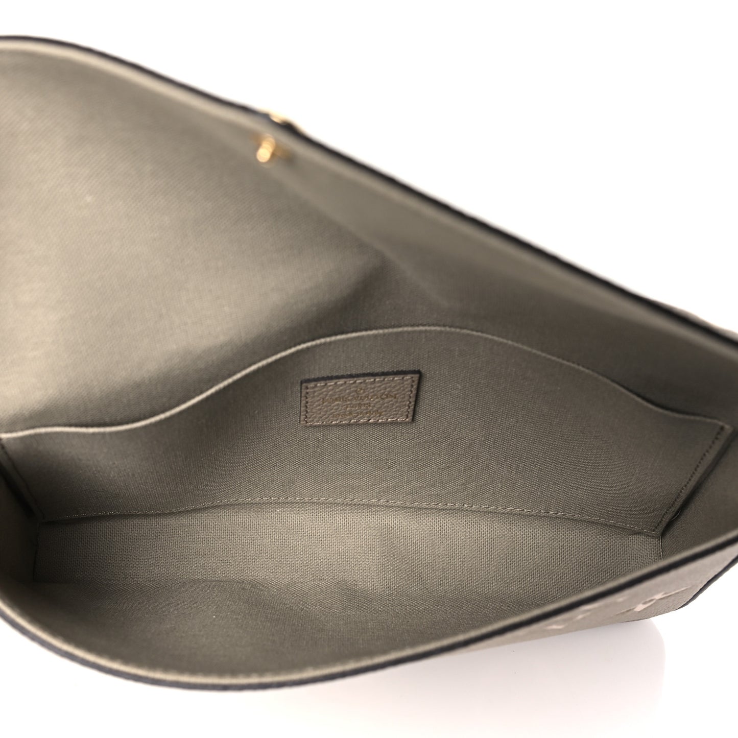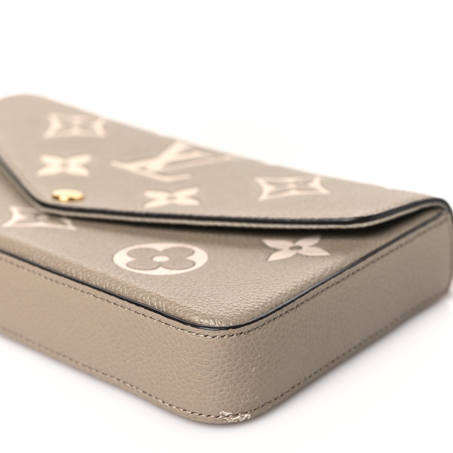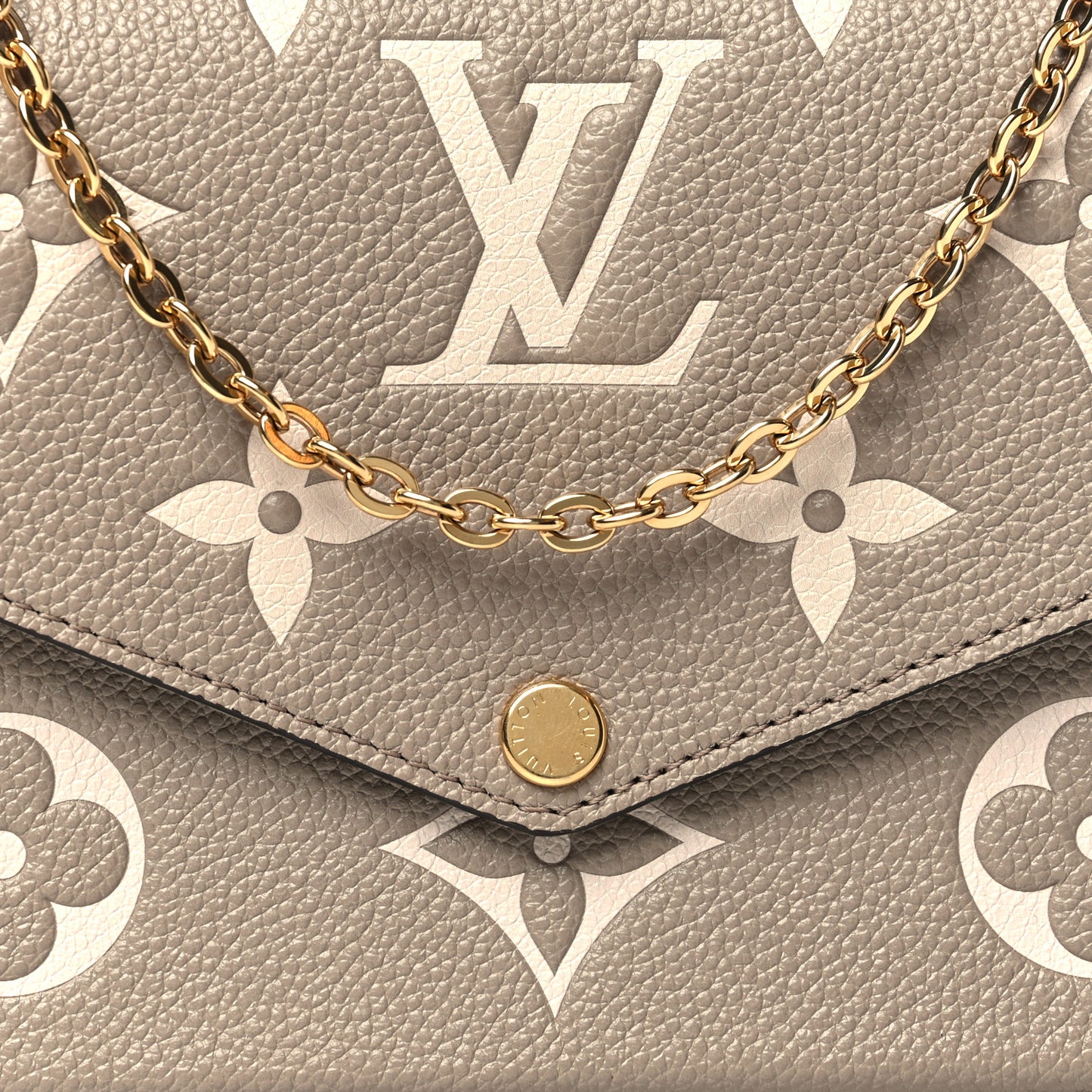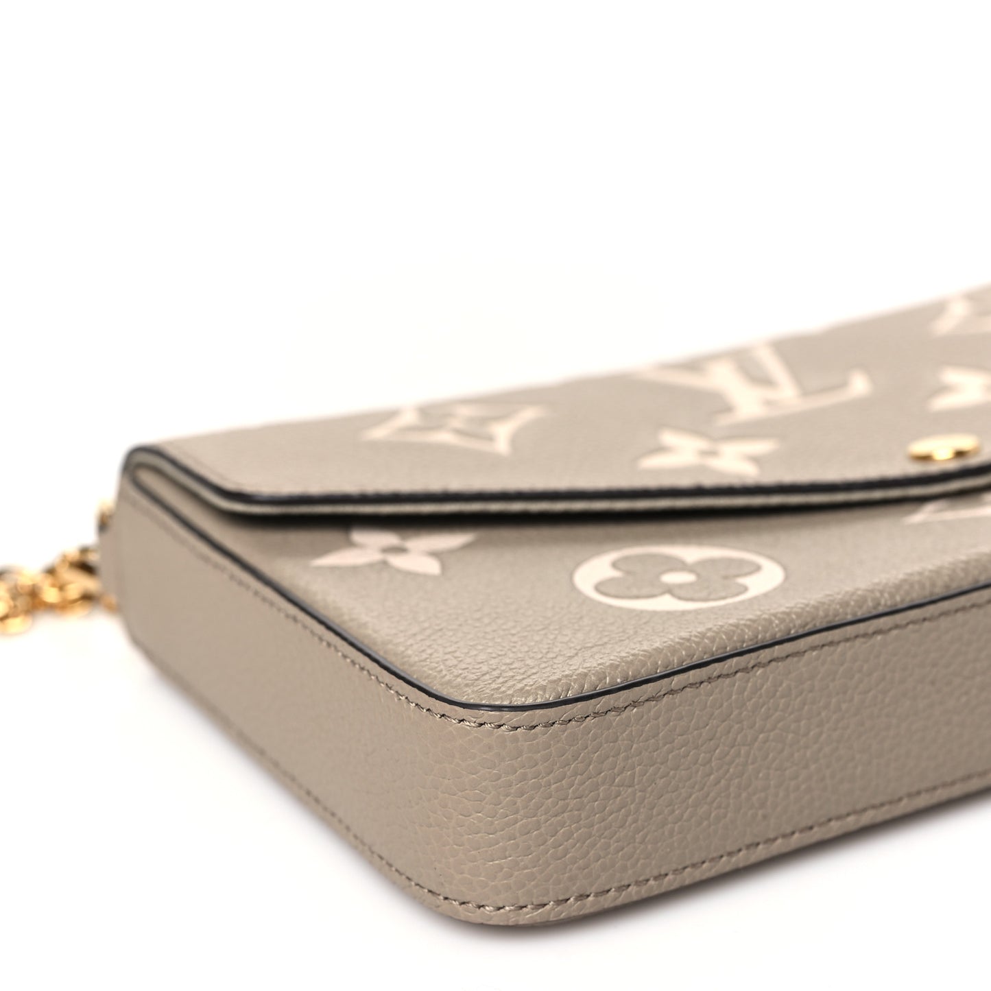 This is an authentic LOUIS VUITTON Empreinte Monogram Giant Felicie Pochette in Tourterelle and Creme. This stylish wallet is crafted of Louis Vuitton monogrammed Empreinte leather in taupe. This stylish shoulder bag features an optional brass chain-link shoulder strap and an envelope-style facing flap. This opens to a matching fabric interior with two removable inserts.Follow this item for alerts. Louis Vuitton is a registered trademark of Louis Vuitton. FASHIONPHILE is not affiliated with Louis Vuitton.