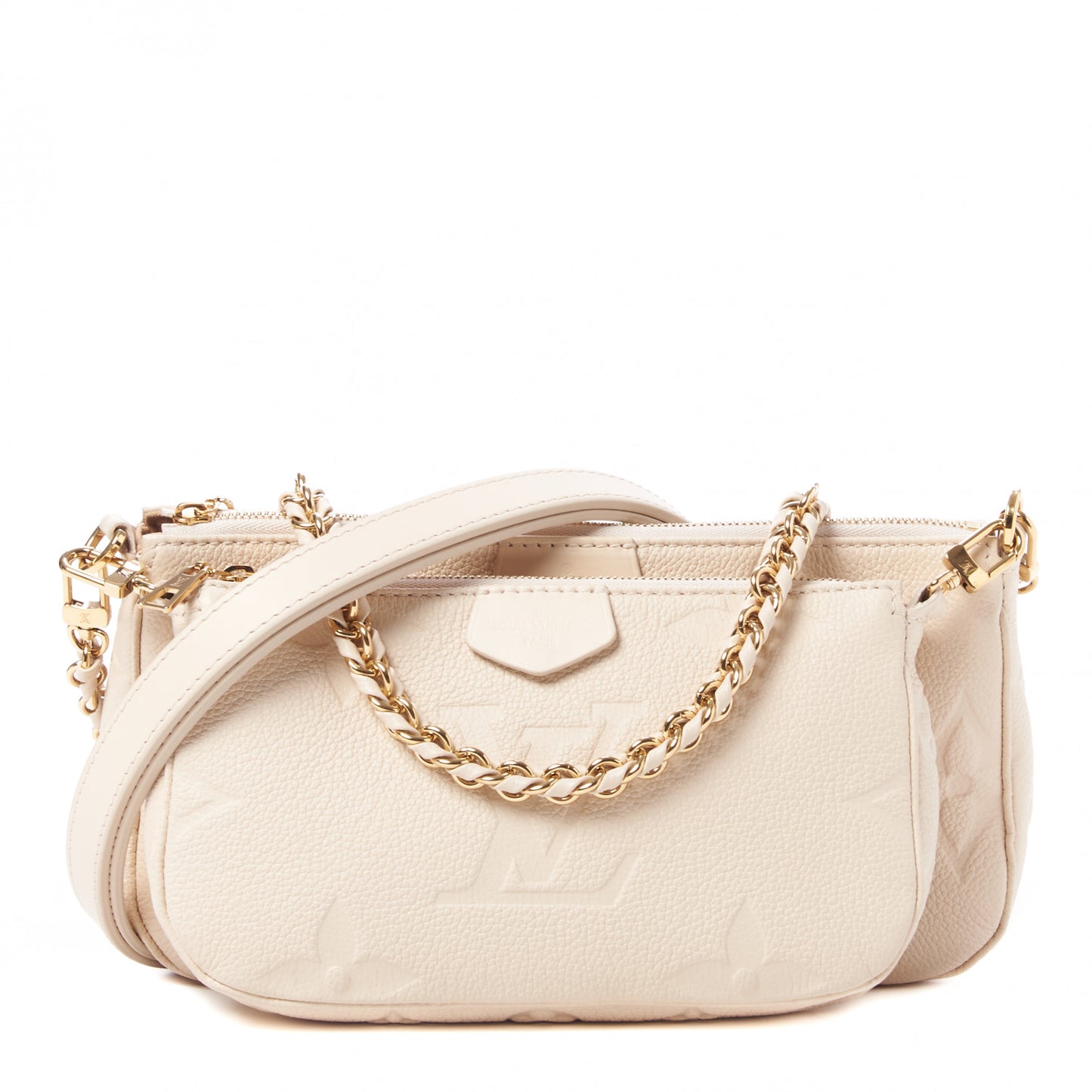 This is an authentic LOUIS VUITTON Empreinte Monogram Giant Multi Pochette Accessories in Cream. This stylish shoulder bag is finely crafted of classic monogram empreinte leather in ivory. The handbag features a leather shoulder strap, a leather and chain-link strap, a pochette, and polished brass hardware. It opens to a beige microfiber interior with a pocket.Follow this item for alerts. Louis Vuitton is a registered trademark of Louis Vuitton. FASHIONPHILE is not affiliated with Louis Vuitton.
