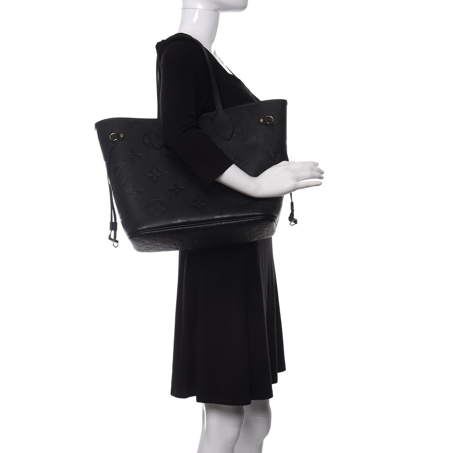 This is an authentic LOUIS VUITTON Empreinte Monogram Giant Neverfull MM in Black. This beautiful tote is crafted of a black monogram embossed leather. The bag features rolled leather top handles and polished gold tone hardware and a matching pochette. The top is open to a spacious navy microfiber interior with a hanging zipper pocket.Follow this item for alerts. Louis Vuitton is a registered trademark of Louis Vuitton. FASHIONPHILE is not affiliated with Louis Vuitton.