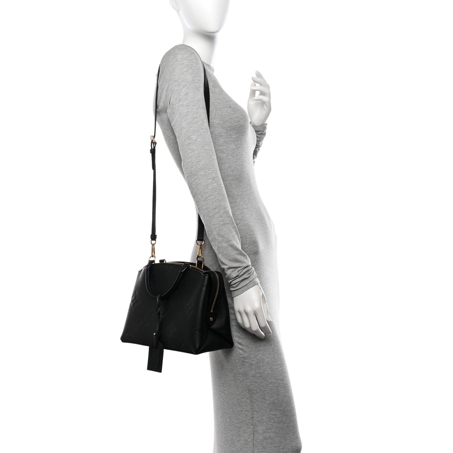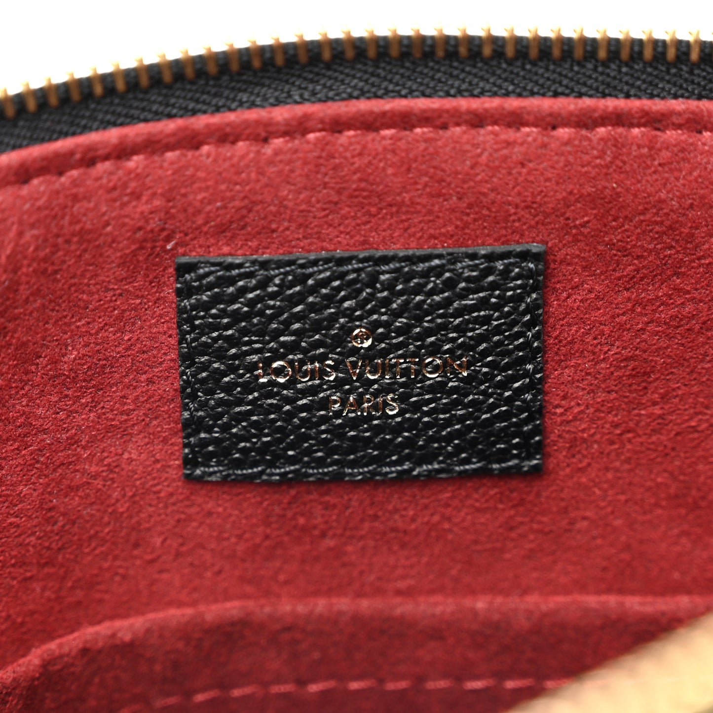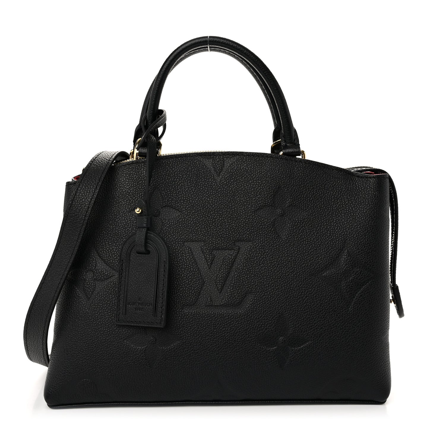 This is an authentic LOUIS VUITTON Empreinte Monogram Giant Petit Palais in Black. This shoulder bag is crafted of Louis Vuitton monogram-embossed calfskin leather in black. The bag features rolled leather handles, an optional shoulder strap with gold hardware, and a top zipper that opens to a burgundy microfiber interior with patch pockets.Follow this item for alerts. Louis Vuitton is a registered trademark of Louis Vuitton. FASHIONPHILE is not affiliated with Louis Vuitton.