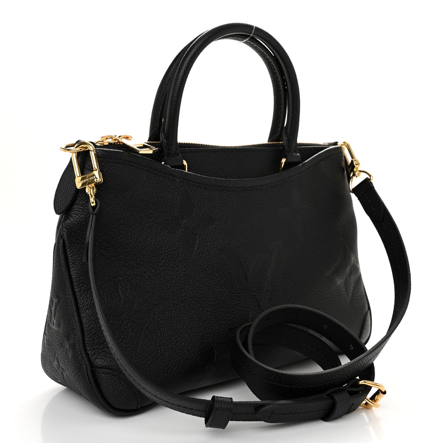 This is an authentic LOUIS VUITTON Empreinte Monogram Giant Trianon PM in Black. This chic tote is crafted of Louis Vuitton monogram embossed leather in black. The bag features rolled leather top handles, an optional shoulder strap, and polished brass links. The top opens to a partitioned blue fabric interior with a central zipper compartment and patch pockets.