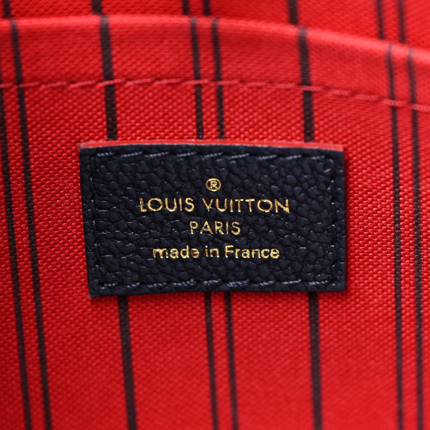 This is an authentic LOUIS VUITTON Empreinte Montaigne MM in Marine and Rouge. This bag is crafted of monogram embossed leather in dark blue with red edging. This bag features leather rolled top handles, polished gold hardware, and an optional shoulder strap. The top opens to a partitioned red and blue striped interior with a central zipper compartment and patch pockets.Follow this item for alerts. Louis Vuitton is a registered trademark of Louis Vuitton. FASHIONPHILE is not affiliated with Louis Vuitton.