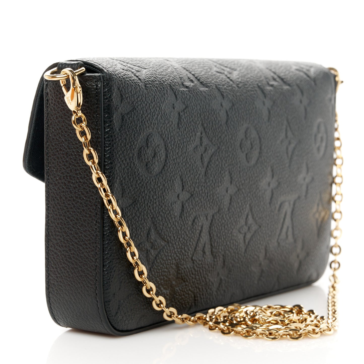 This is an authentic LOUIS VUITTON Empreinte Pochette Felicie Chain Wallet in Black. This chic clutch is crafted of black calfskin leather embossed with the Louis Vuitton monogram. The bag features a gold-toned chain-link shoulder strap and an envelope-style front flap that unsnaps to a black fabric interior with a patch pocket.Follow this item for alerts. Louis Vuitton is a registered trademark of Louis Vuitton. FASHIONPHILE is not affiliated with Louis Vuitton.