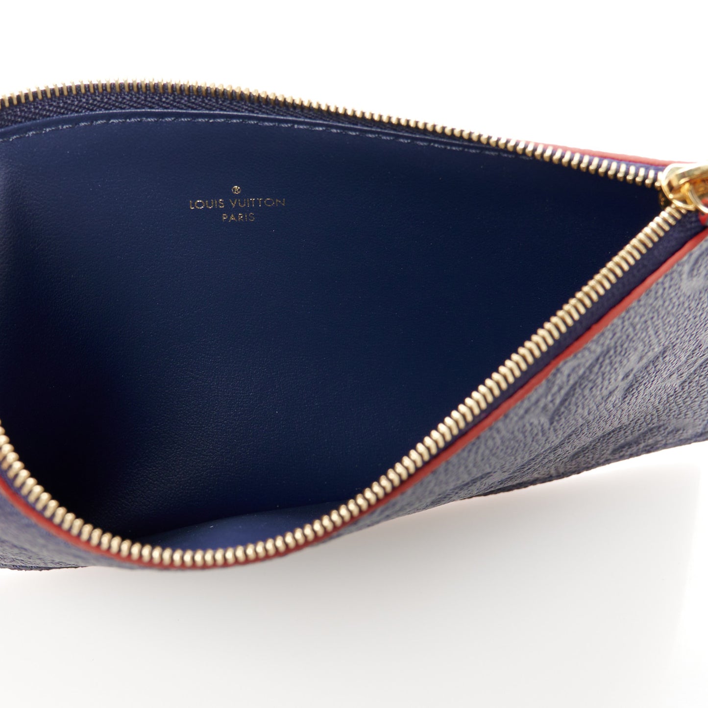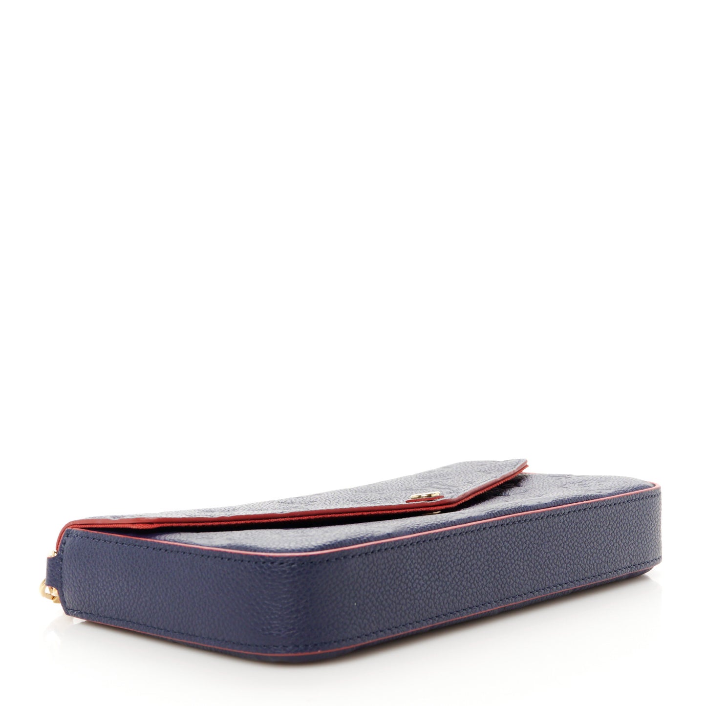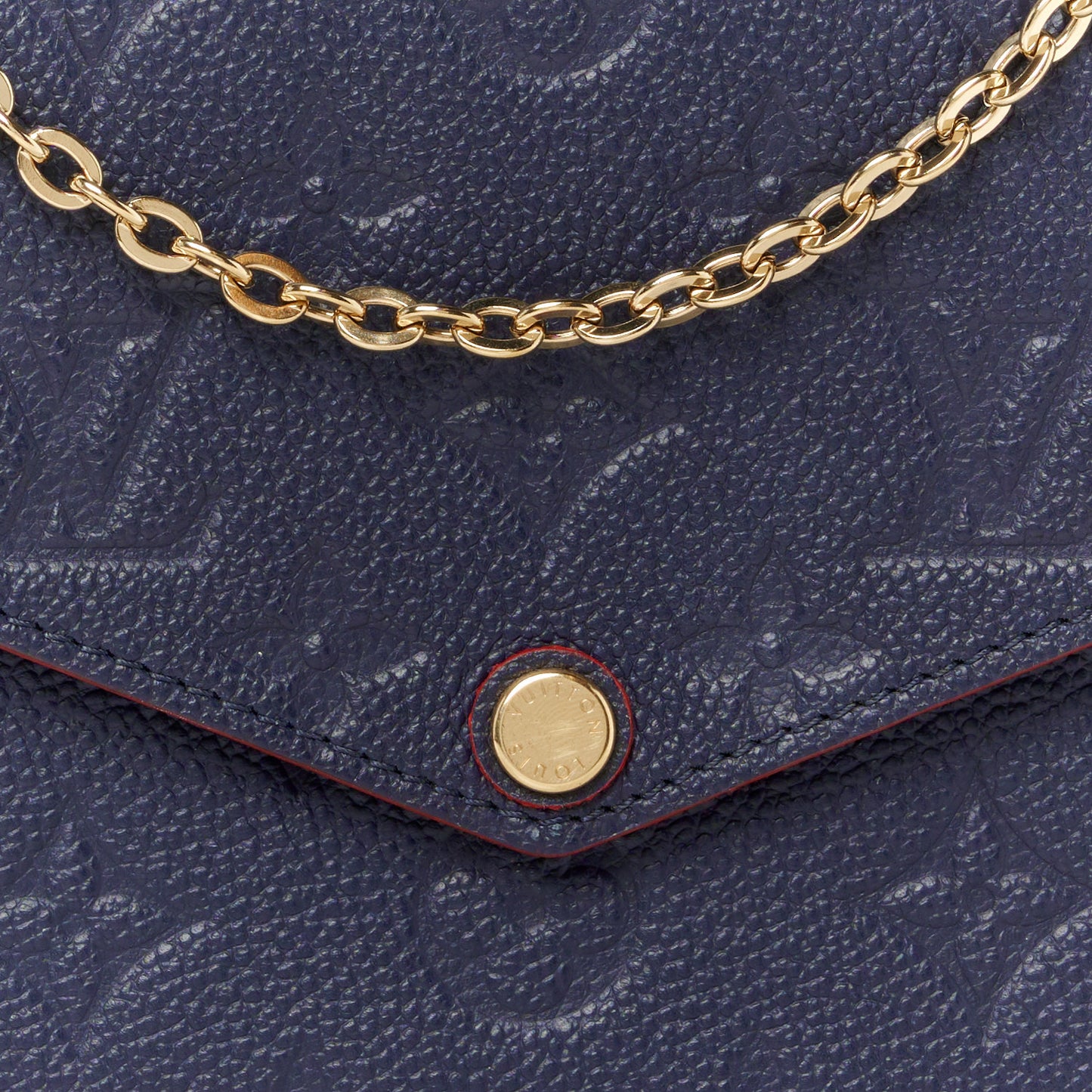 This is an authentic LOUIS VUITTON Empreinte Pochette Felicie Chain Wallet in Marine and Rouge. This stylish wallet is crafted of Louis Vuitton monogrammed empreinte leather in navy blue with decorative red edges. The bag features a polished gold tone chain link shoulder strap, and an envelope-style crossover flap. This snaps open to a red fabric interior with a patch pocket, a zipper insert, and an insert with card slots.