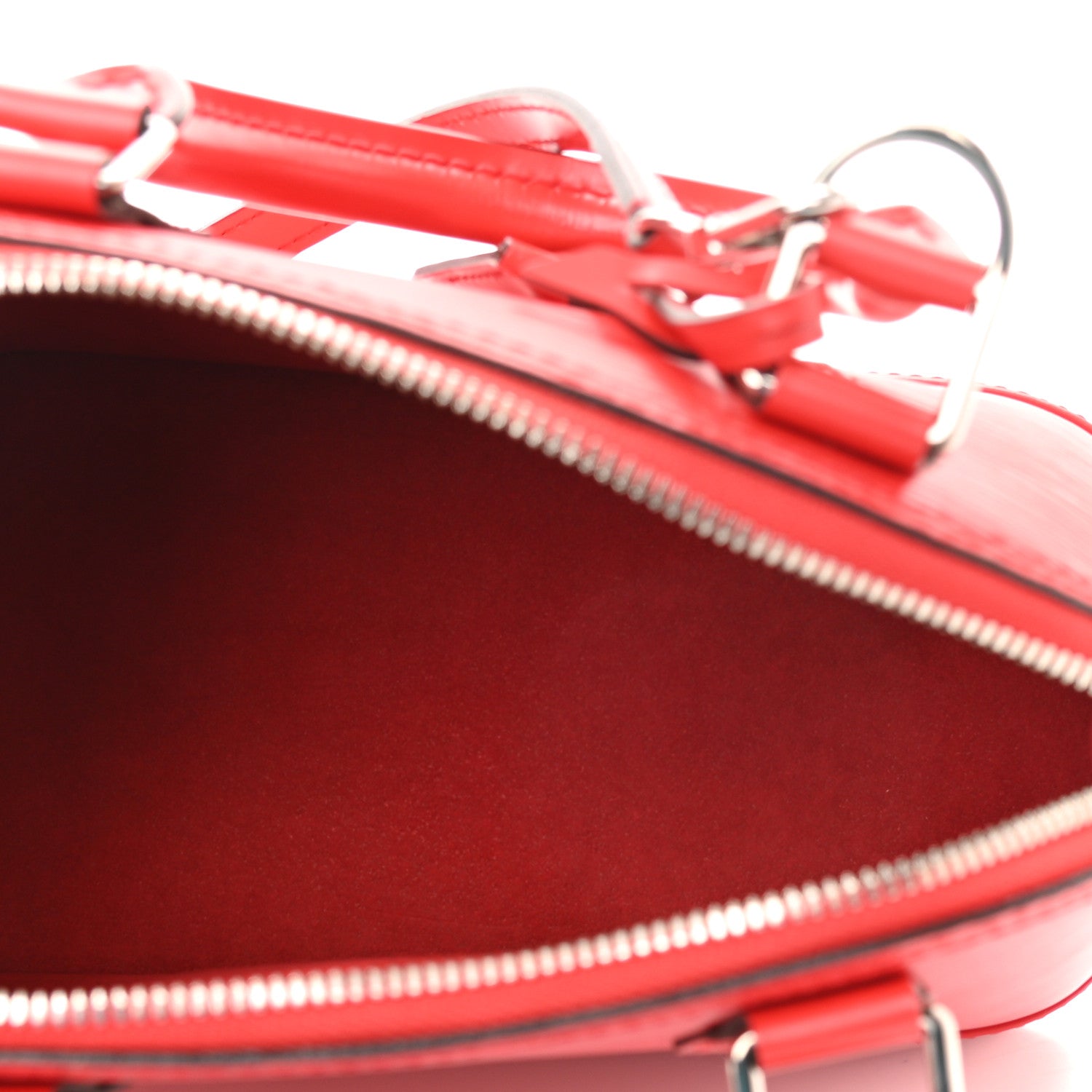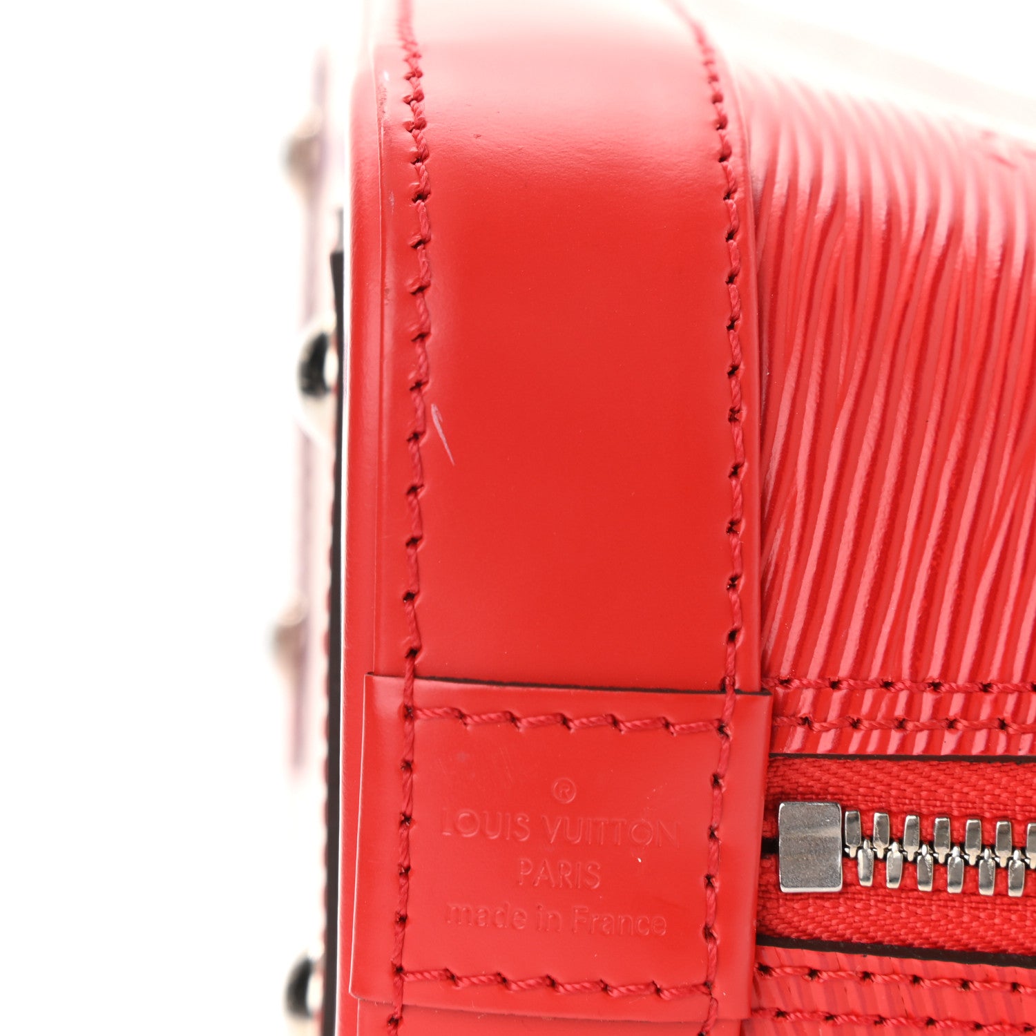This is an authentic LOUIS VUITTON Epi Alma BB in Coquelicot. This stylish tote is crafted of Louis Vuitton signature textured epi leather in red. This classic mini handbag features a long detachable leather crossbody strap, matching rolled leather top handles, and silver hardware. The wrap-around zippers open to a red microfiber interior with a patch pocket.Follow this item for alerts. Louis Vuitton is a registered trademark of Louis Vuitton. FASHIONPHILE is not affiliated with Louis Vuitton.
