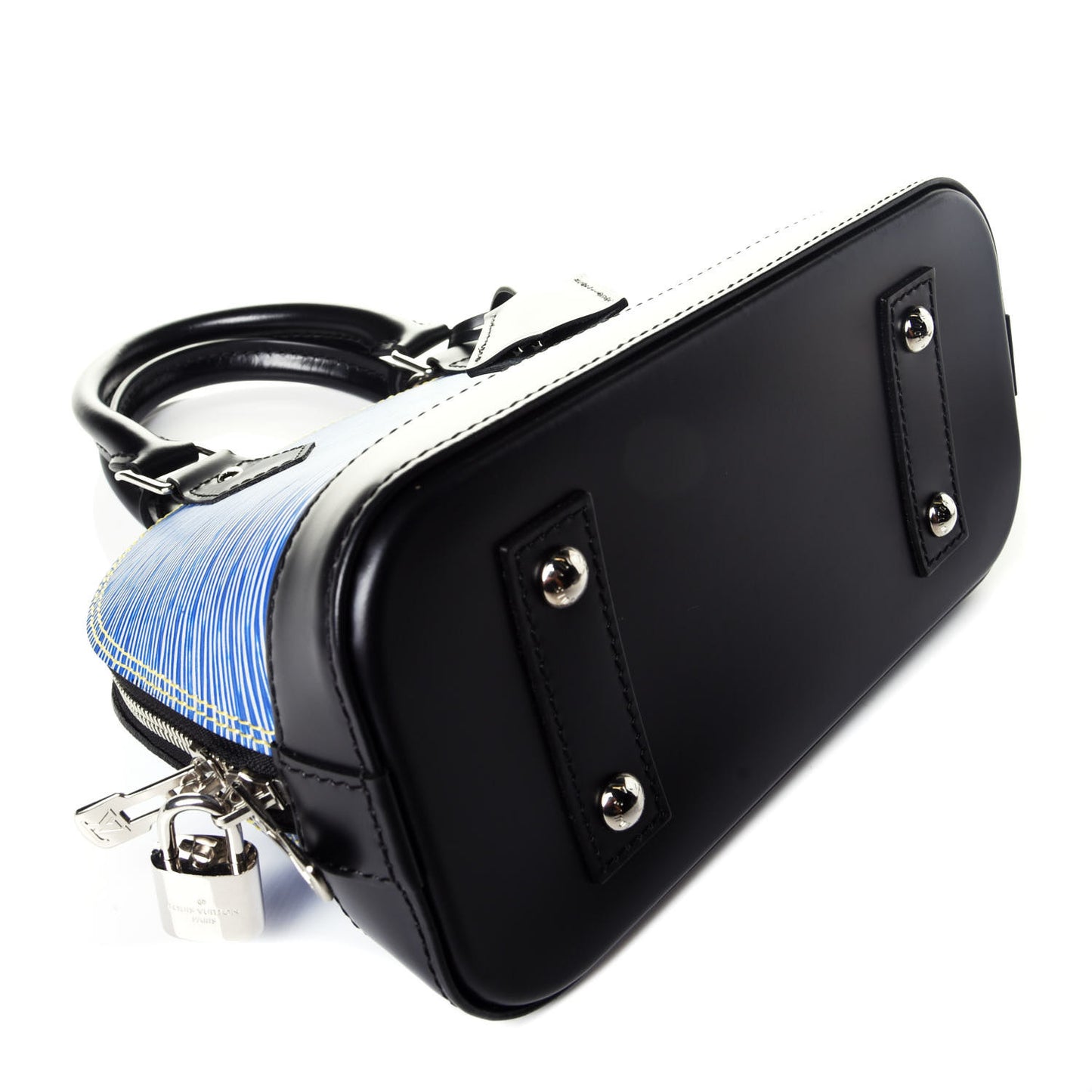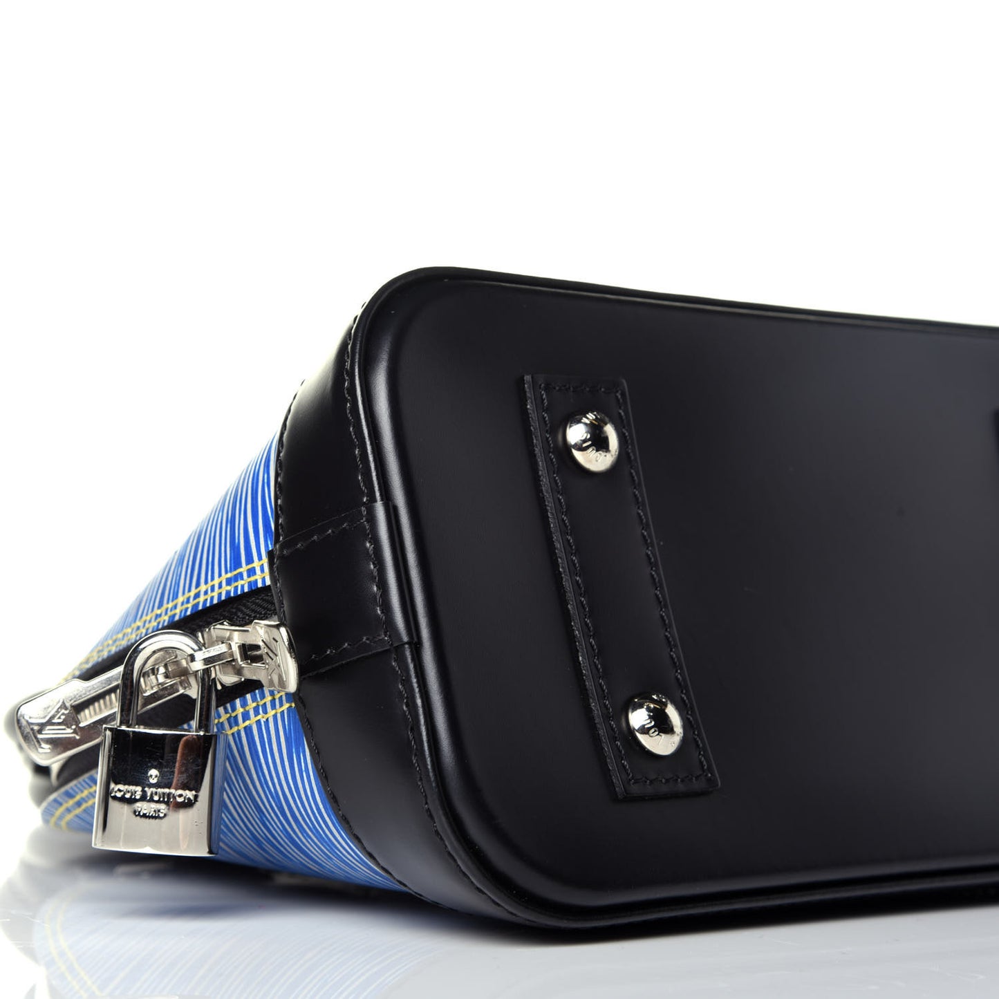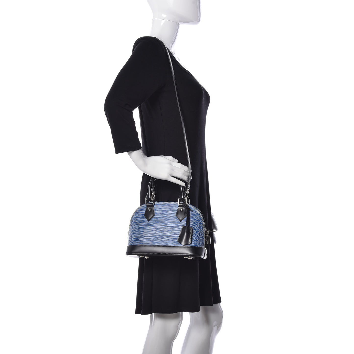 This is an authentic LOUIS VUITTON Epi Alma BB in Denim Light. This stylish tote is crafted of Louis Vuitton signature textured epi leather in denim blue. This classic bag features a detachable leather cross body shoulder strap, black rolled leather top handles, a black bottom trim and base, and silver hardware. The structured zippered top opens to a black microfiber interior with a patch pocket.