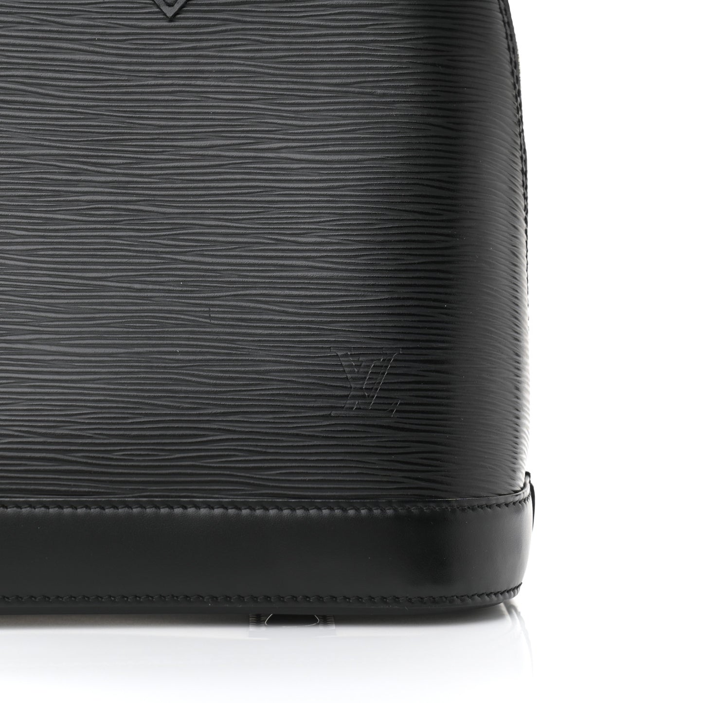 This is the authentic LOUIS VUITTON Epi Alma MM in Black. This is a bag that is crafted of Louis Vuitton signature textured epi leather in black. The bag features cowhide rolled leather top handles and trim with polished silver hardware including handle rings and a double zipper. This opens to a gray microfiber interior with patch pockets.Follow this item for alerts. Louis Vuitton is a registered trademark of Louis Vuitton. FASHIONPHILE is not affiliated with Louis Vuitton.
