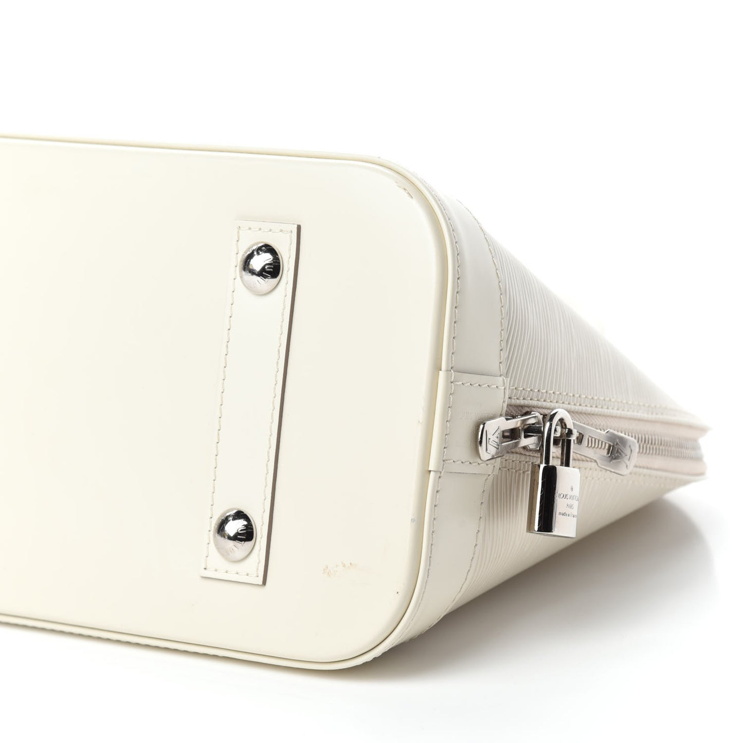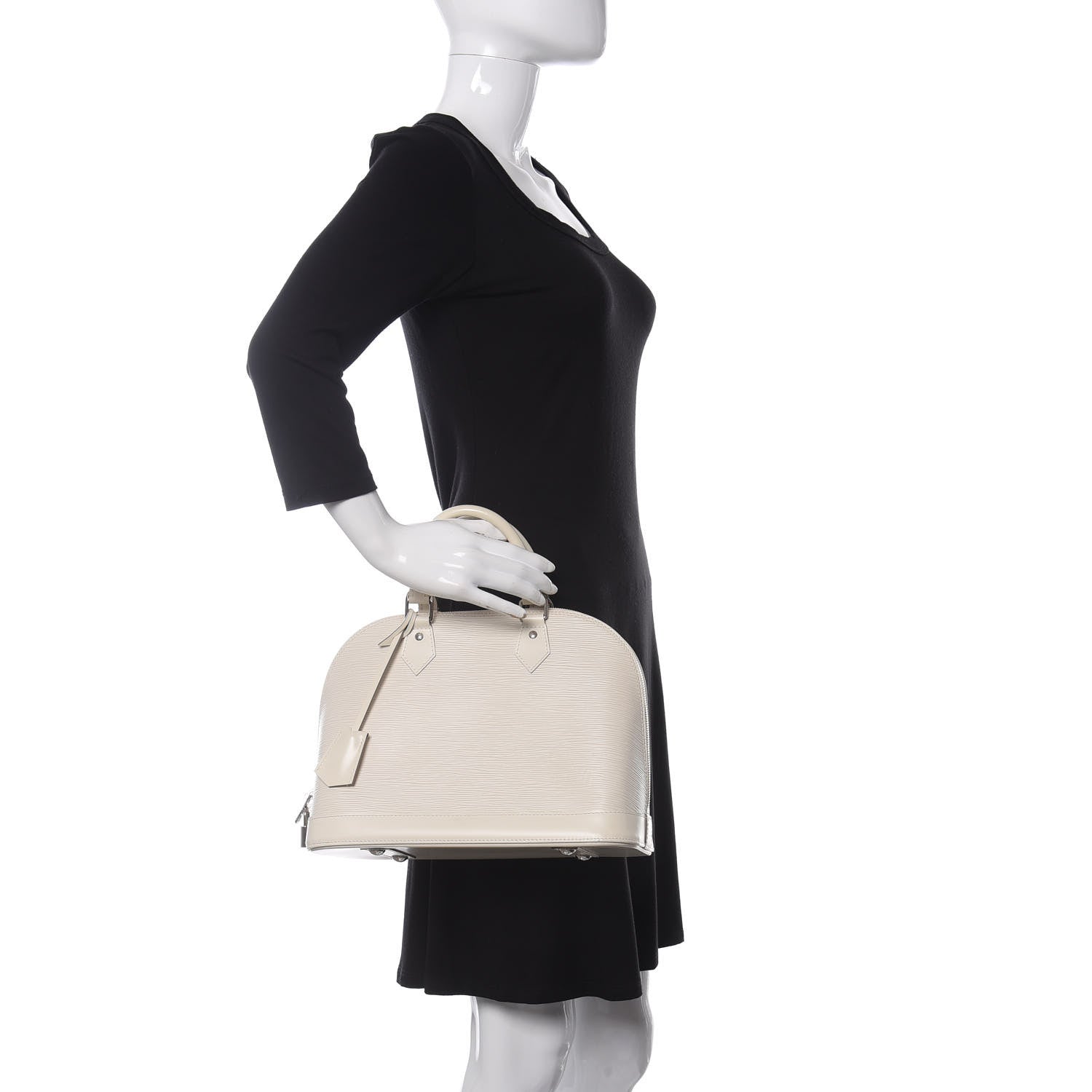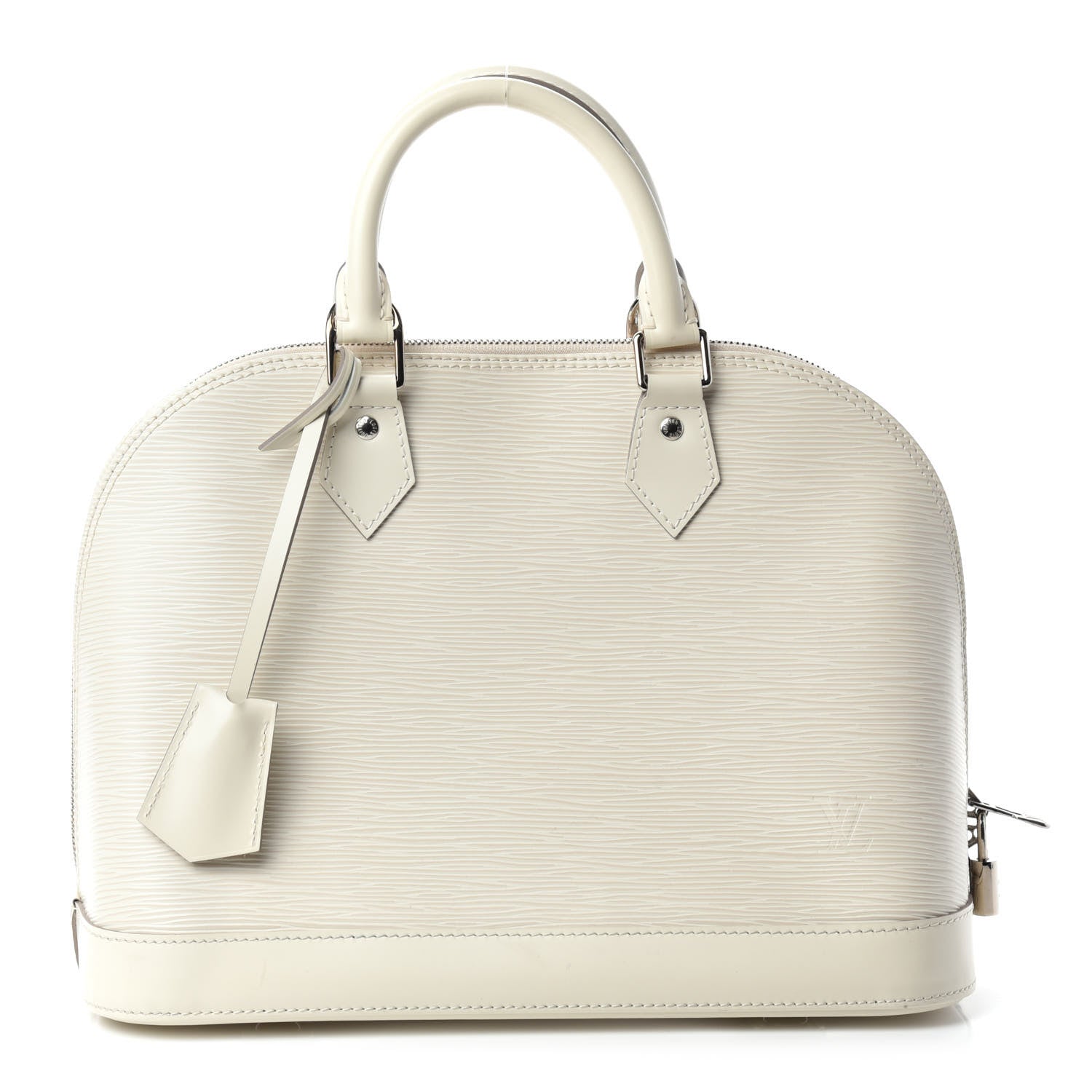 This is the authentic LOUIS VUITTON Epi Alma PM in Ivory. This stylish bowler style tote is created out of Louis Vuitton signature textured epi leather in an off white. The bag features strong ivory cowhide rolled leather top handles and trim with polished silver hardware. The zipper opens to a light gray microfiber interior with patch pockets.Follow this item for alerts. Louis Vuitton is a registered trademark of Louis Vuitton. FASHIONPHILE is not affiliated with Louis Vuitton.