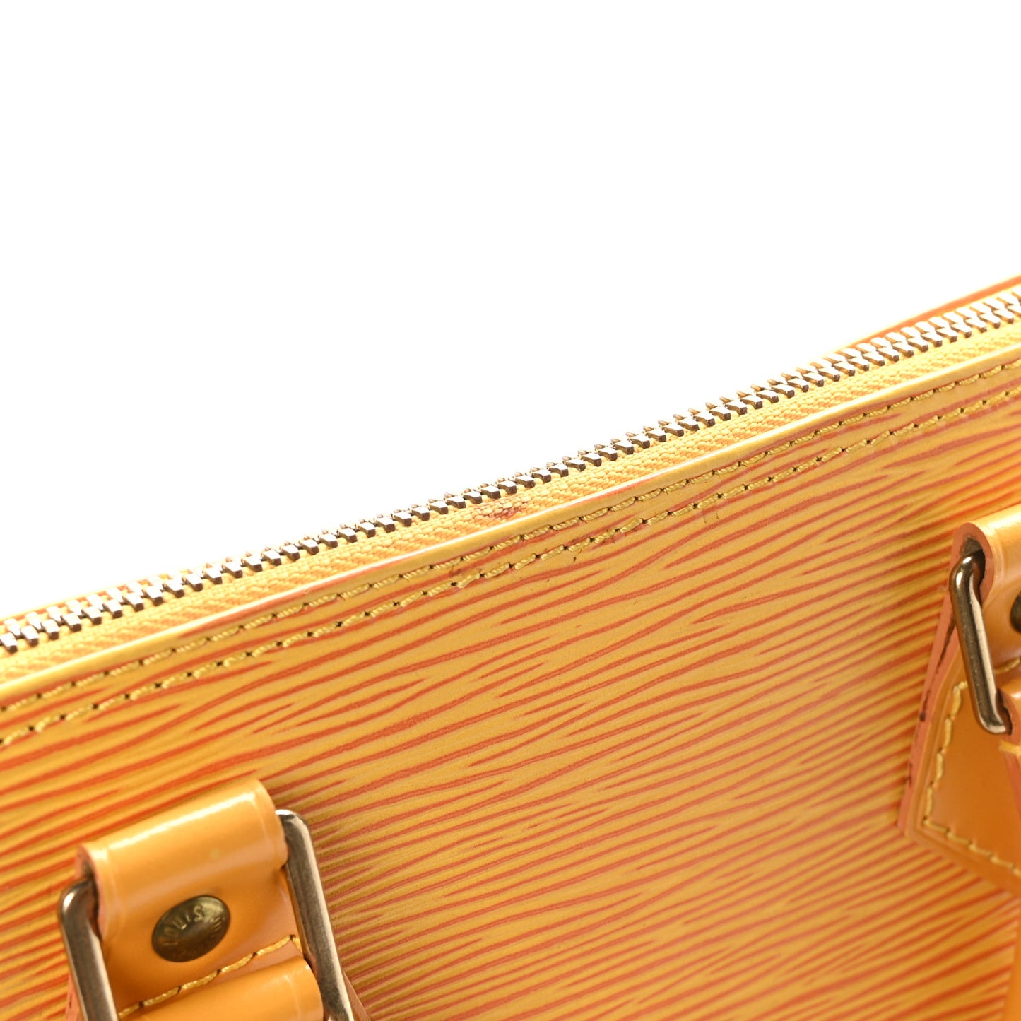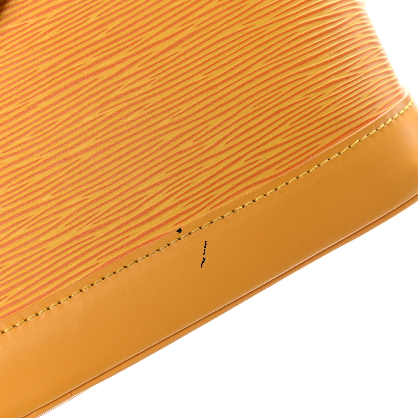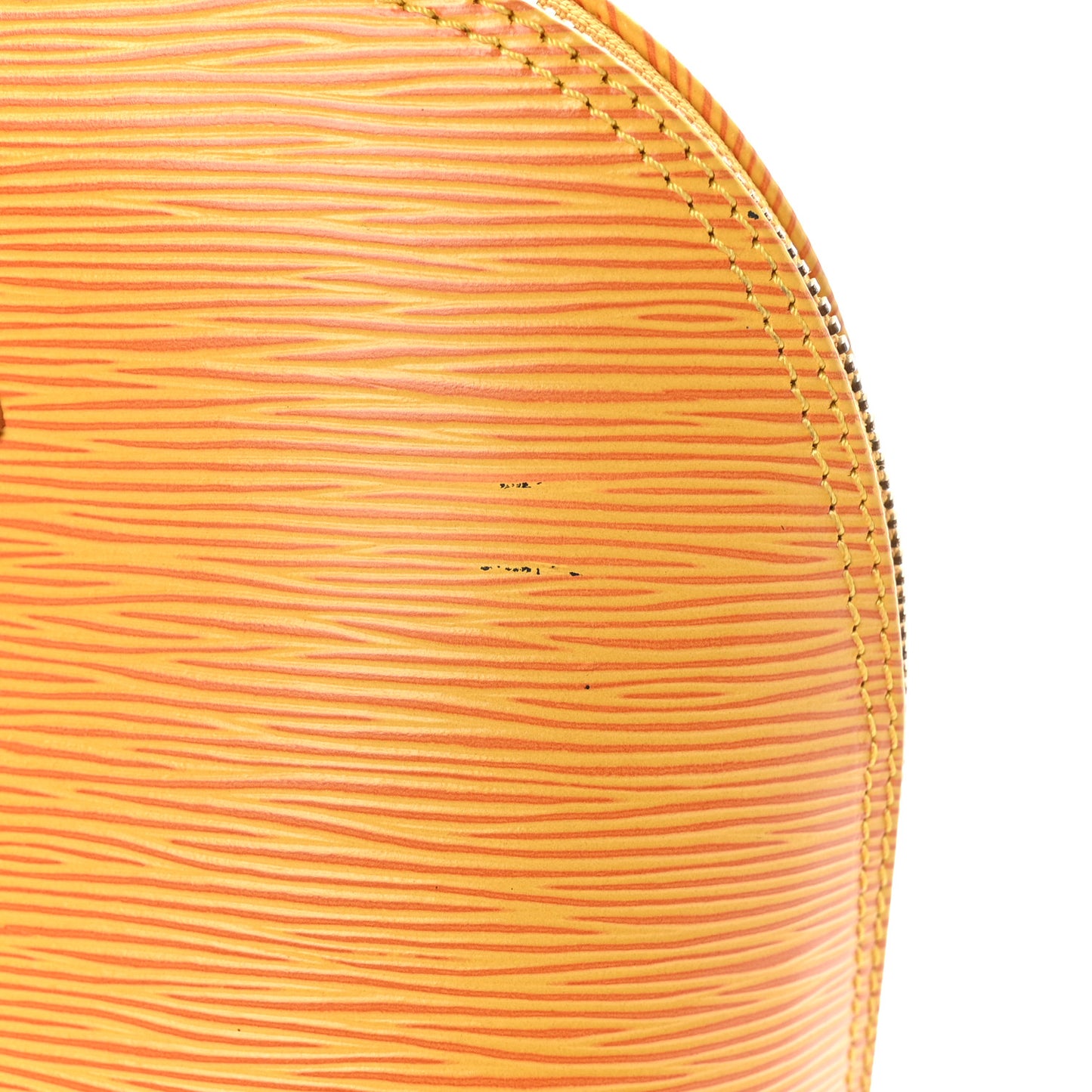 This is the authentic LOUIS VUITTON Epi Alma PM in Tassil. This stylish bowler style handbag is crafted of Louis Vuitton's signature textured epi leather in yellow. The bag features smooth, rolled cowhide leather top handles and trim with polished brass hardware. The top zippers open to a purple microfiber interior with a slip pocket.Follow this item for alerts. Louis Vuitton is a registered trademark of Louis Vuitton. FASHIONPHILE is not affiliated with Louis Vuitton.
