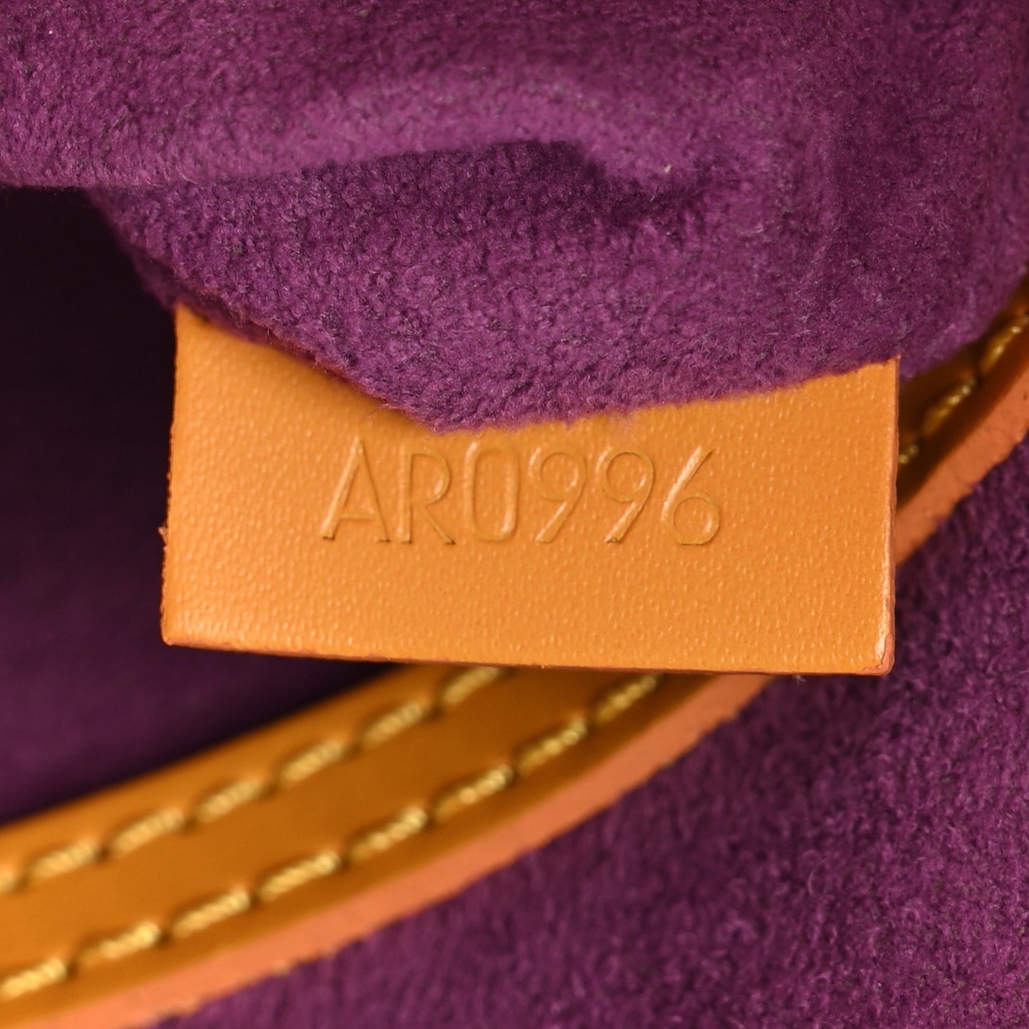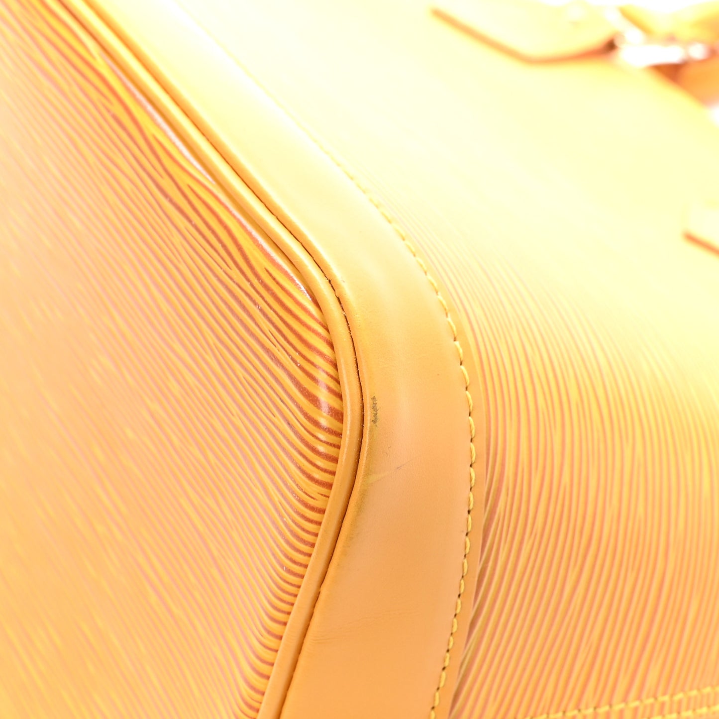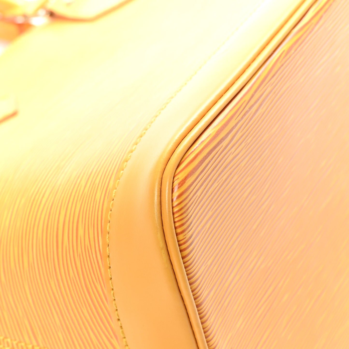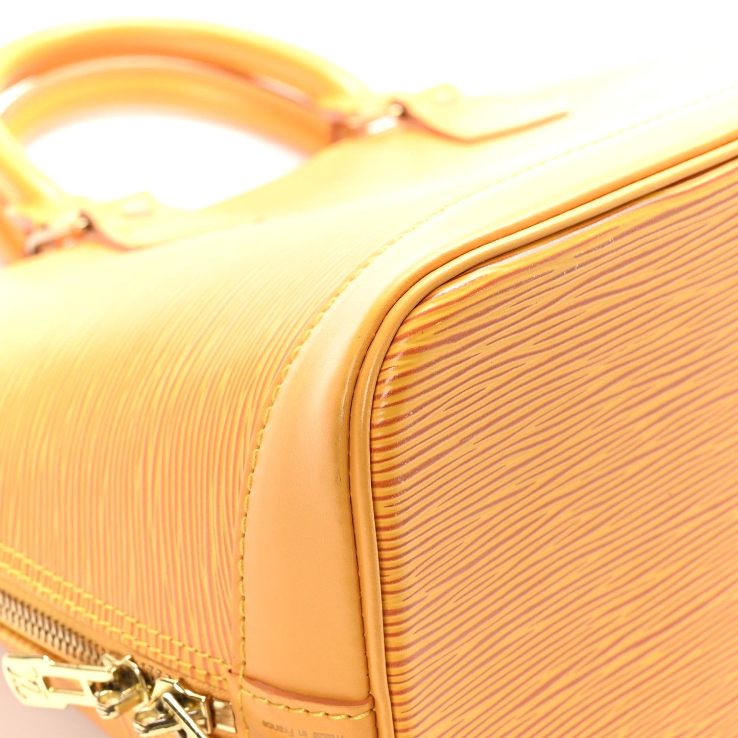 This is the authentic LOUIS VUITTON Epi Alma PM in Tassil. This stylish bowler style handbag is crafted of Louis Vuitton's signature textured epi leather in yellow. The bag features smooth, rolled cowhide leather top handles and trim with polished brass hardware. The top zippers open to a purple microfiber interior with a slip pocket.Follow this item for alerts. Louis Vuitton is a registered trademark of Louis Vuitton. FASHIONPHILE is not affiliated with Louis Vuitton.