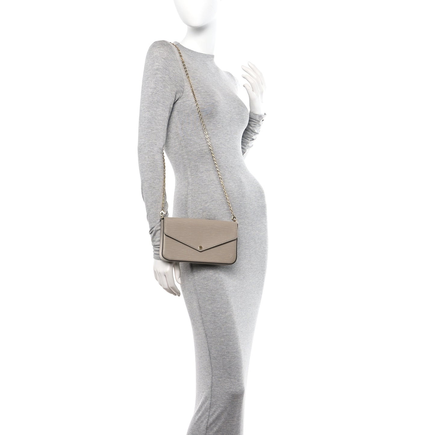 This is an authentic LOUIS VUITTON Epi Felicie Pochette Chain Wallet in Galet. This stylish wallet is crafted of Louis Vuitton epi leather in light taupe. The shoulder bag features a lovely optional polished gold chain link shoulder strap and an envelope-style flap. This opens with a snap to a matching microfiber interior with a patch pocket and 2 removable inserts.Follow this item for alerts. Louis Vuitton is a registered trademark of Louis Vuitton. FASHIONPHILE is not affiliated with Louis Vuitton.