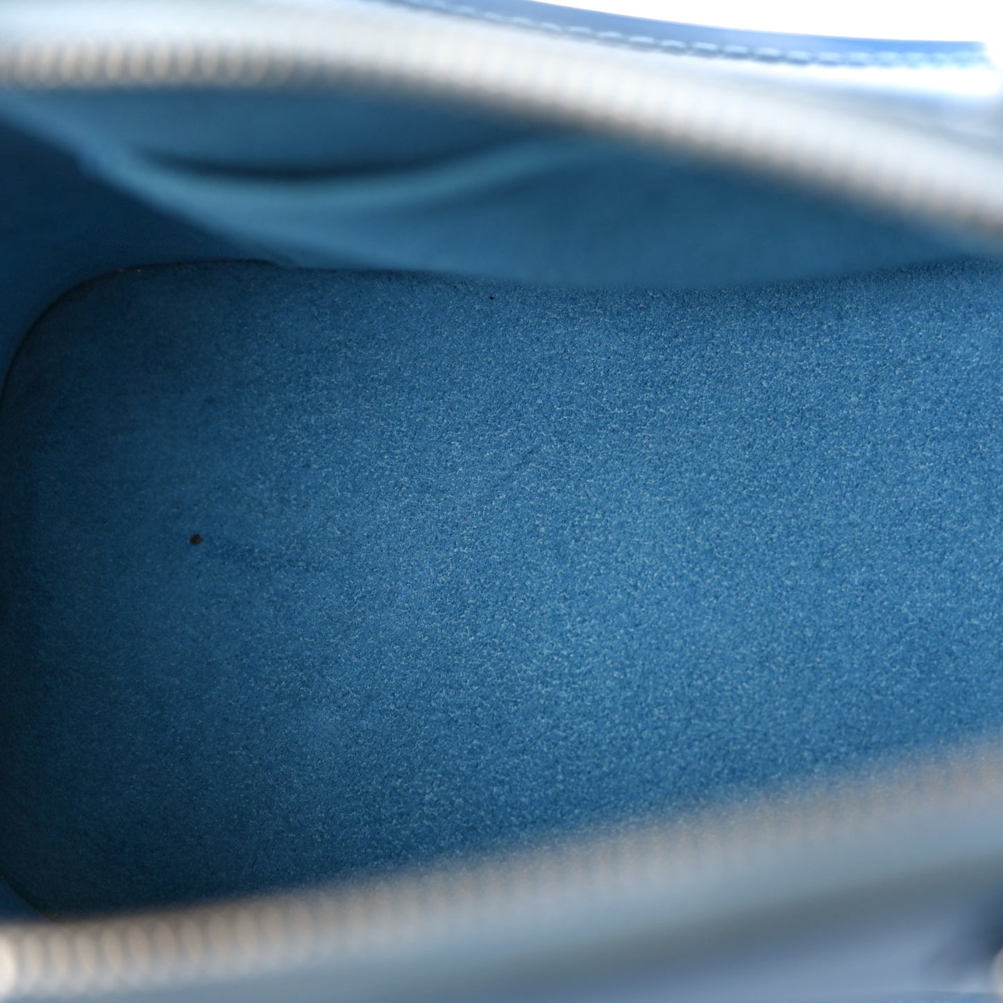 This is an authentic LOUIS VUITTON Epi Jacquard Alma BB in Bleuet. This is a chic bag created of Louis Vuitton signature textured epi leather in baby blue. The handbag features cowhide rolled leather top handles, an optional top strap and trim with polished silver hardware. The bag opens to a blue microfiber interior with a patch pocket.