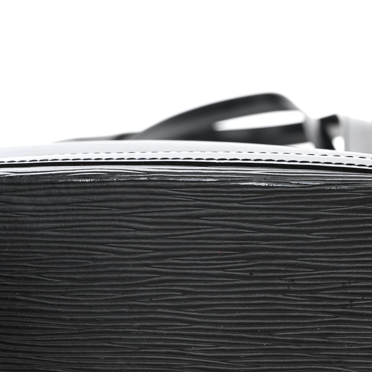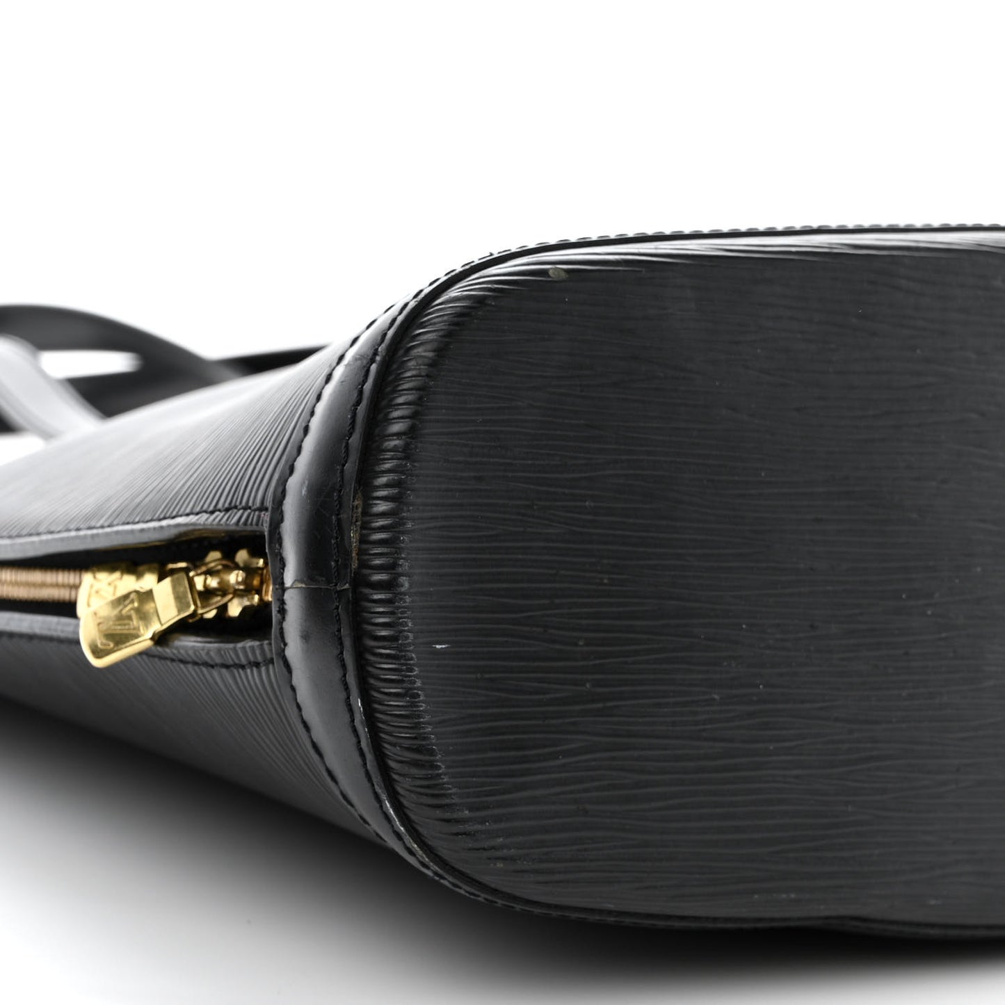 This is an authentic LOUIS VUITTON Epi Lussac in Black. This is a large shoulder bag with a unique silhouette, crafted of Louis Vuitton signature textured epi leather in black. The bag features smooth matching black leather shoulder straps and trim. The gold tone wrap-around zippers open the bag to a grey microfiber interior with zipper and patch pockets.