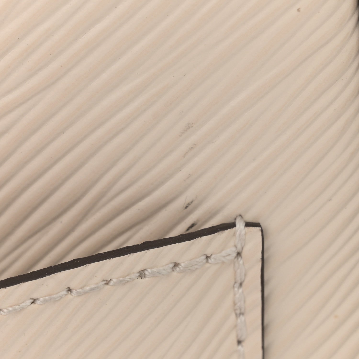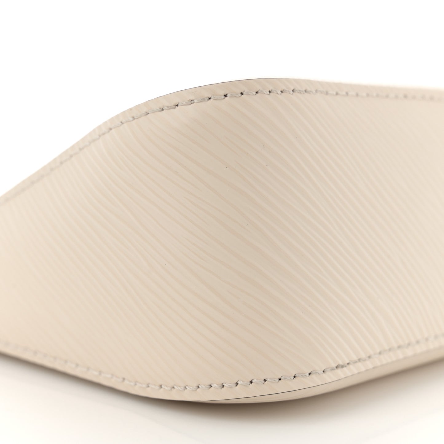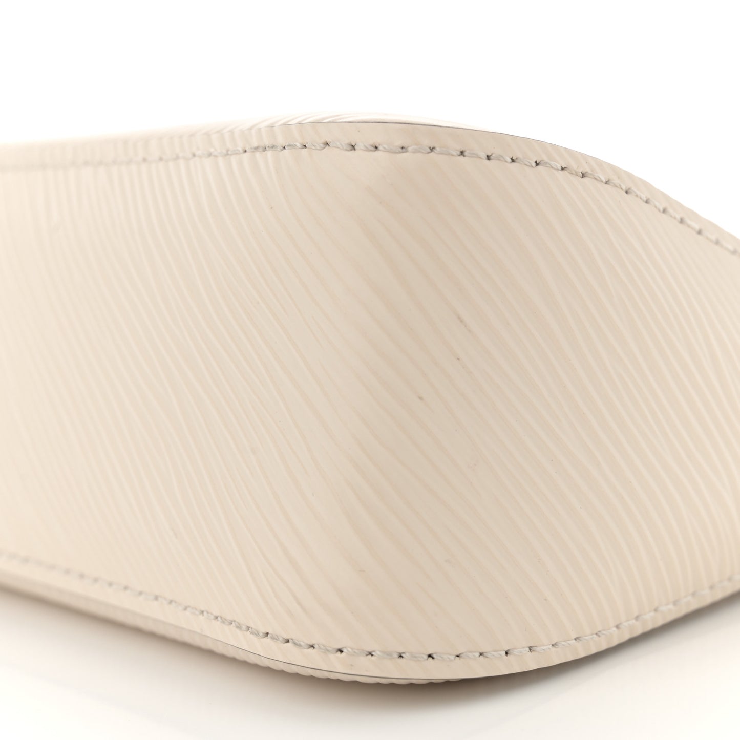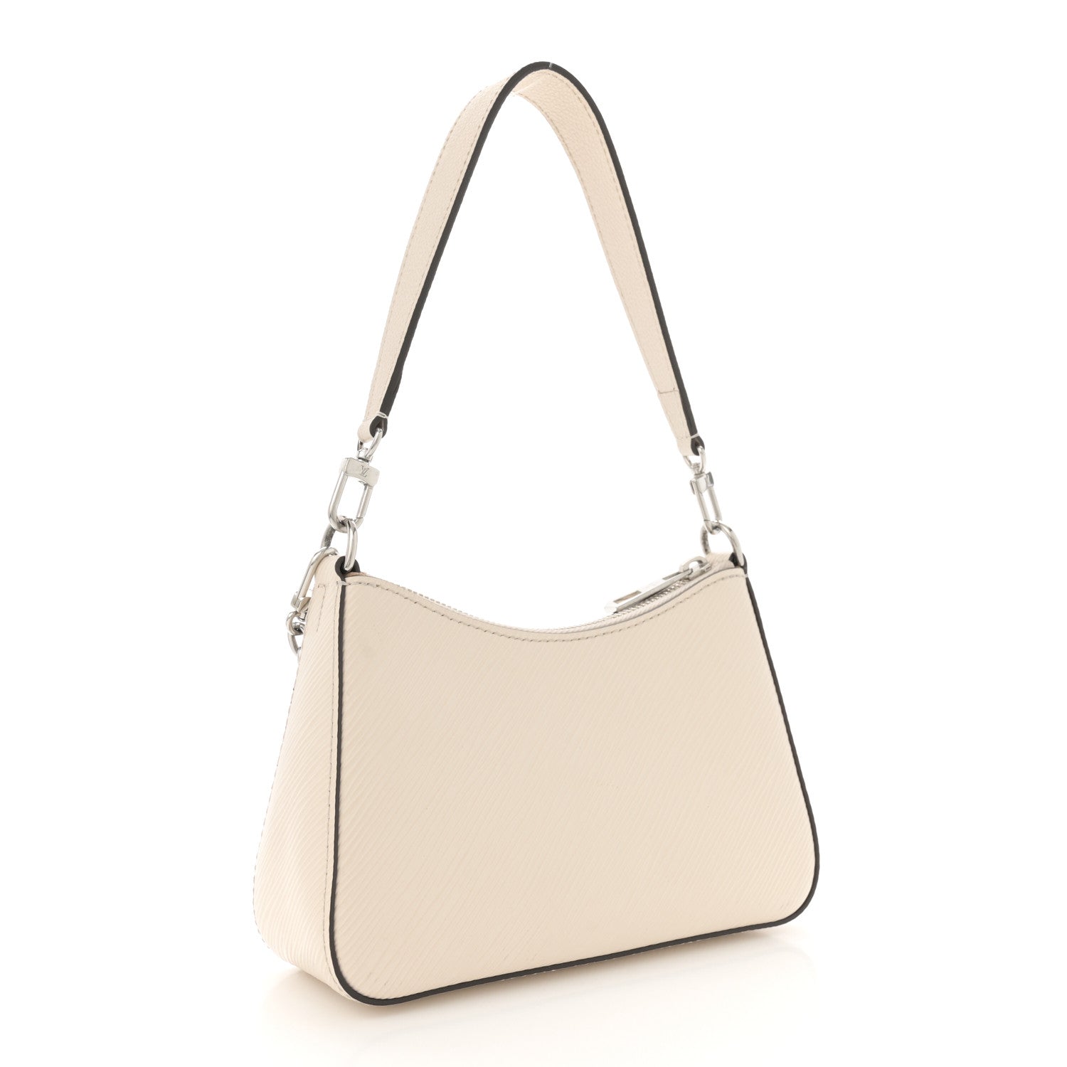 This is an authentic LOUIS VUITTON Epi Marellini Quartz. This stylish baguette is crafted of Louis Vuitton's signature textured Epi leather in ivory. The bag features a matching epi coin purse, a leather top handle and a front pocket with a mirror, and silver hardware. The top zipper opens to a beige microfiber interior with a patch pocket.Follow this item for alerts. Louis Vuitton is a registered trademark of Louis Vuitton. FASHIONPHILE is not affiliated with Louis Vuitton.