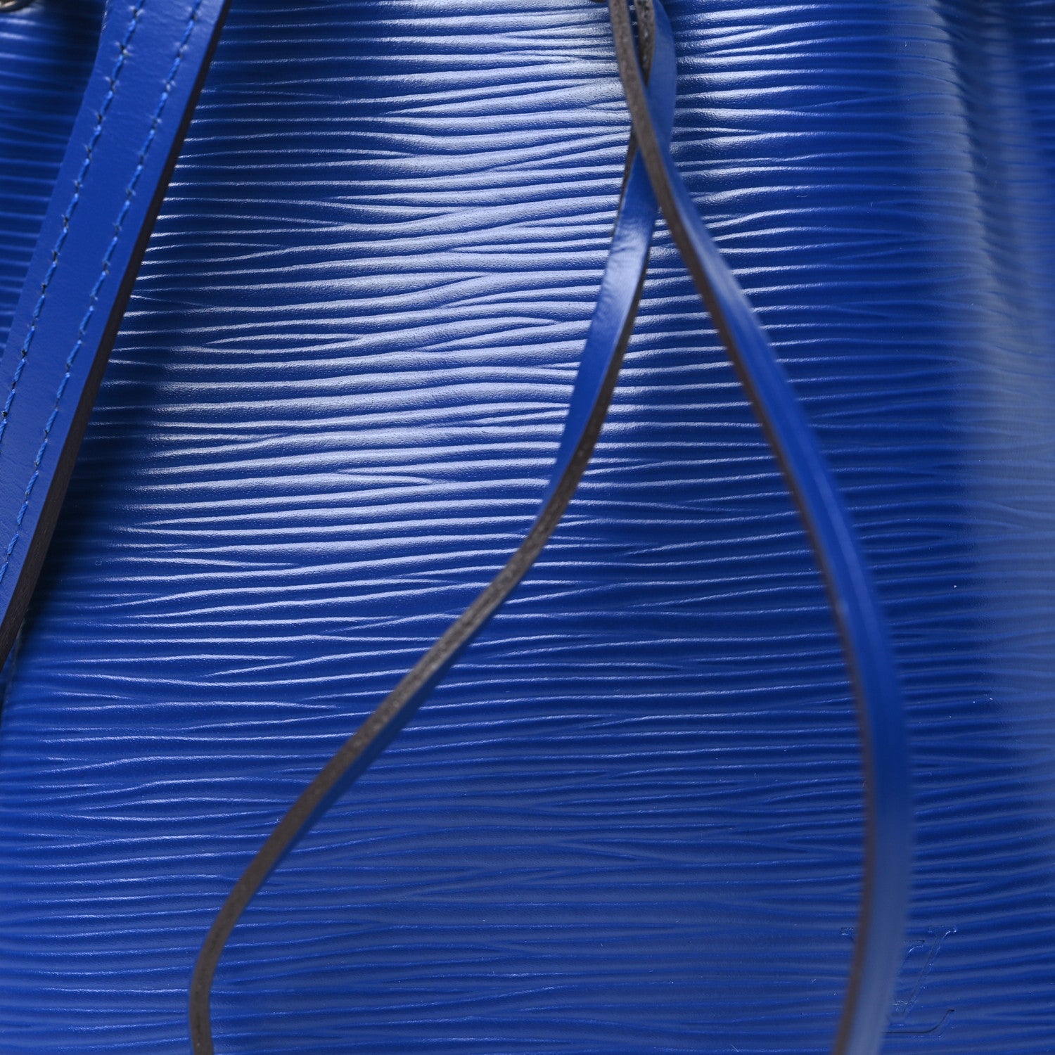 This is an authentic LOUIS VUITTON Epi Nano Noe in Blueberry. This petite Louis Vuitton bucket style handbag is crafted of traditional Louis Vuitton epi leather in dark blue. This bag features a leather including a shoulder strap, a cinch cord and piping with silver tone hardware. The top opens to a matching blue microfibre interior.