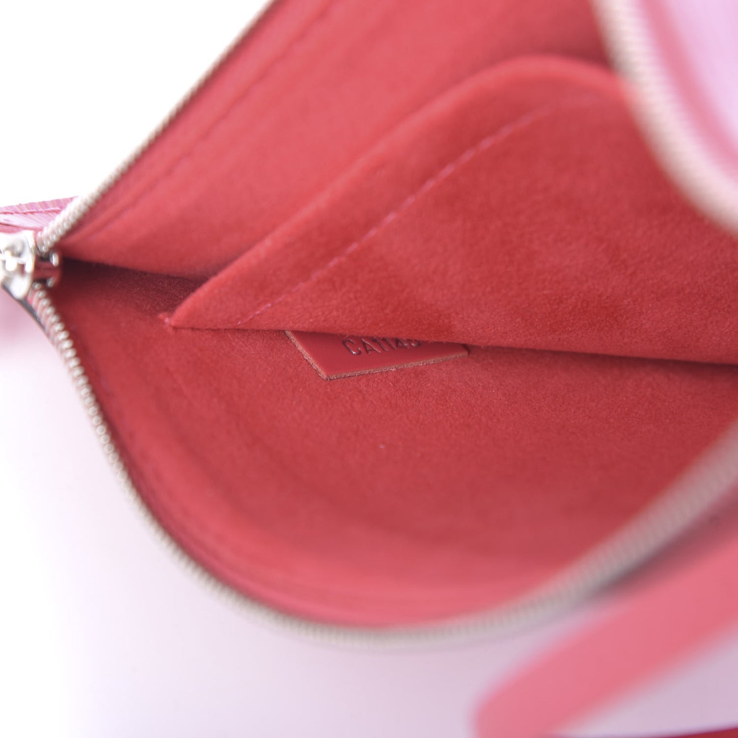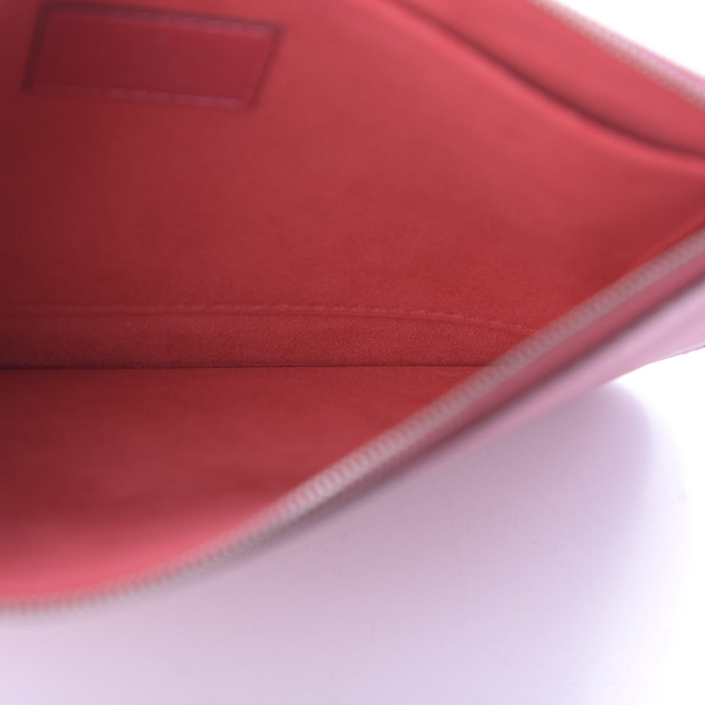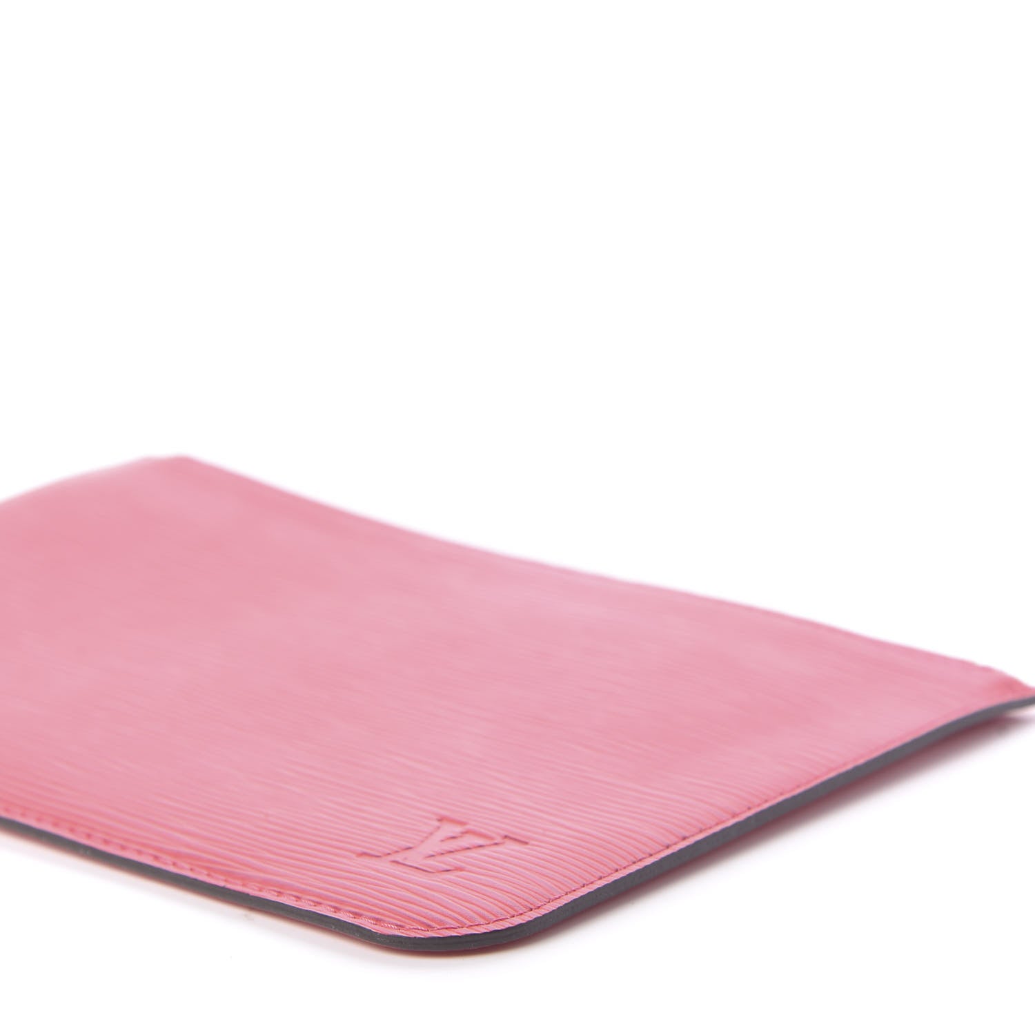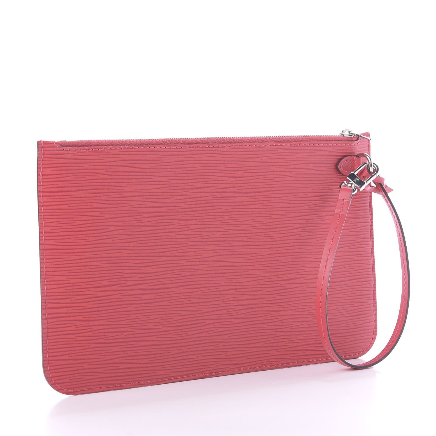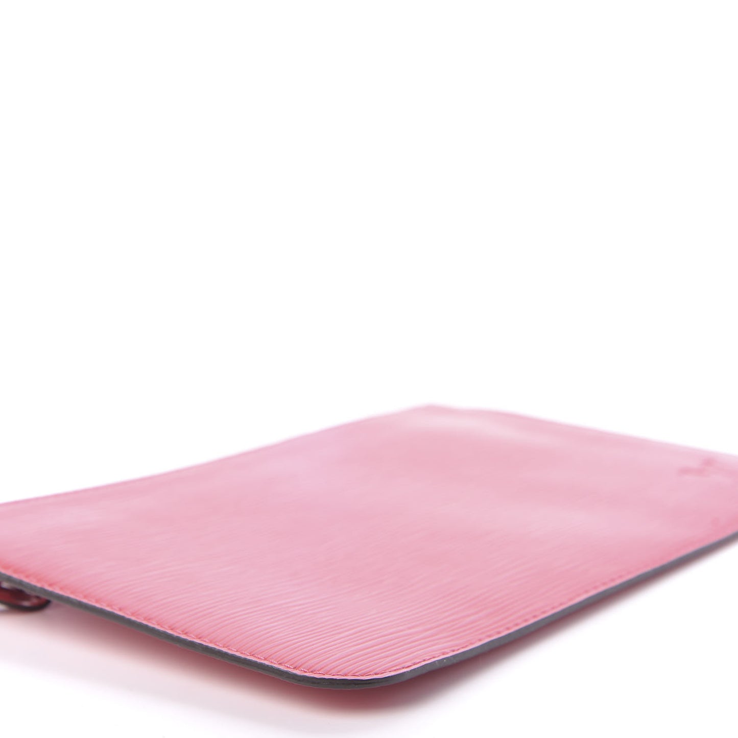 This is an authentic LOUIS VUITTON Epi Neverfull MM GM Pochette in Grenade. For those everyday essentials, this is made of Louis Vuitton epi textured in red with a matching leather wrist strap for convenience. The top zipper opens to a matching fabric interior with a flat pocket. This is an ideal case for travel of all sorts, for cosmetics and accessories, with the luxury and style from Louis Vuitton.
