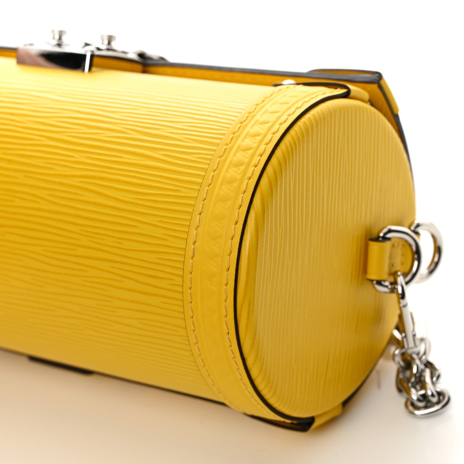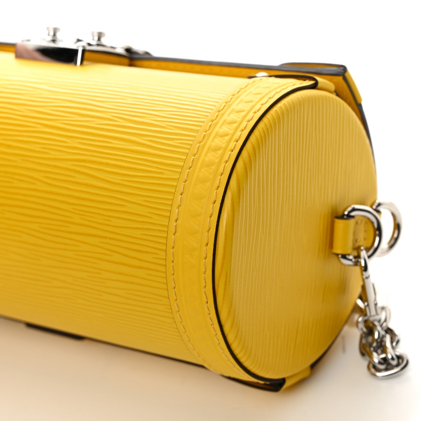 This is an authentic LOUIS VUITTON Epi Papillon Trunk in Jaune. This chic trunk bag is crafted of vibrant yellow epi textured leather. The bag features a removable silver chain strap, a removable, adjustable smooth yellow leather strap, and silver hardware. The silver s-lock opens the bag to a dark pink microfiber interior.