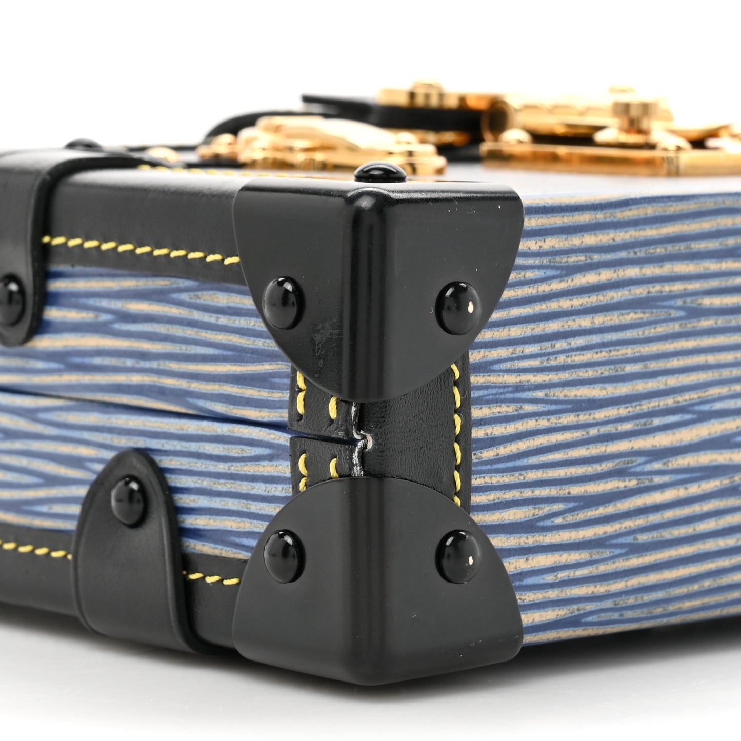 This is an authentic LOUIS VUITTON Epi Petite Malle in Denim Light. This stylish structured hand bag is crafted of Louis Vuitton signature textured Epi leather in sky blue. The bag features an optional leather versatile cross-body shoulder strap that may be removed and be used as a clutch. Throughout the bag is a decorative black leather trim at all corners detailed with black studs. This durable bag also features brass buckles and a cross over leather strap with a polished brass press-lock that opens to a beige leather interior with a pocket.Follow this item for alerts. Louis Vuitton is a registered trademark of Louis Vuitton. FASHIONPHILE is not affiliated with Louis Vuitton.