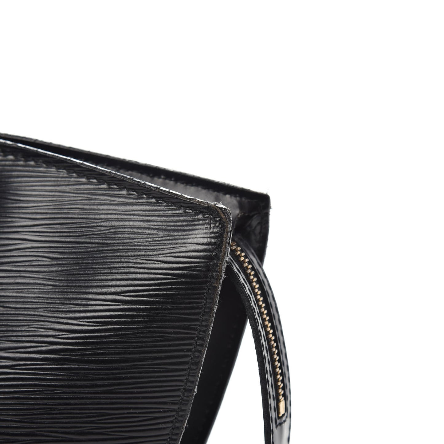 This is an authentic LOUIS VUITTON Epi Saint Jacques PM in Black. This chic shoulder bag is crafted of Louis Vuitton's signature textured epi leather in black. The bag features smooth leather strap handles and an overextended brass top zipper that opens to a grey microfiber interior with a patch pocket. This is a gorgeous bag with the luxury and style of Louis Vuitton!Follow this item for alerts. Louis Vuitton is a registered trademark of Louis Vuitton. FASHIONPHILE is not affiliated with Louis Vuitton.