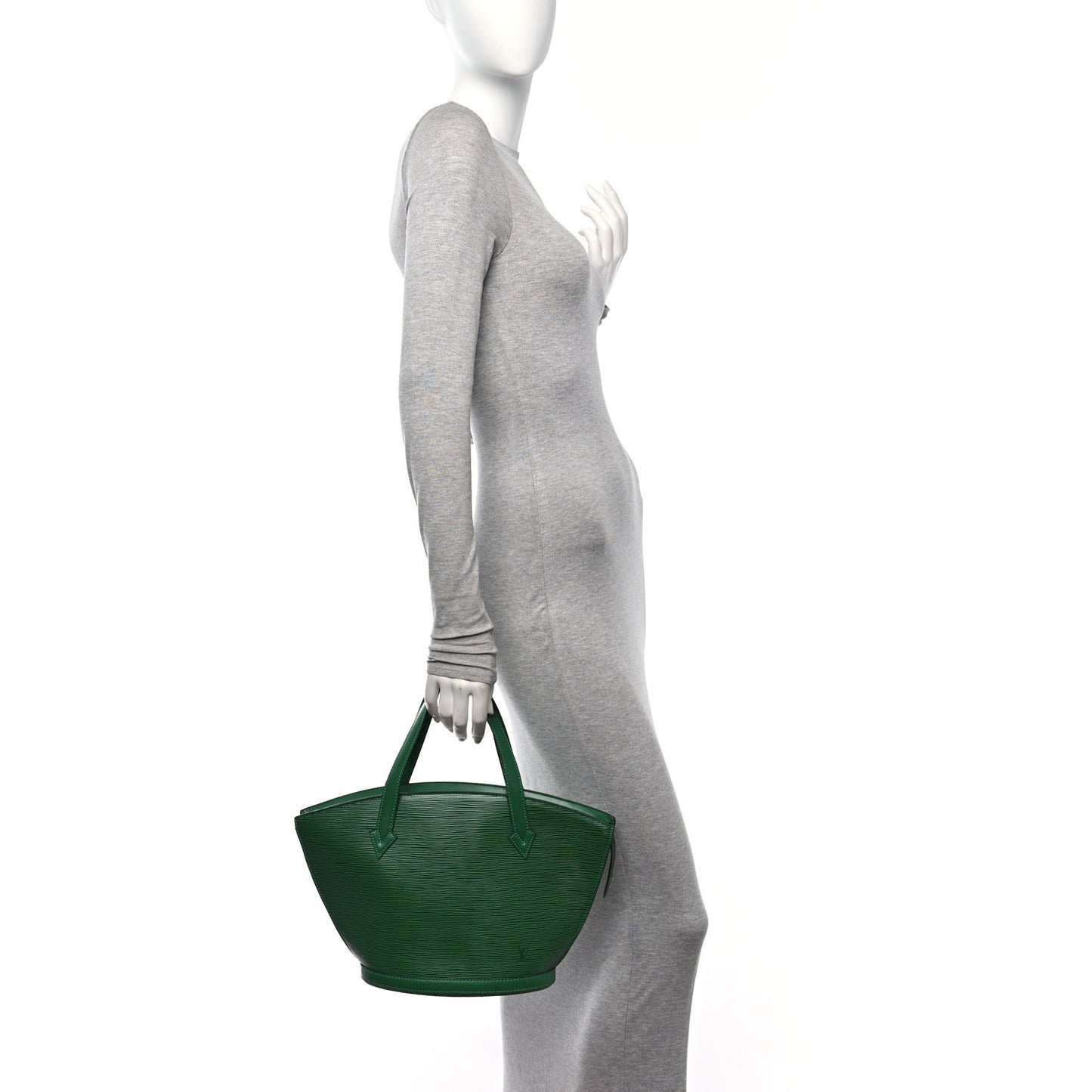 This is an authentic LOUIS VUITTON Epi Saint Jacques PM in Borneo. This is a stylish structured tote that is crafted of sturdy Louis Vuitton signature textured epi leather in green. This shoulder bag has matching polished cowhide leather trim including strap handles, zipper lining, and base edge. There is an overextended gold top zipper that opens to a microsuede fabric interior with a patch pocket.