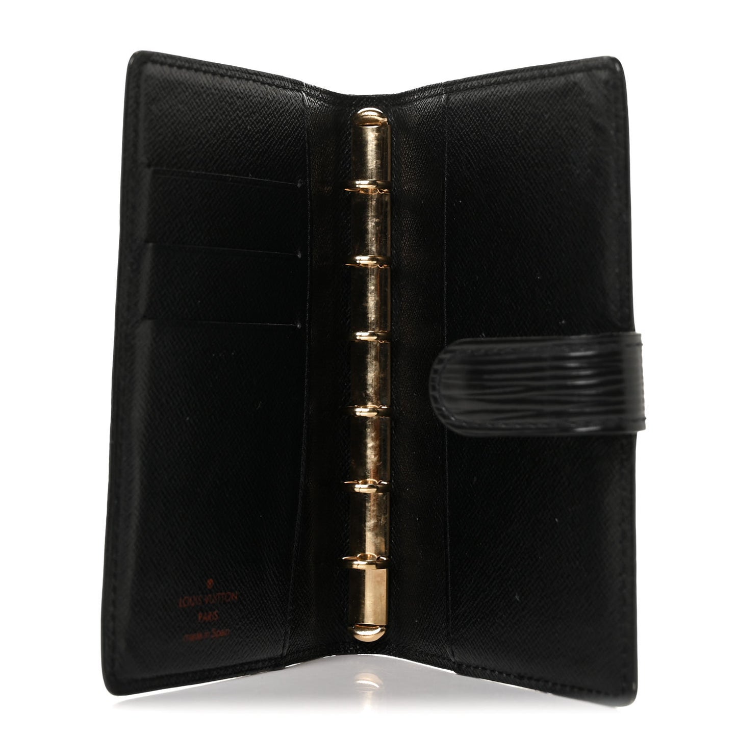 This is the authentic LOUIS VUITTON Epi Small Ring Agenda Cover in Black. This is an Epi agenda cover for your organizing needs. The agenda is crafted of Louis Vuitton signature textured Epi leather in black with a cross over snap closure. This opens to a crossgrain black leather interior with card slots, patch pockets, and gold rings for inserts.Follow this item for alerts. Louis Vuitton is a registered trademark of Louis Vuitton. FASHIONPHILE is not affiliated with Louis Vuitton.