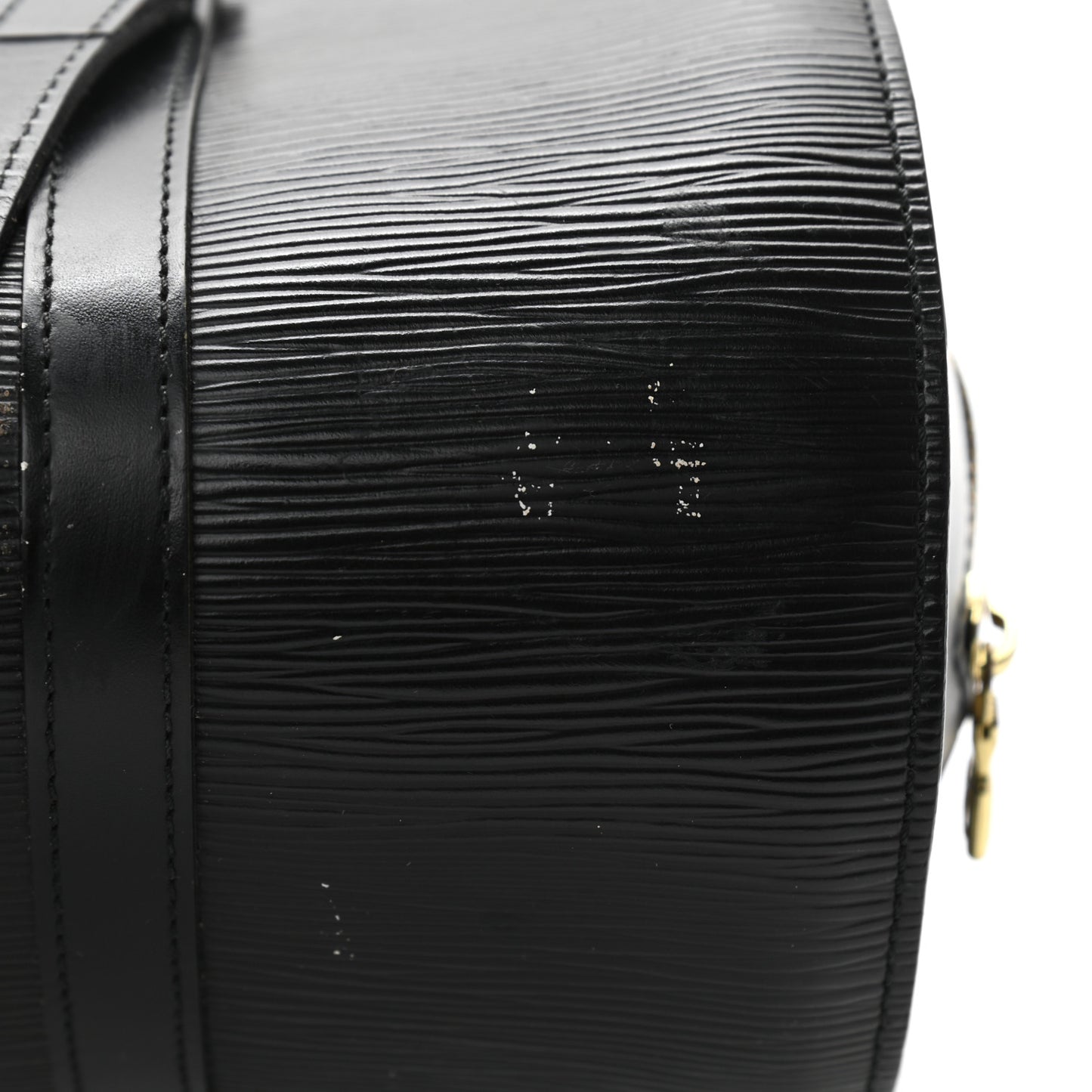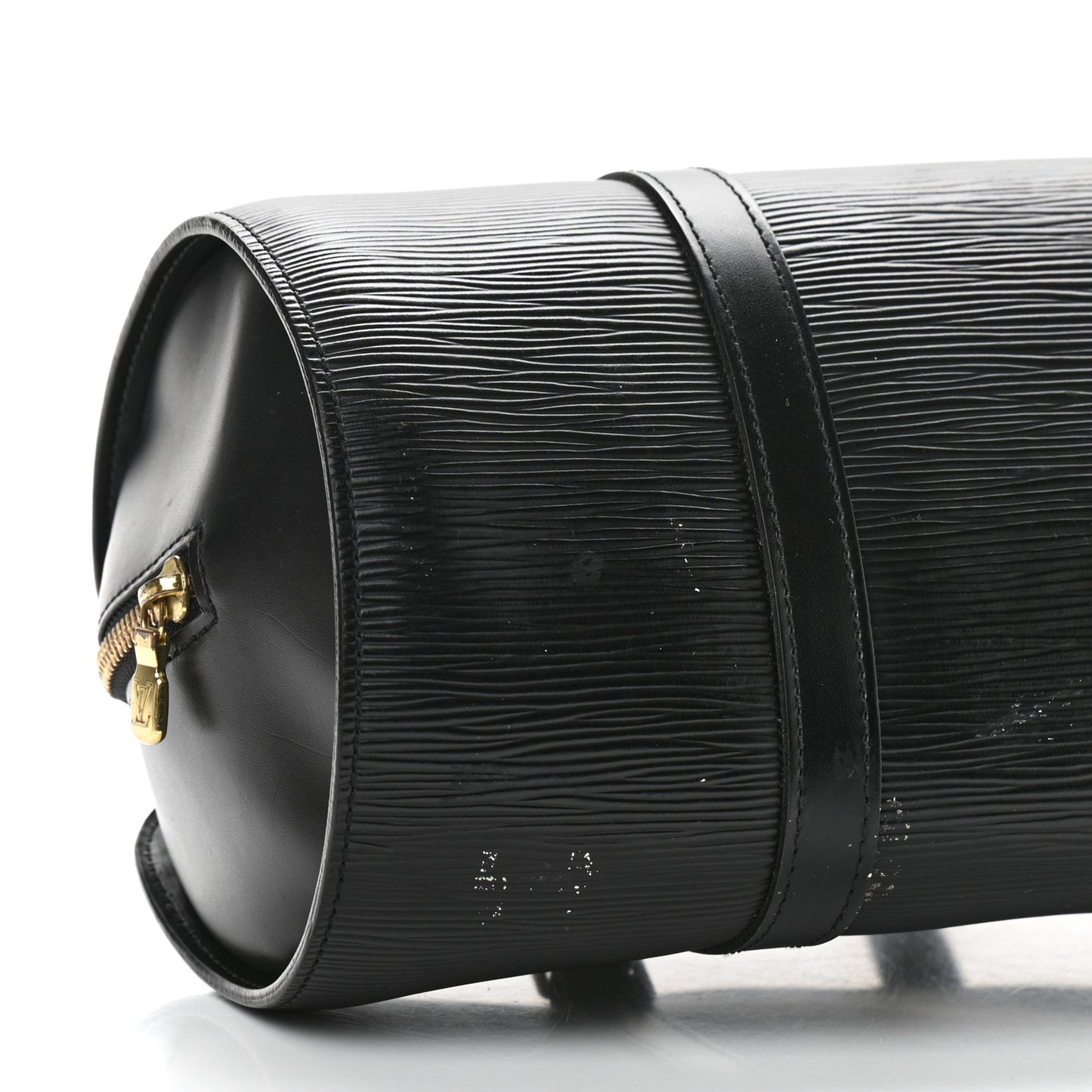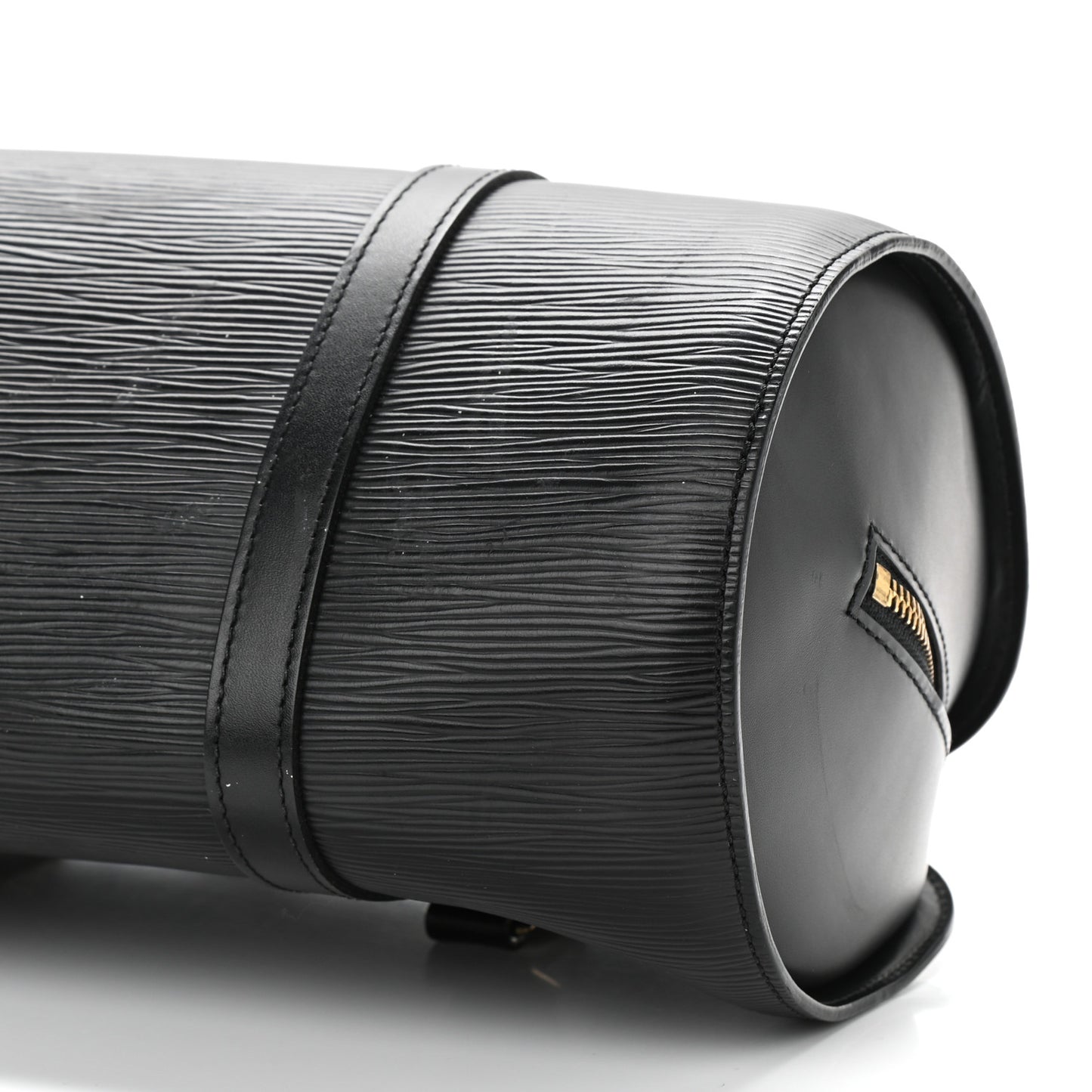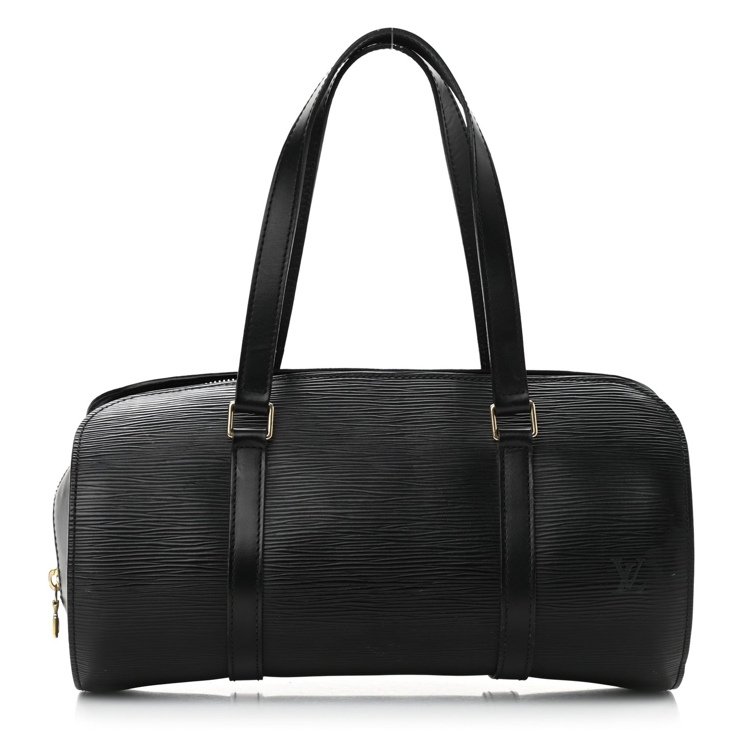 This is an authentic LOUIS VUITTON Epi Soufflot in Black. This barrel style handbag is crafted of signature Louis Vuitton textured epi leather in black. This handbag features leather piping and trim that extends into strap handles. The polished gold top zipper opens to a grey microfiber interior with a zipper pocket.Follow this item for alerts. Louis Vuitton is a registered trademark of Louis Vuitton. FASHIONPHILE is not affiliated with Louis Vuitton.