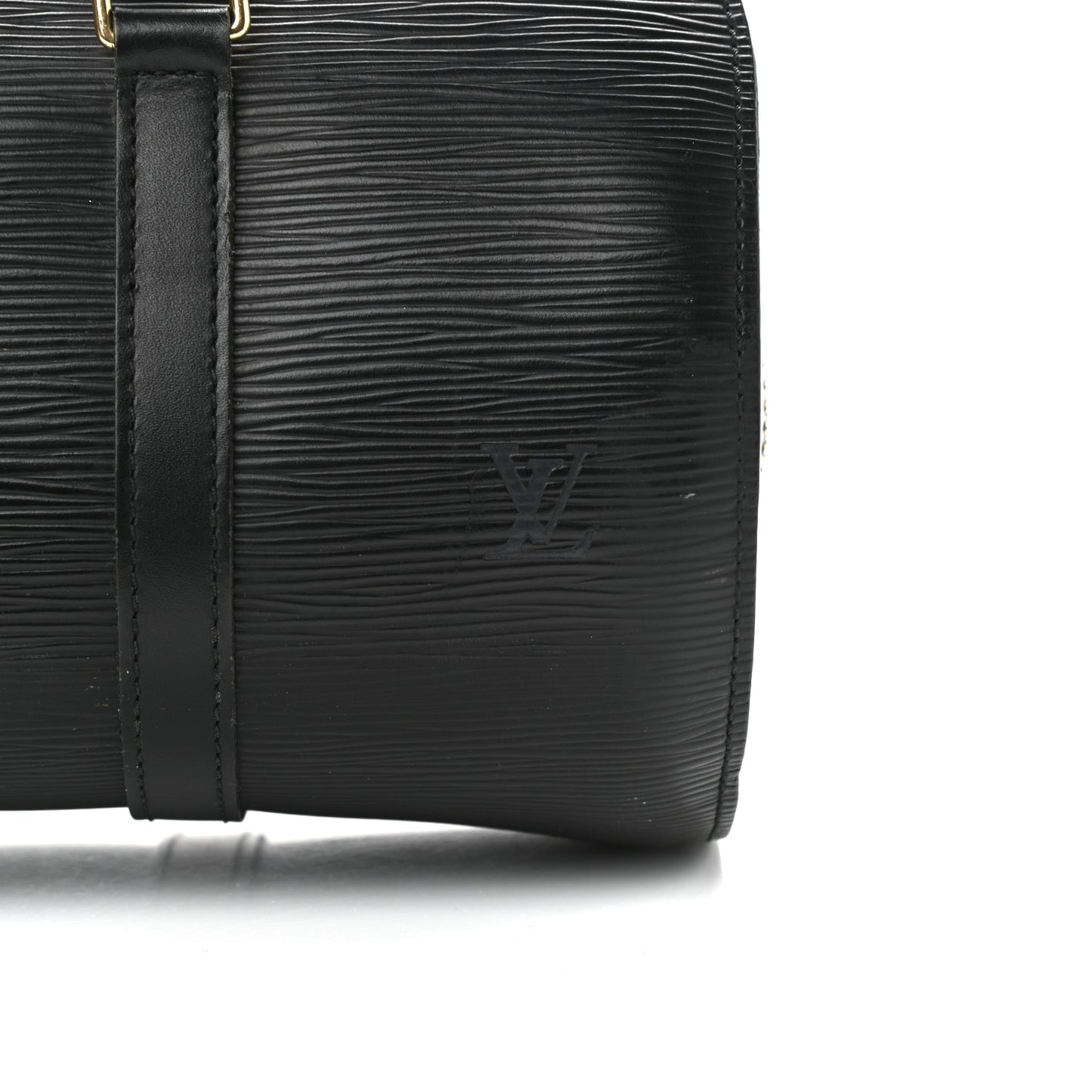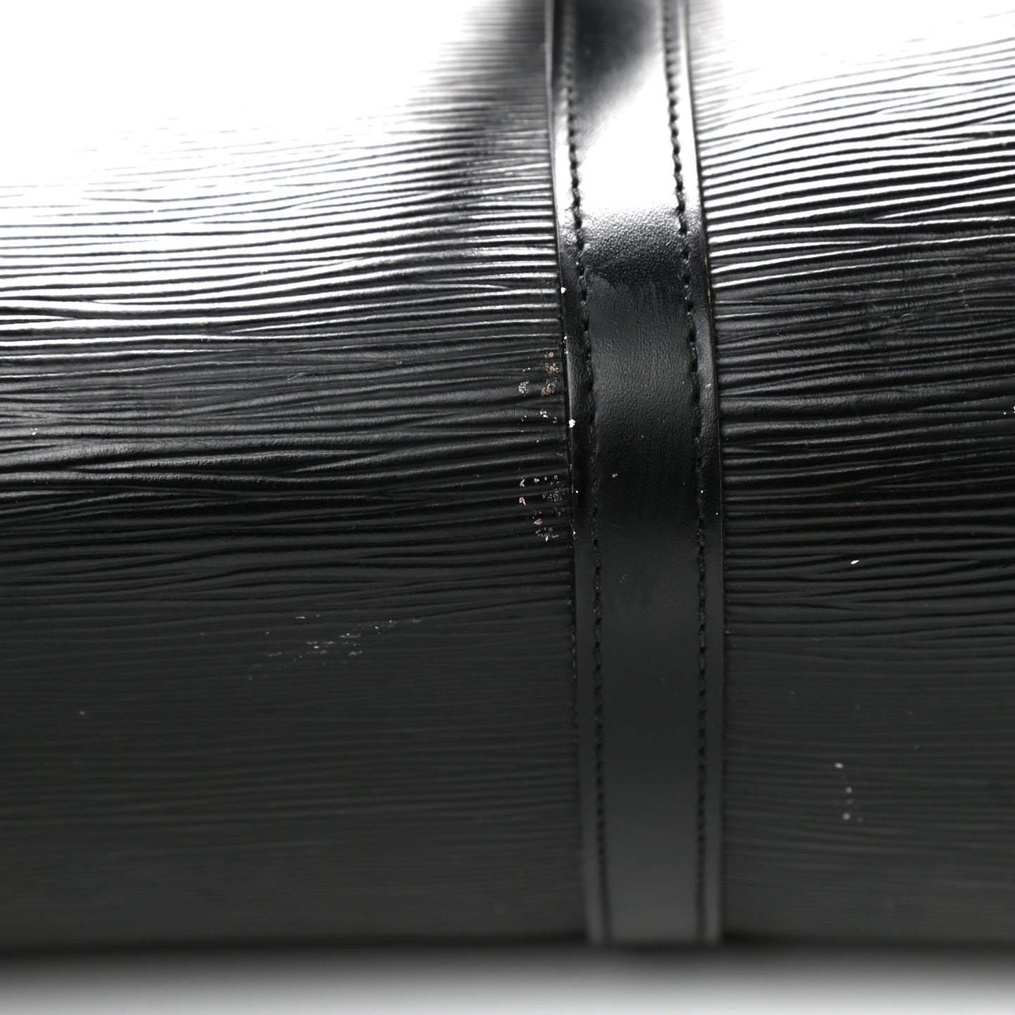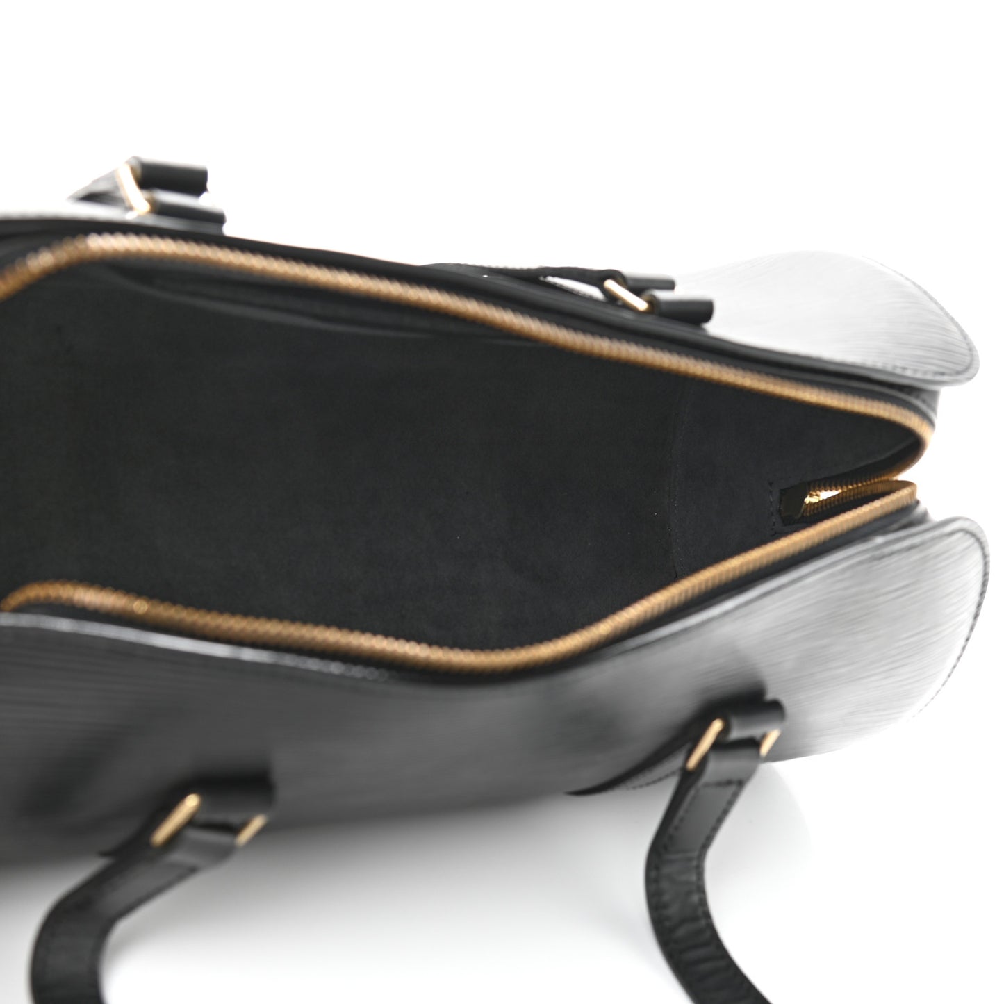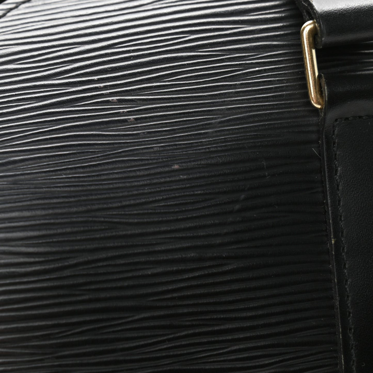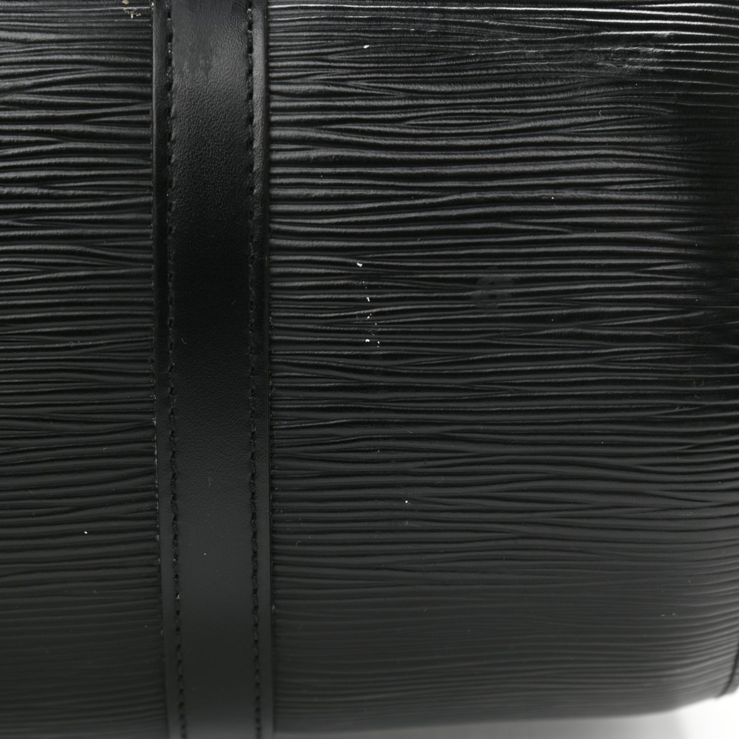 This is an authentic LOUIS VUITTON Epi Soufflot in Black. This barrel style handbag is crafted of signature Louis Vuitton textured epi leather in black. This handbag features leather piping and trim that extends into strap handles. The polished gold top zipper opens to a grey microfiber interior with a zipper pocket.Follow this item for alerts. Louis Vuitton is a registered trademark of Louis Vuitton. FASHIONPHILE is not affiliated with Louis Vuitton.