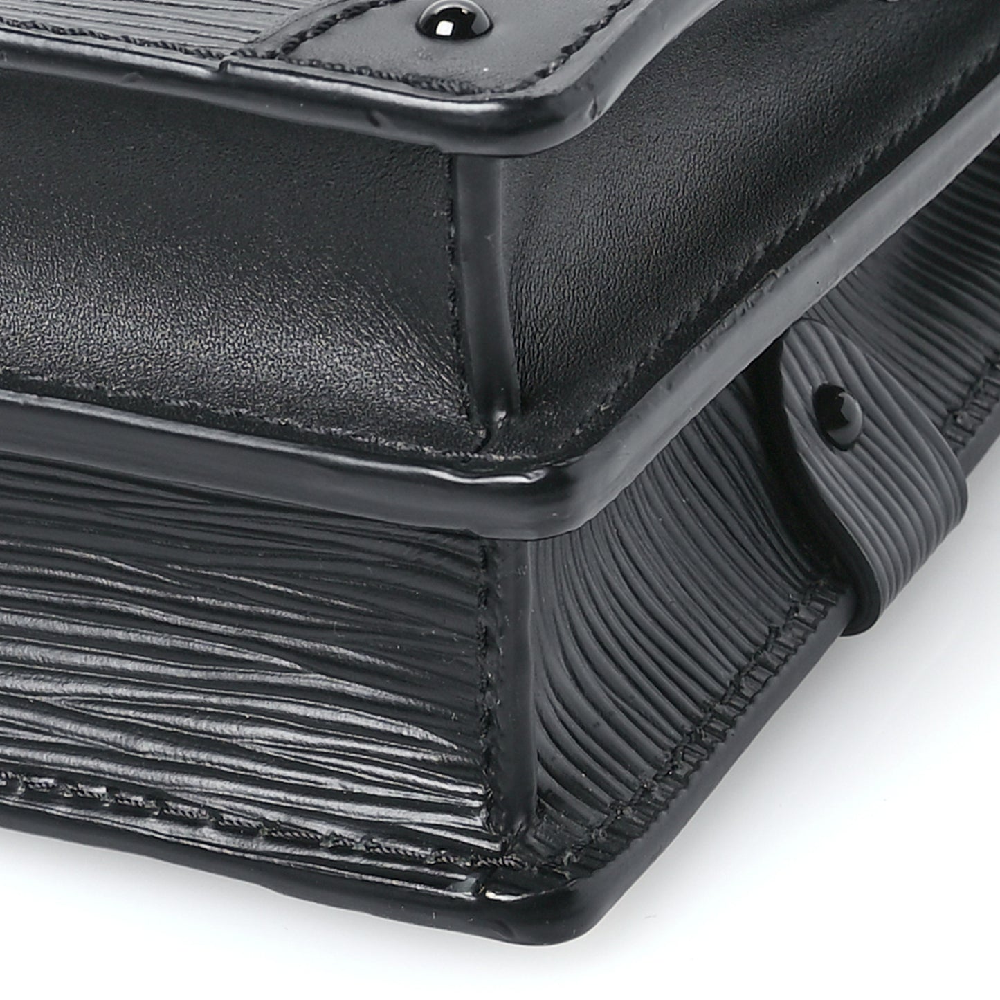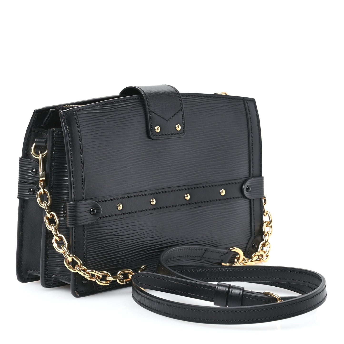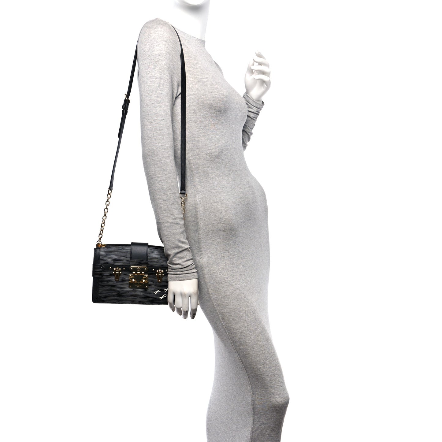 This is an authentic LOUIS VUITTON Epi Trunk Clutch in Black. This stylish trunk style shoulder bag is crafted of Louis Vuitton signature textured Epi leather in black. This bag features a removable cross body shoulder strap, golden brass hardware, black leather corners, fold-over strap with Louis Vuitton stamped S-lock closure, and a top zip closure. This opens to a leather interior lined in a beige lambskin leather with two interior compartments separated by a monogram wall, Malletage print at back and has an open slip pocket in the front compartment.Follow this item for alerts. Louis Vuitton is a registered trademark of Louis Vuitton. FASHIONPHILE is not affiliated with Louis Vuitton.