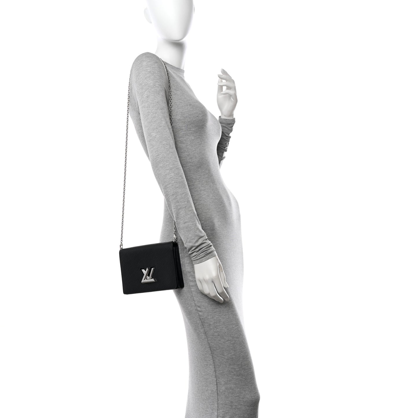 This is an authentic LOUIS VUITTON Epi Twist Belt Chain Wallet in Black. This stylish waist-length crossbody bag is crafted of textured epi leather in black. The chic bag features a polished gold chain shoulder strap and a polished gold LV twist lock on the facing flap. This opens to a black cross-grain leather and microfiber interior with a patch pocket, zipper compartment, and card slots.Follow this item for alerts. Louis Vuitton is a registered trademark of Louis Vuitton. FASHIONPHILE is not affiliated with Louis Vuitton.
