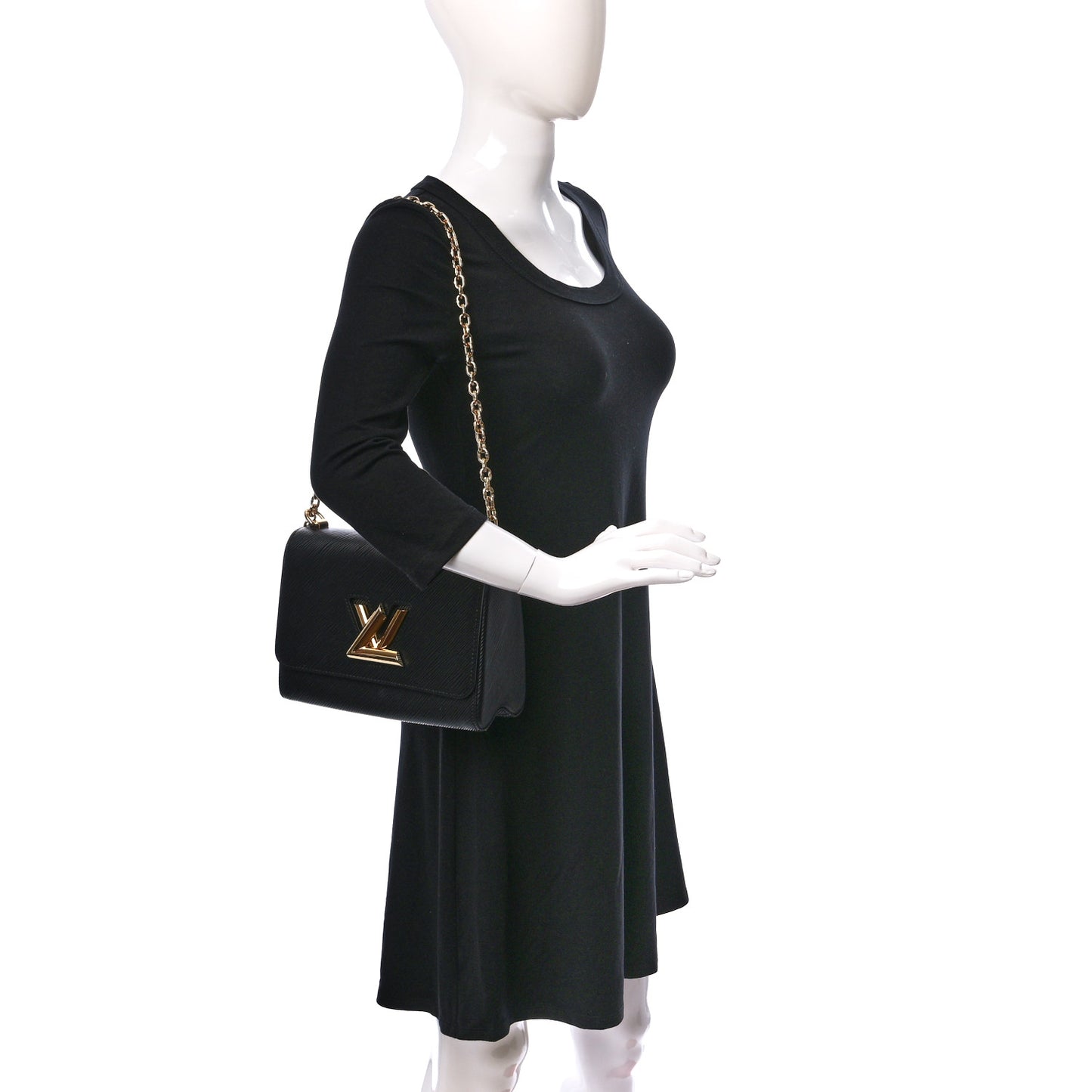 This is an authentic LOUIS VUITTON Epi Twist Shoulder Bag MM in Matte Black and Gold. This sleek handbag is crafted of textured epi leather in black and features matte black hardware, including a large LV twist lock on the front flap. It has a black leathered gold chain-link top handle a with a leather shoulder pad. The bag opens to a black microfiber interior with a patch pocket and an epi leather pocket for the mirror.Follow this item for alerts. Louis Vuitton is a registered trademark of Louis Vuitton. FASHIONPHILE is not affiliated with Louis Vuitton.