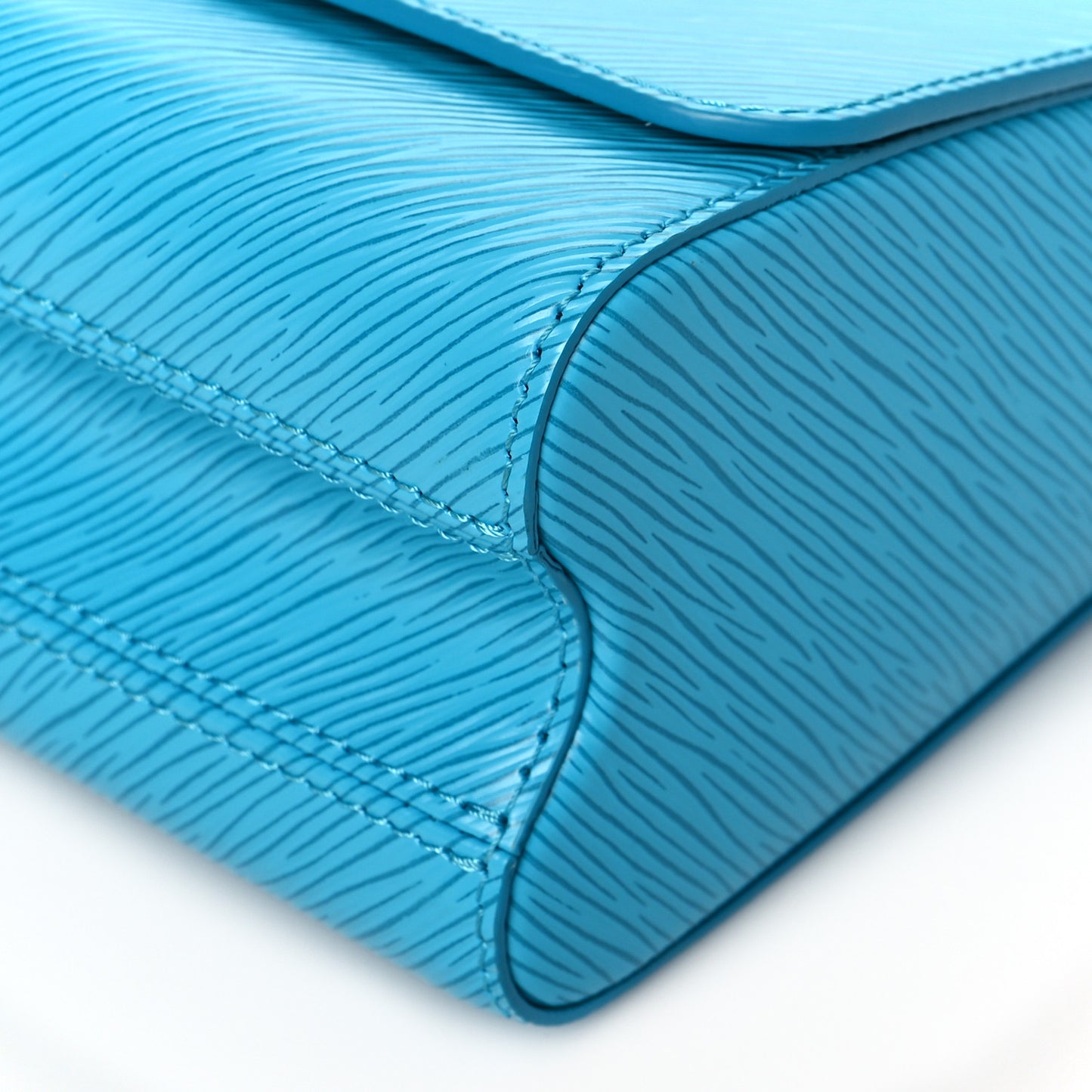 This is an authentic LOUIS VUITTON Epi Twist Shoulder Bag MM in Turquoise. This stylish waist-length crossbody shoulder bag is crafted of textured blue epi leather. The bag features a bold polished gold LV on the facing flap. This opens to a brown microfiber interior with a small patch pocket.