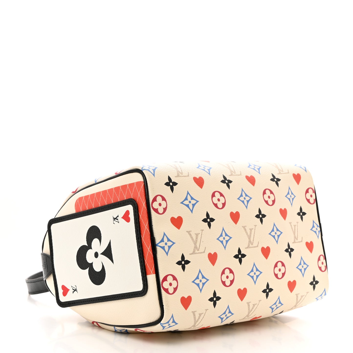 This is an authentic LOUIS VUITTON Game On Speedy Bandouliere 25 in White. This stylish tote is part of the Cruise 2021 Collection, and plays with Louis Vuitton’s iconic motif, mingling Monogram symbols with the four suits of a deck of cards. The bag features black leather trim including rolled top handles, and an optional shoulder strap with polished gold hardware. The top zipper opens to a black microfiber interior with a zipper pocket.Follow this item for alerts. Louis Vuitton is a registered trademark of Louis Vuitton. FASHIONPHILE is not affiliated with Louis Vuitton.